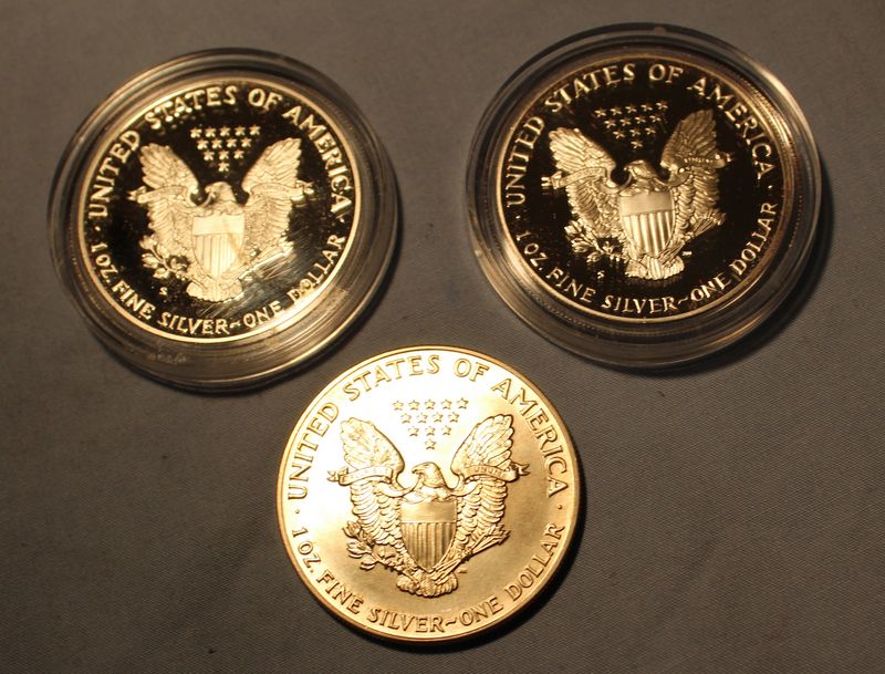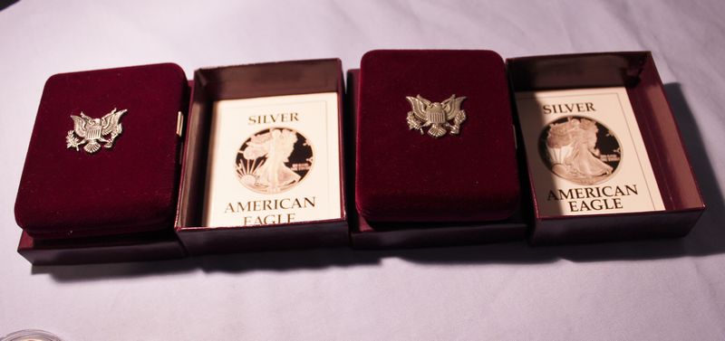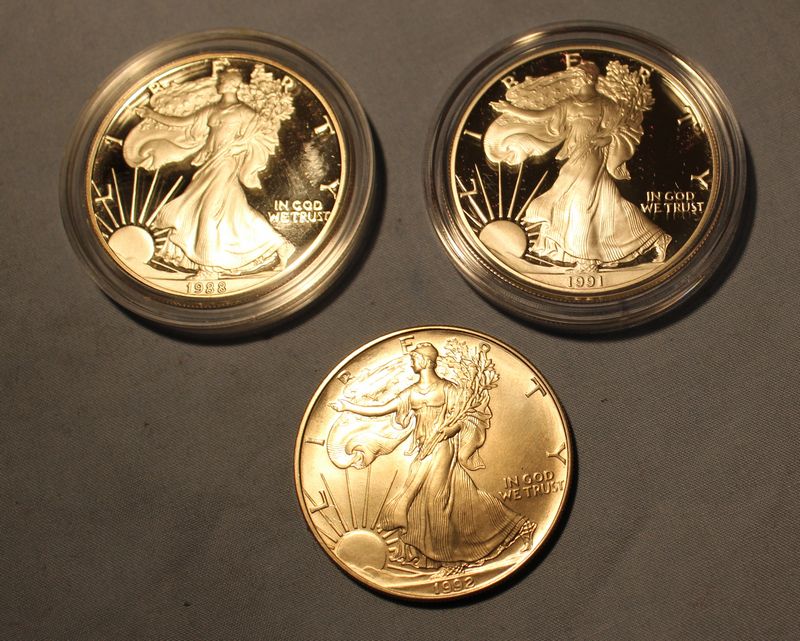 Three American Eagle One Ounce Proof Silver Bullion Coins including 1988, 1991 & 1992 (two with boxes, cases and COA's). Shipping is available for this item.