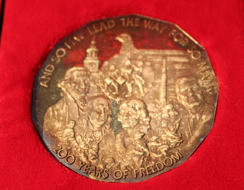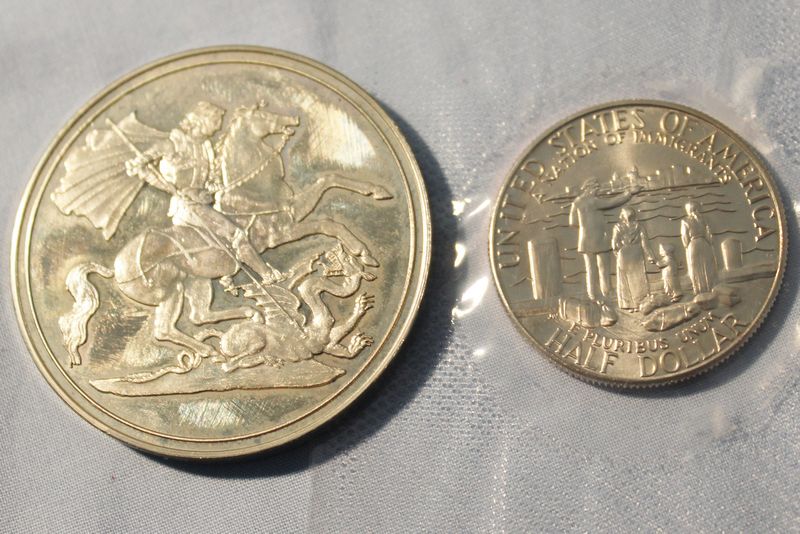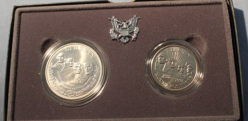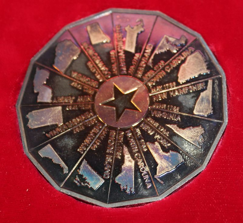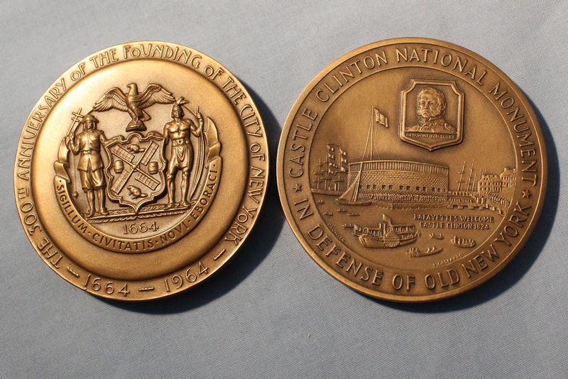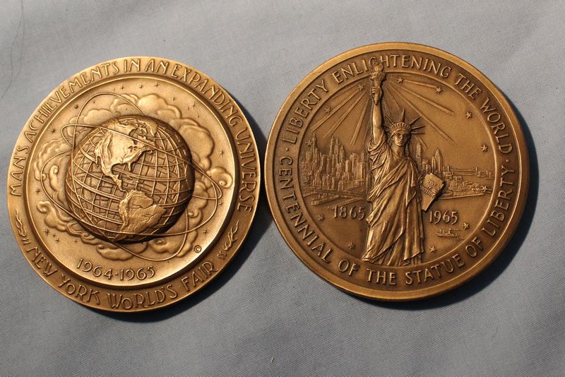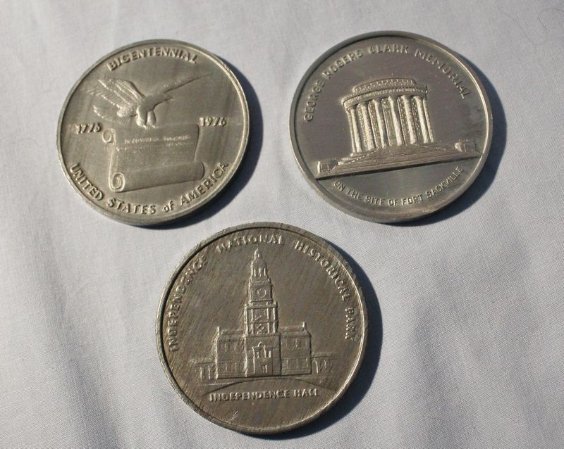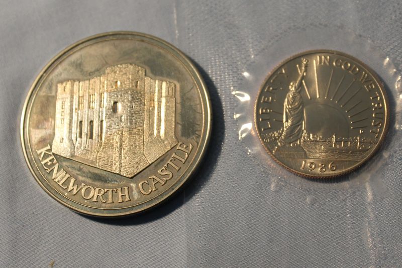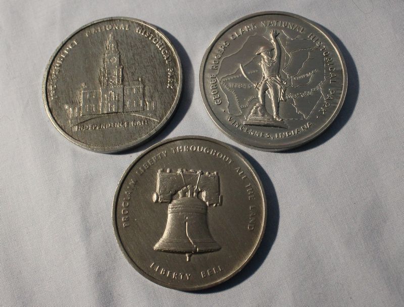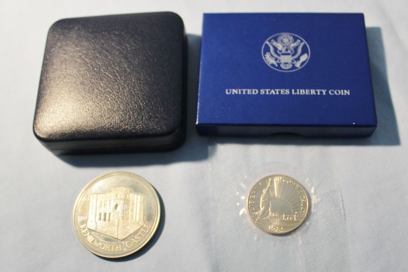Coins and medallions including Mt. Rushmore clad dollar and half dollar coins; Hamilton Mint Mt. Rushmore 24kt electro gold plated medallion 2.5"W; 1964-1965 NY World's Fair bronze Expanding Universe medallion 2.5"W; 1965 bronze Statue of Liberty Centennial medallion (Castle Clinton verso) 2.5"W; three 2"W pewter medallions for Liberty Bell, Independence Hall and George Rogers Clark National Historical Park; 1964 Fairfield County Trust bronze medallion 3"W. Also included in this lot is a Kenilworth Castle nickel silver medallion 2"W and 1986 United States Liberty half dollar (copper nickel). Shipping is available for this item.
