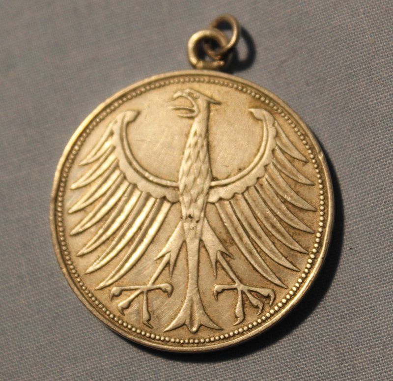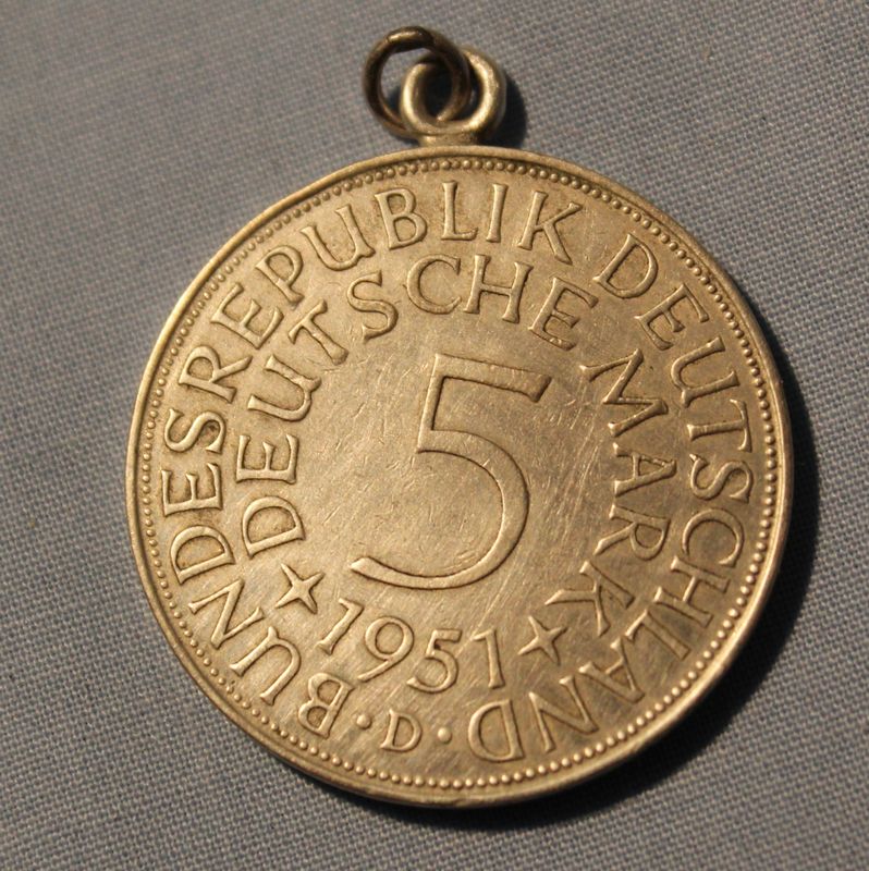 1939 German Iron Cross pin 1.75"W; 1951 "D" German silver 5 Deutschmark coin (converted to a pendant). Shipping is available for this item.