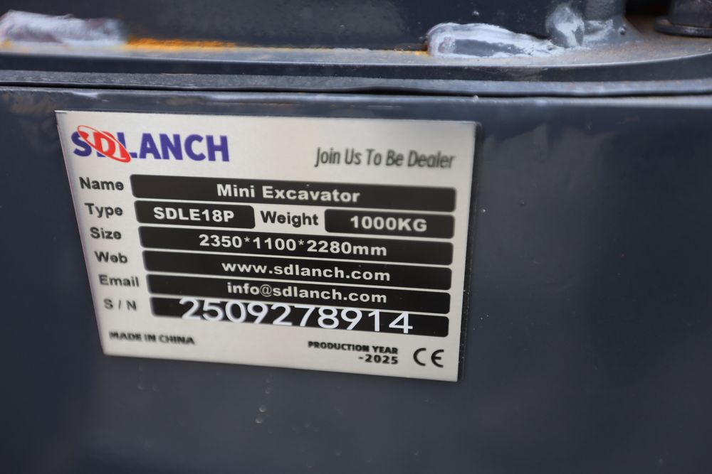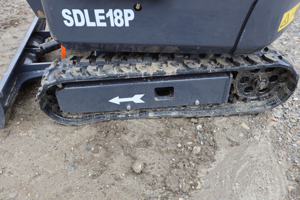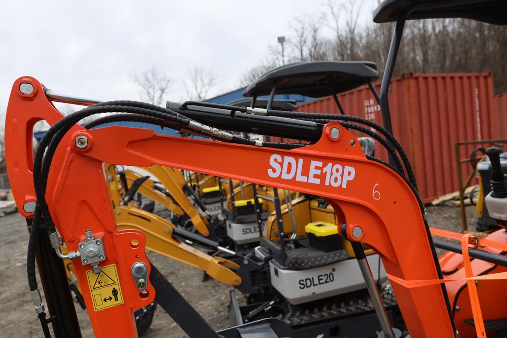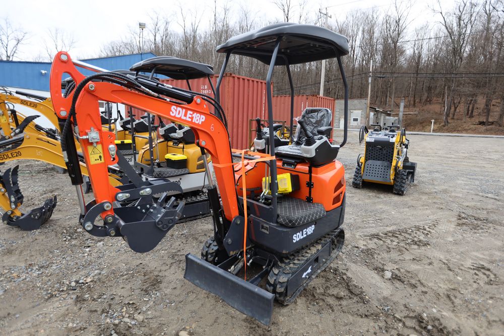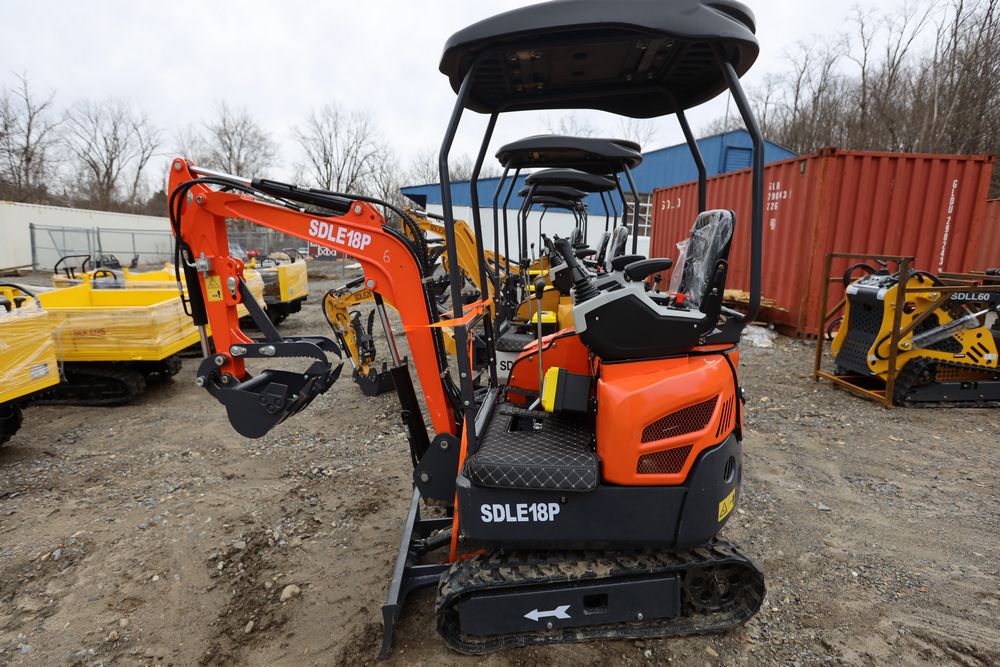 New 2025 mini excavator model SDLE18P with bucket, thumb, and RATO 420 gas engine. Hours reading less than 1 hour.
