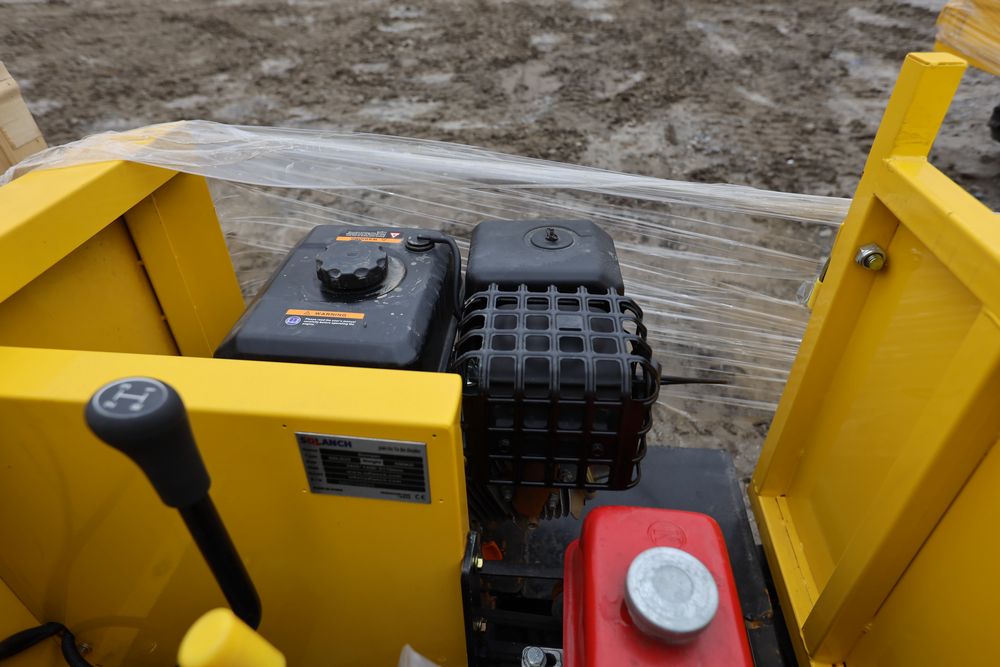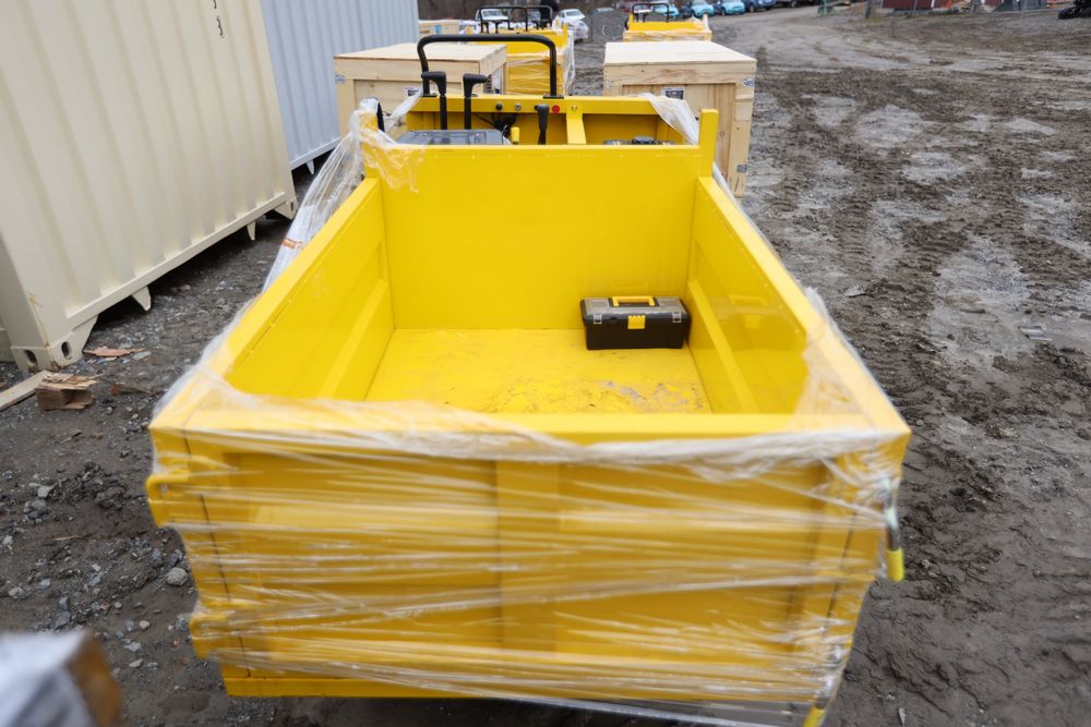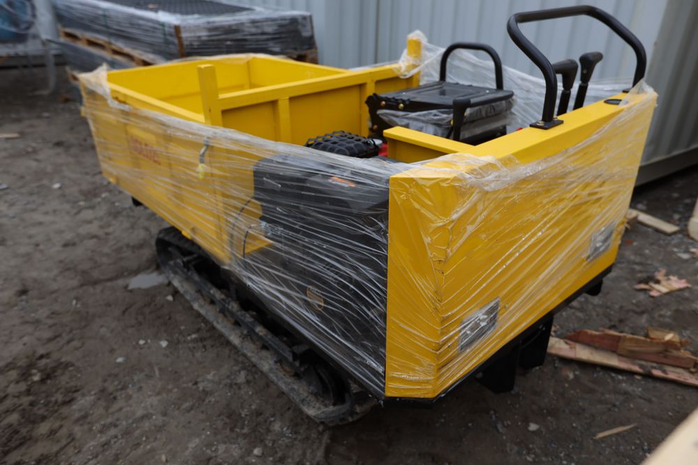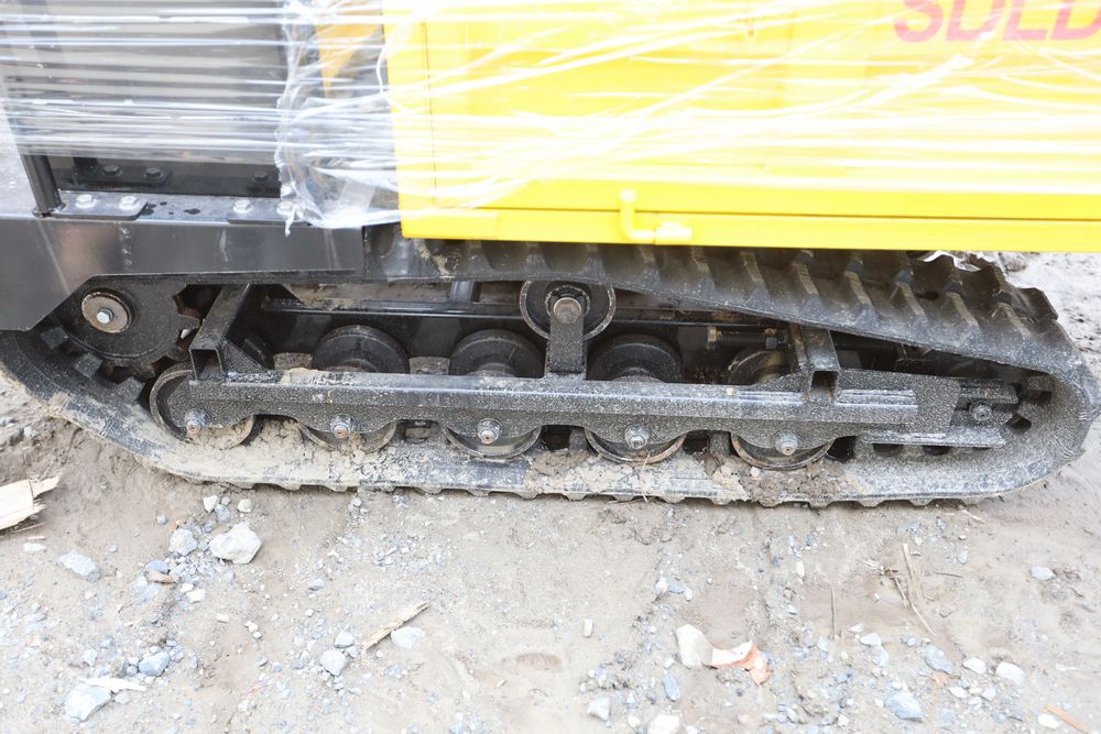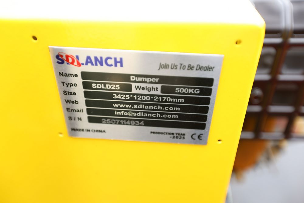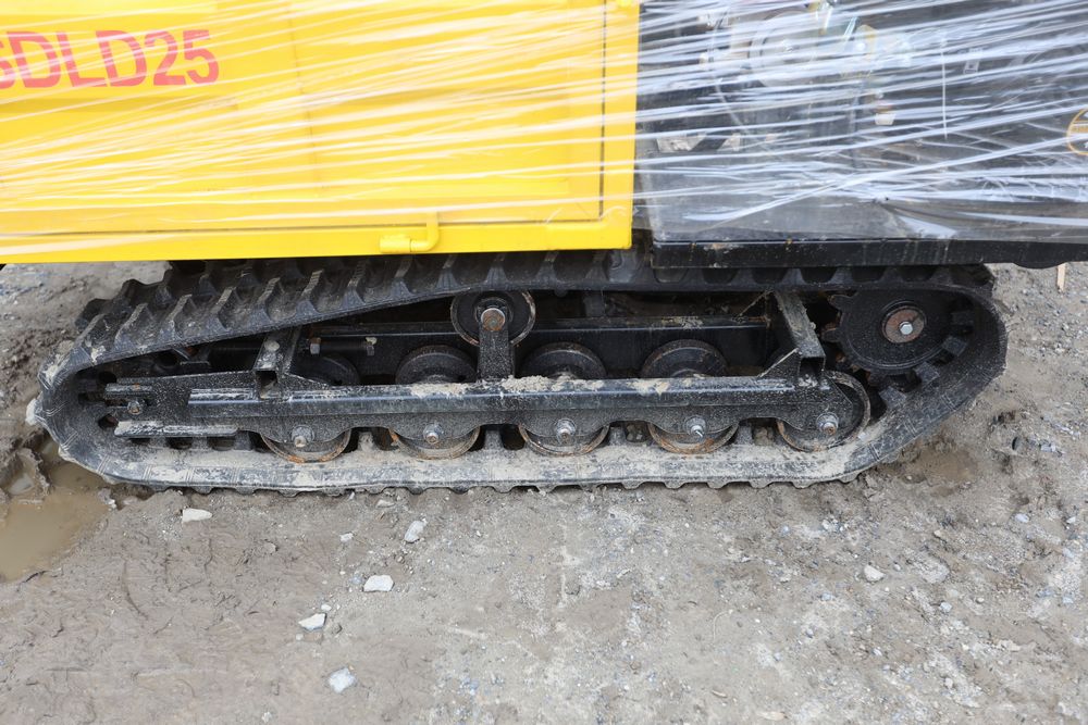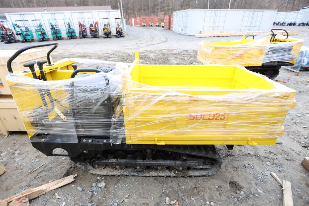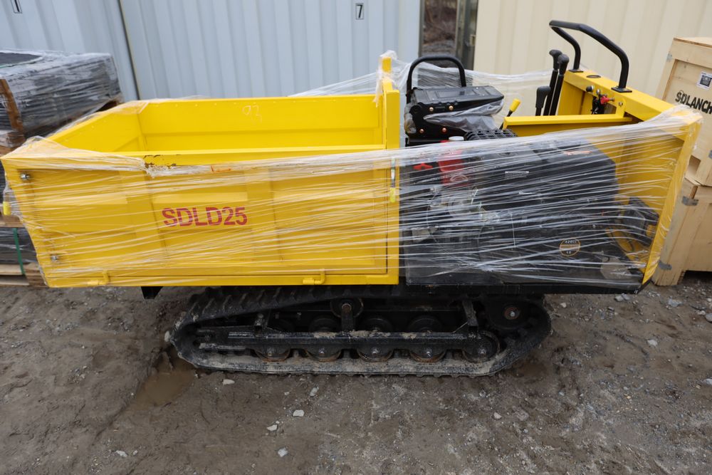New 2025 tracked dumper model SDLD25 with a high-sided yellow steel cargo bed and rear-mounted engine. Features a single-operator seat with control levers, and rubber tracks for enhanced mobility on rough terrain.