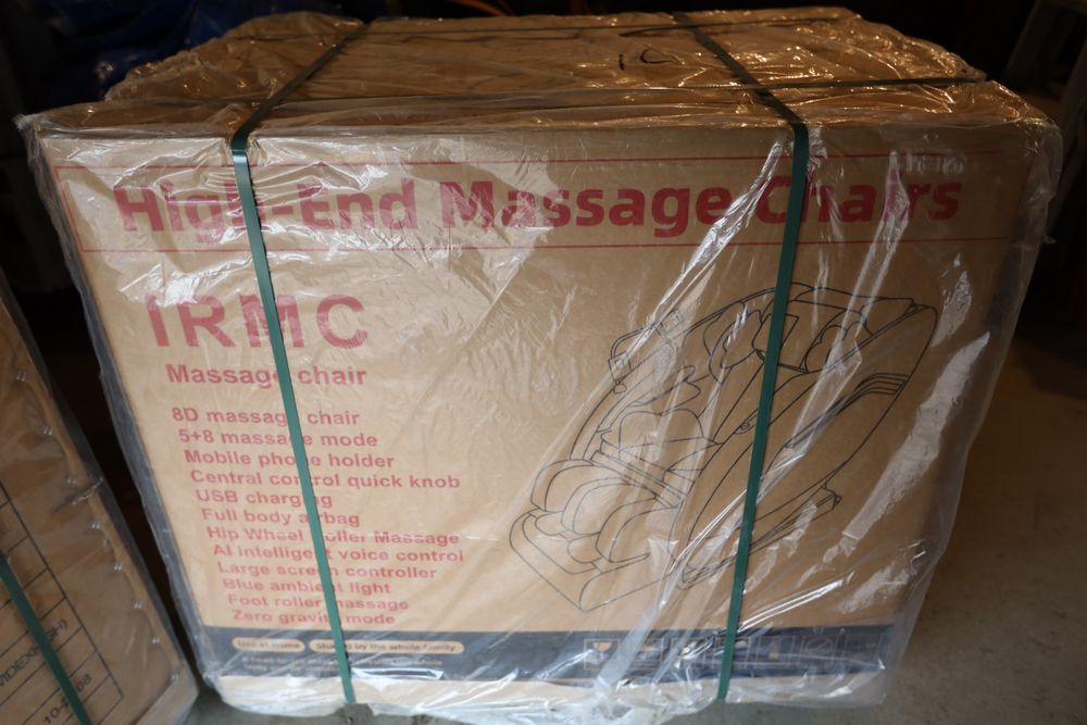 New 2025 IRMC high-end massage chair in retail packaging features like intelligent voice control, foot roller massage, zero-gravity mode, extended roller and airbag massage zones for head-to-toe coverage. New in box.