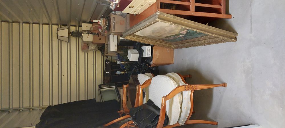 Contents of a 10' x 5' storage unit being sold by the storage unit owner. This storage unit contains collectibles, decor items, vintage brass table lamps with marble bases, table lamps, Zenith portable television, upholstered carved wood armchairs, mixed porcelain china and serving pieces, etched glass bowl, vintage copper molds, large costume jewelry collection, glass cruet/condiment set with stand, luggage, duffel bag, vintage mink/lamb fur coat, silverplate flatware set in presentation case, assorted decorative household items, Samsonite leather briefcase, photography/video lighting equipment, collectible dolls, assorted women's footwear, men’s neckties, cloths, large framed landscape oil on canvas painting in gilt-style frame, wool blankets and much more. Items are located in Elmsford, NY.