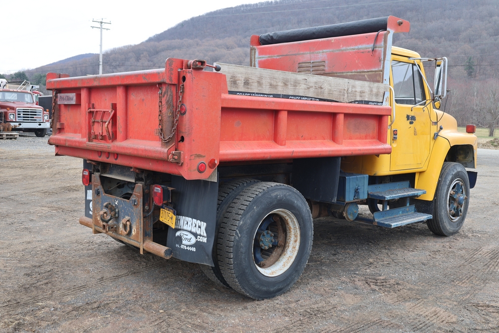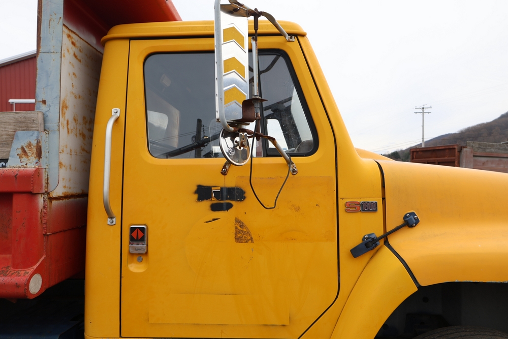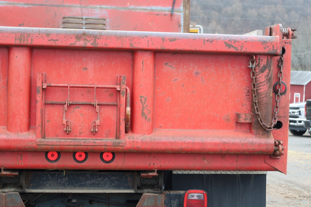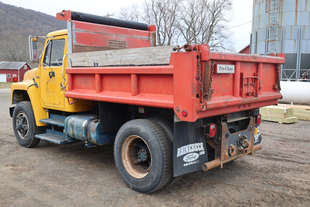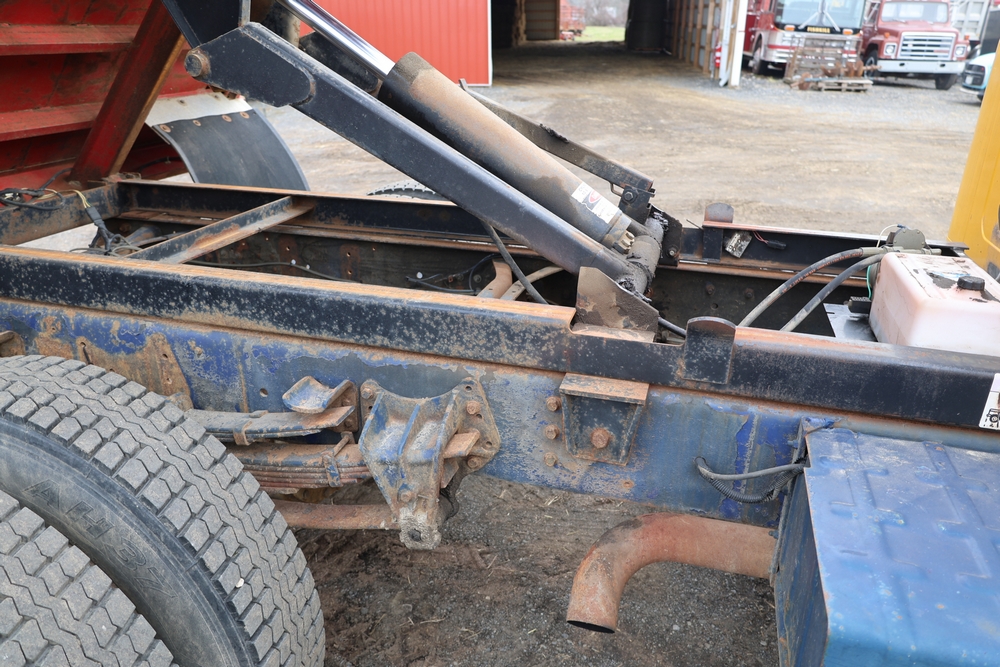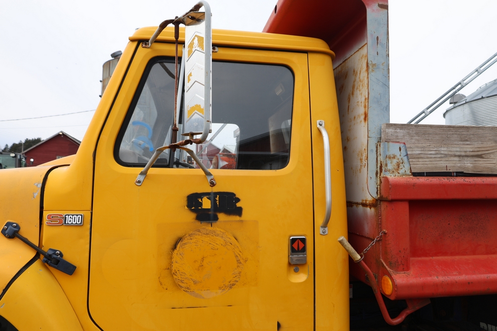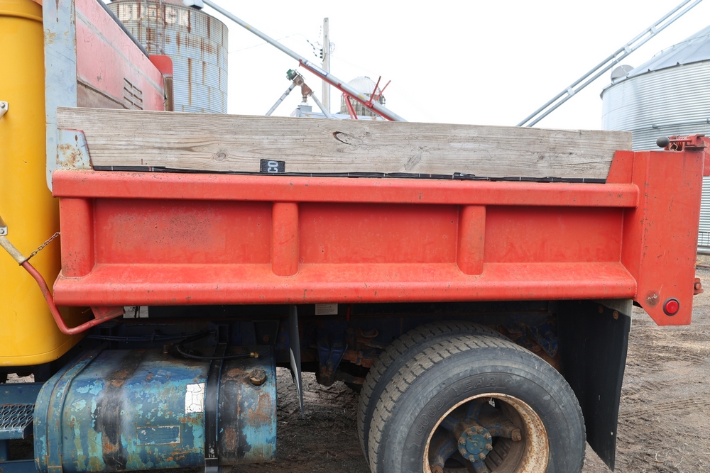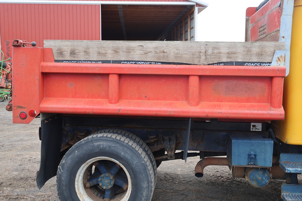 1989 International 1654 with a 7.3L V8 diesel engine. VIN: 1HTLAZP77KH616140. Odometer reading: 184697. Body: electric dump bed. Yellow cab, red dump bed with Pro-Class marking, dual rear wheels, manual transmission, bench seat, amber cab light, side mirrors, step plates, fuel tank mounted along frame, rear hitch, control box mounted inside cab, wood side boards on dump bed. Runs and drives. Title and key available.
