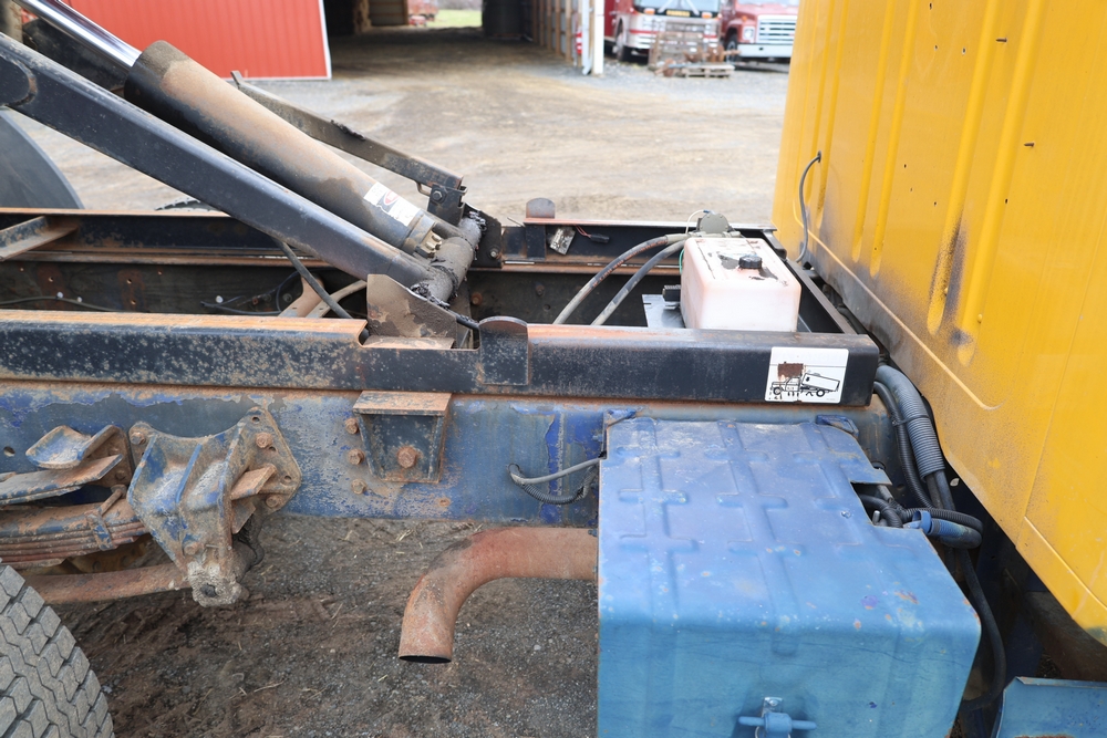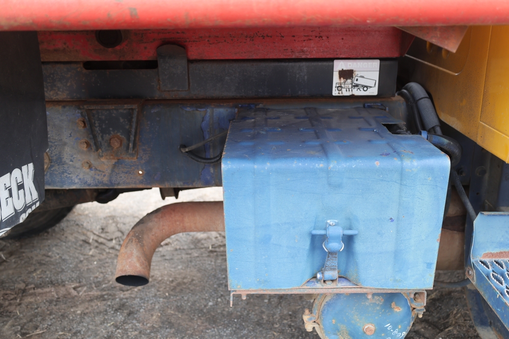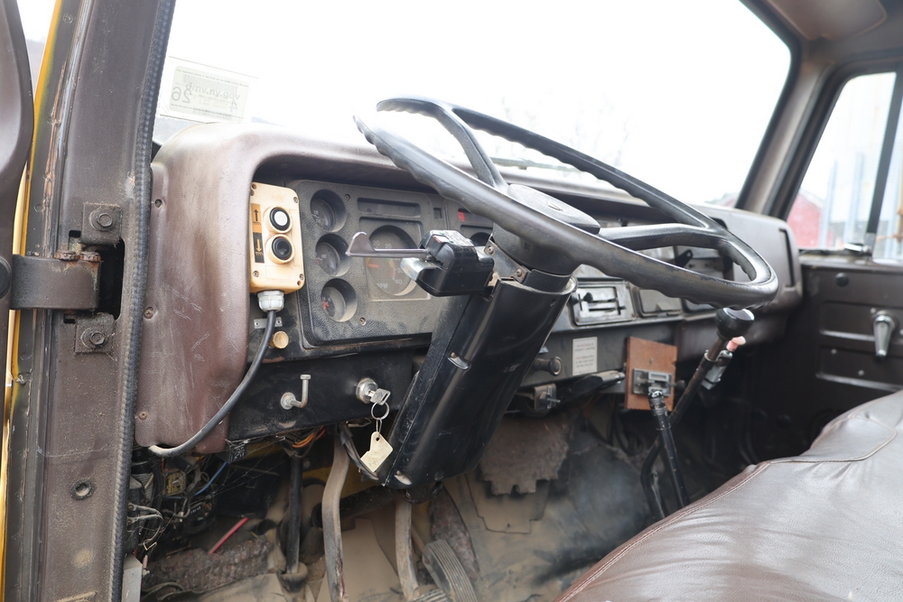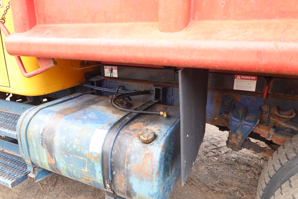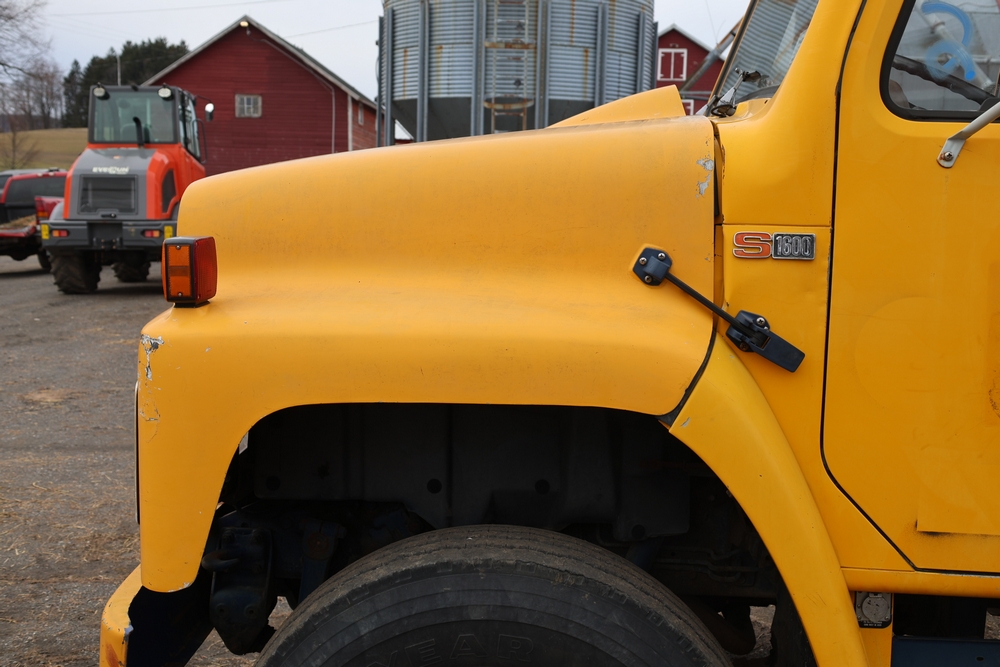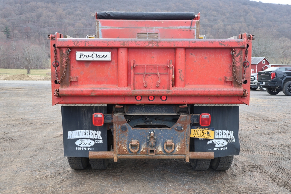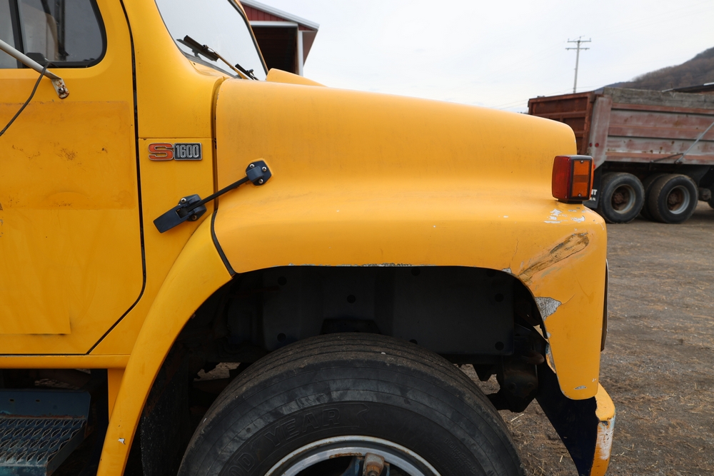 1989 International 1654 with a 7.3L V8 diesel engine. VIN: 1HTLAZP77KH616140. Odometer reading: 184697. Body: electric dump bed. Yellow cab, red dump bed with Pro-Class marking, dual rear wheels, manual transmission, bench seat, amber cab light, side mirrors, step plates, fuel tank mounted along frame, rear hitch, control box mounted inside cab, wood side boards on dump bed. Runs and drives. Title and key available.