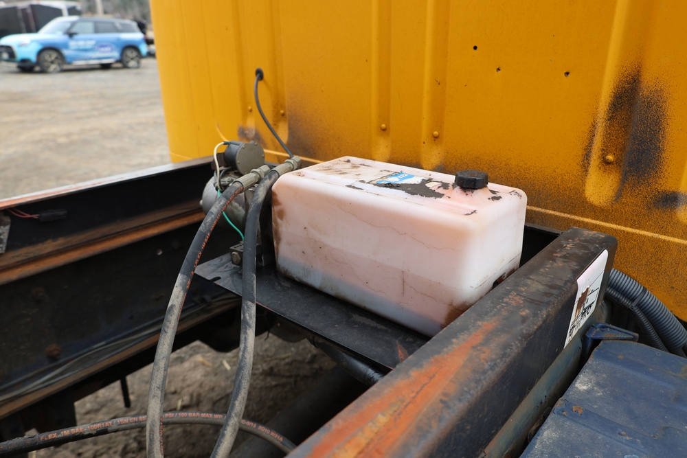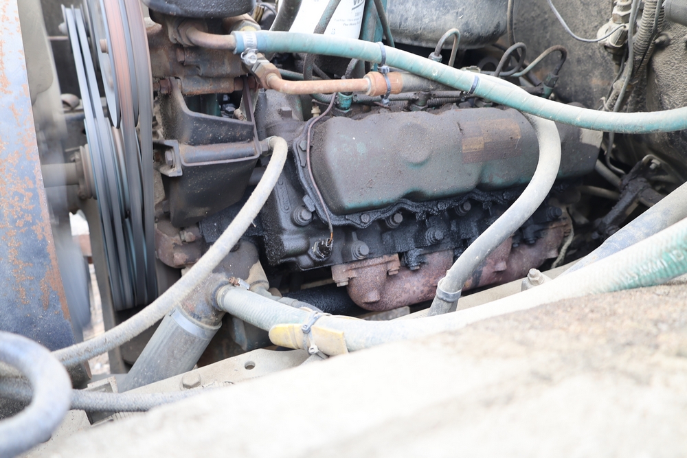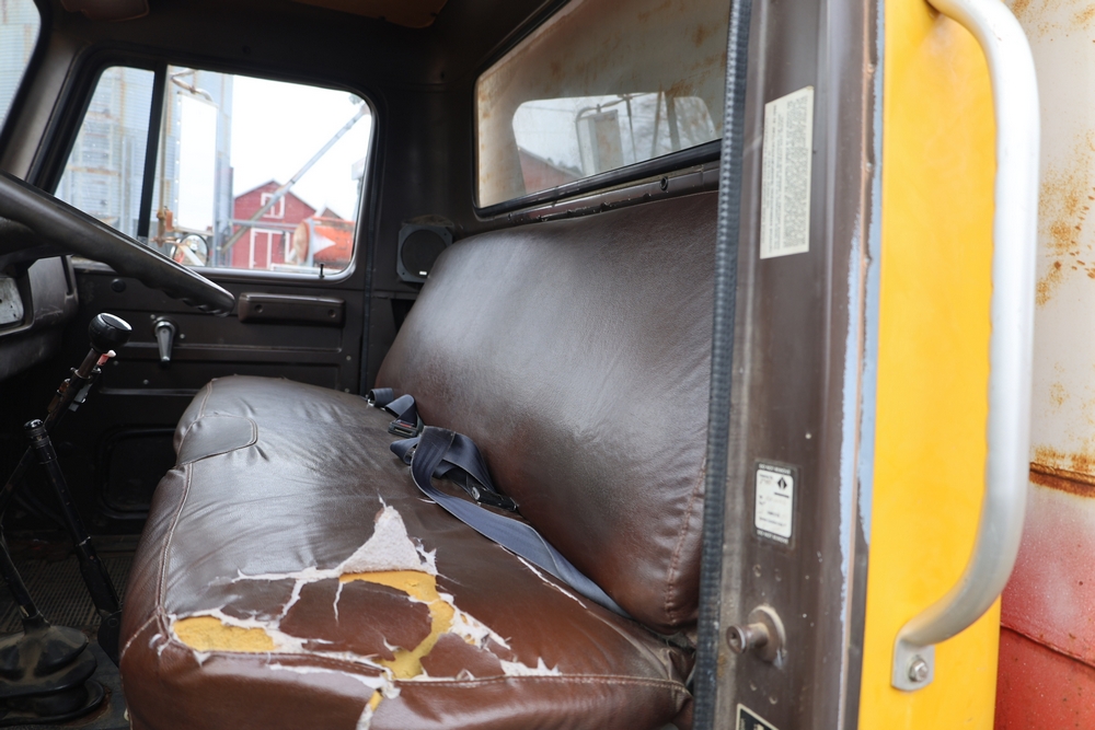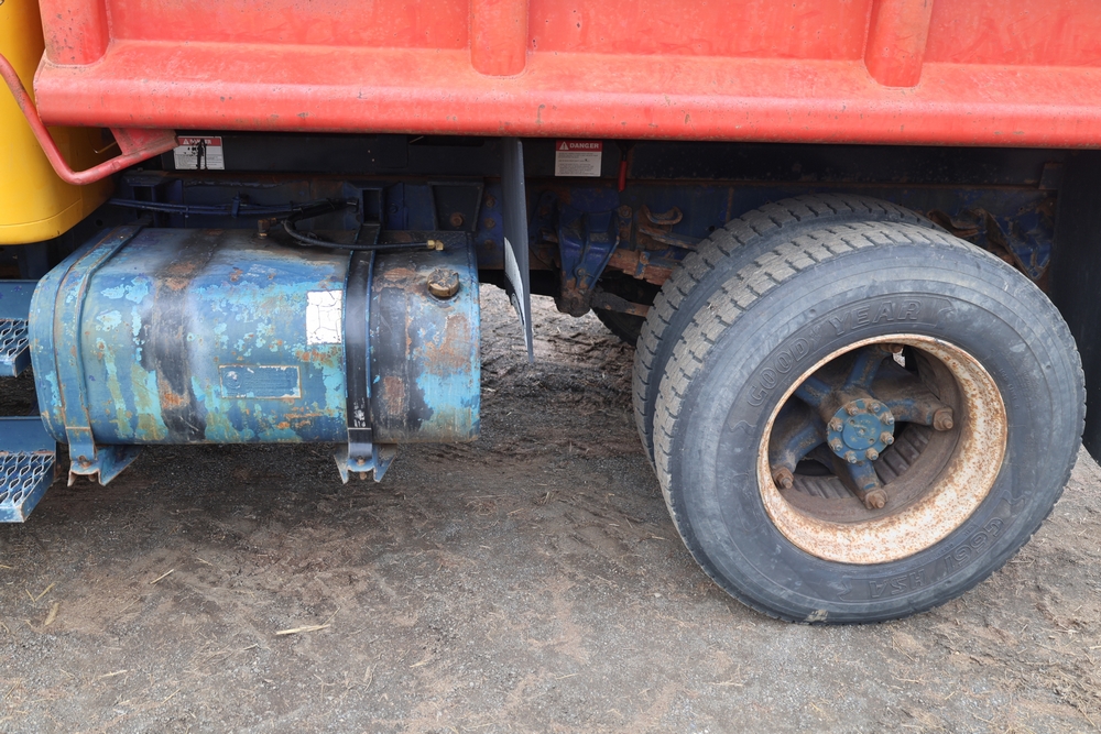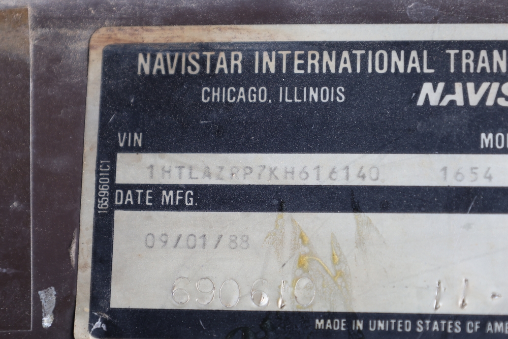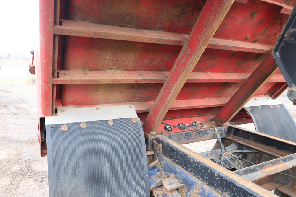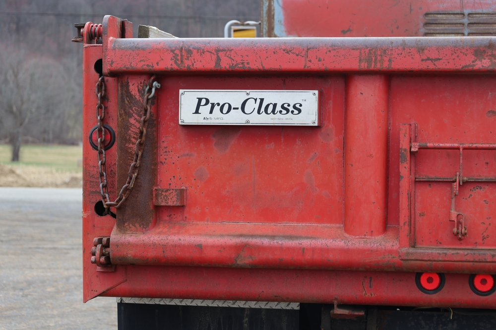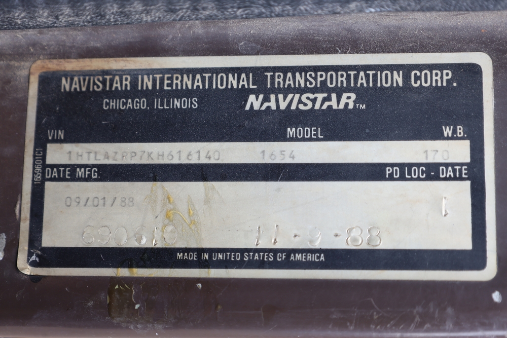 1989 International 1654 with a 7.3L V8 diesel engine. VIN: 1HTLAZP77KH616140. Odometer reading: 184697. Body: electric dump bed. Yellow cab, red dump bed with Pro-Class marking, dual rear wheels, manual transmission, bench seat, amber cab light, side mirrors, step plates, fuel tank mounted along frame, rear hitch, control box mounted inside cab, wood side boards on dump bed. Runs and drives. Title and key available.