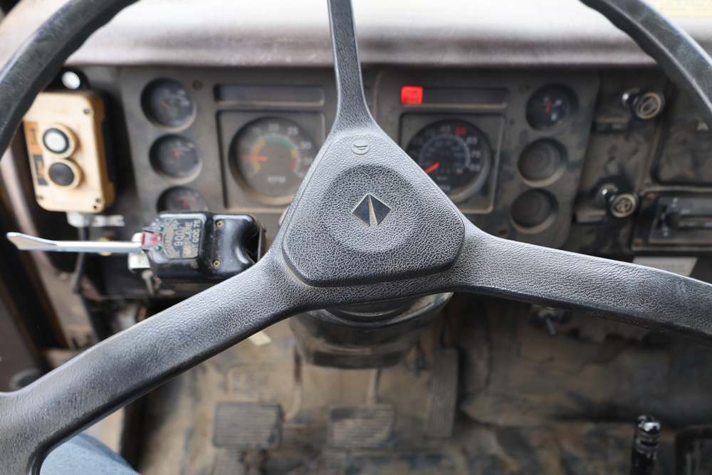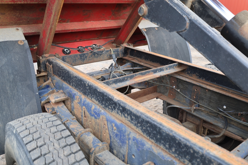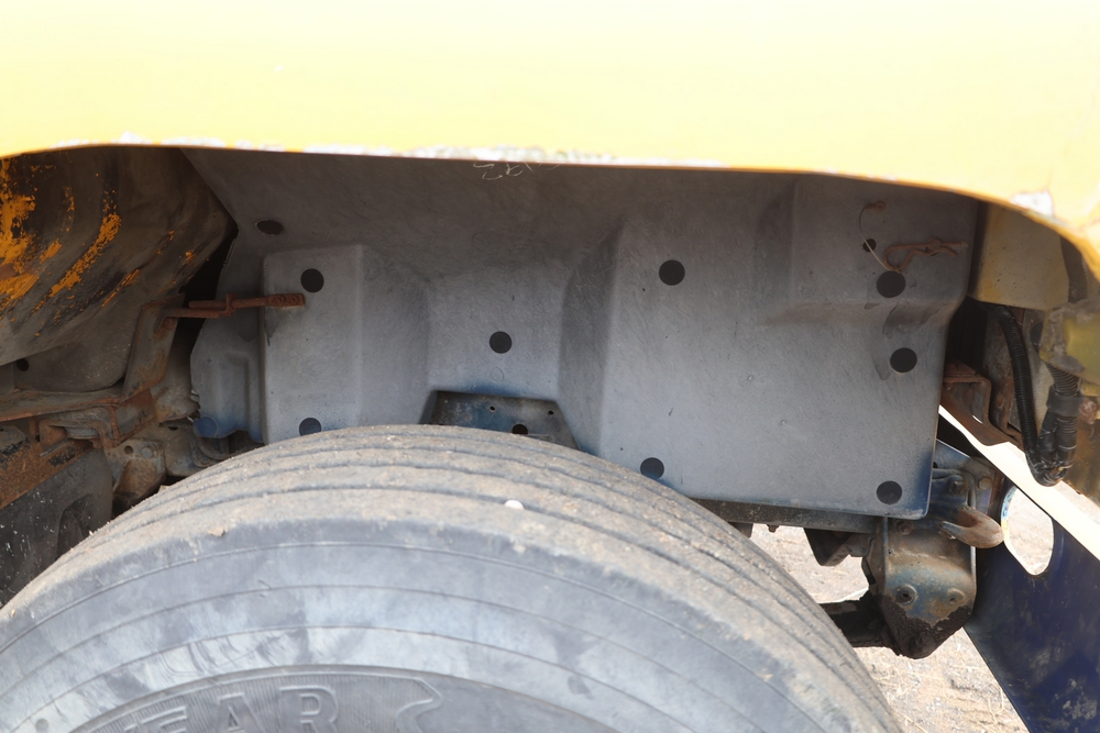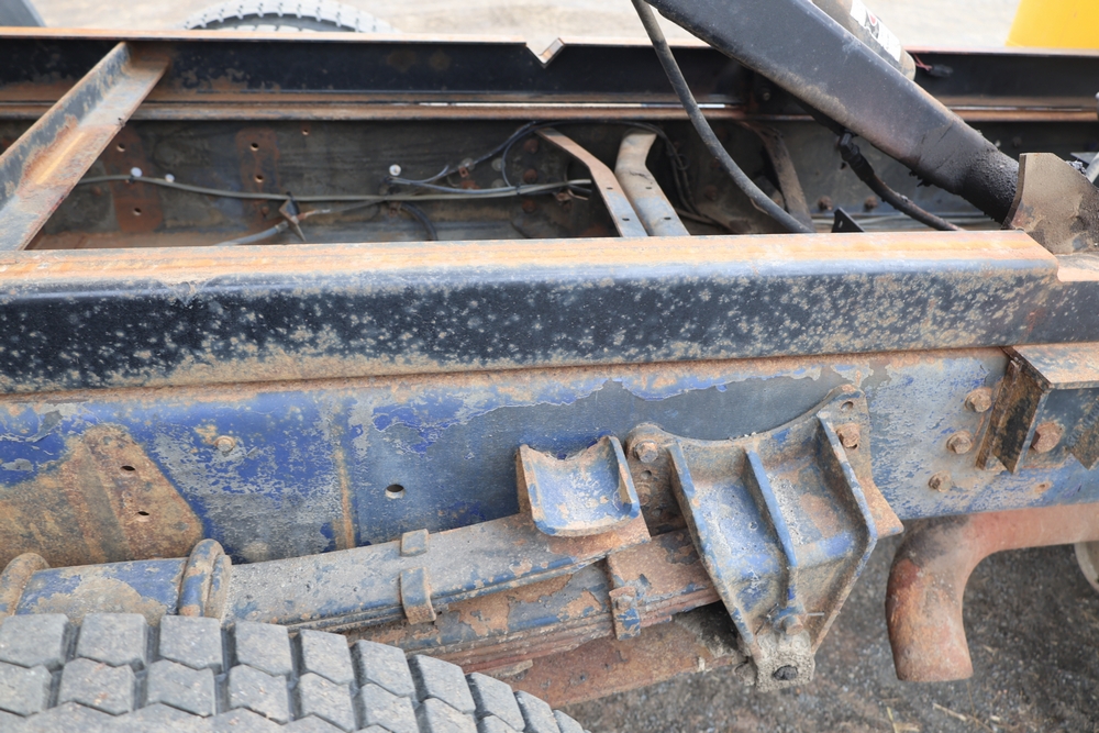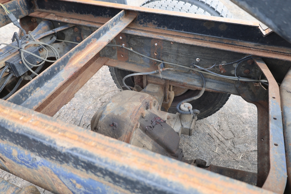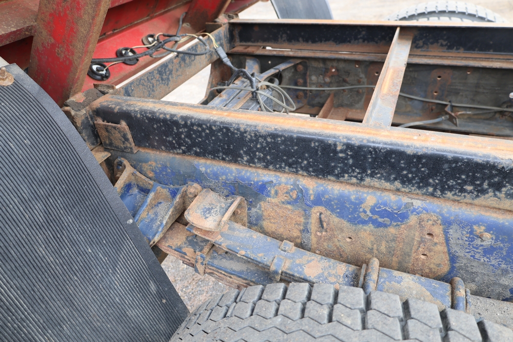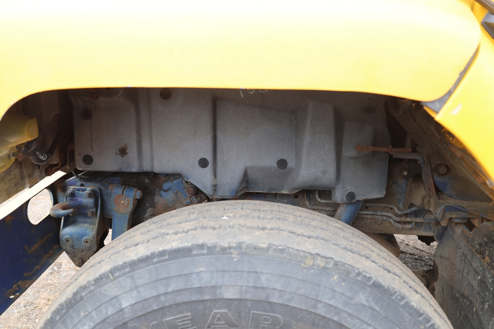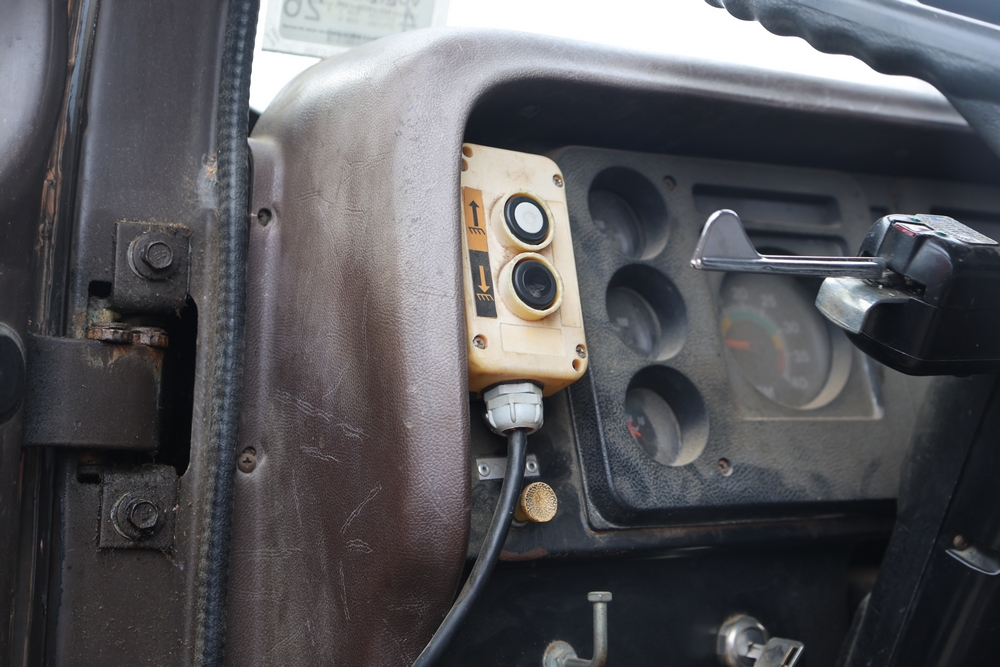 1989 International 1654 with a 7.3L V8 diesel engine. VIN: 1HTLAZP77KH616140. Odometer reading: 184697. Body: electric dump bed. Yellow cab, red dump bed with Pro-Class marking, dual rear wheels, manual transmission, bench seat, amber cab light, side mirrors, step plates, fuel tank mounted along frame, rear hitch, control box mounted inside cab, wood side boards on dump bed. Runs and drives. Title and key available.