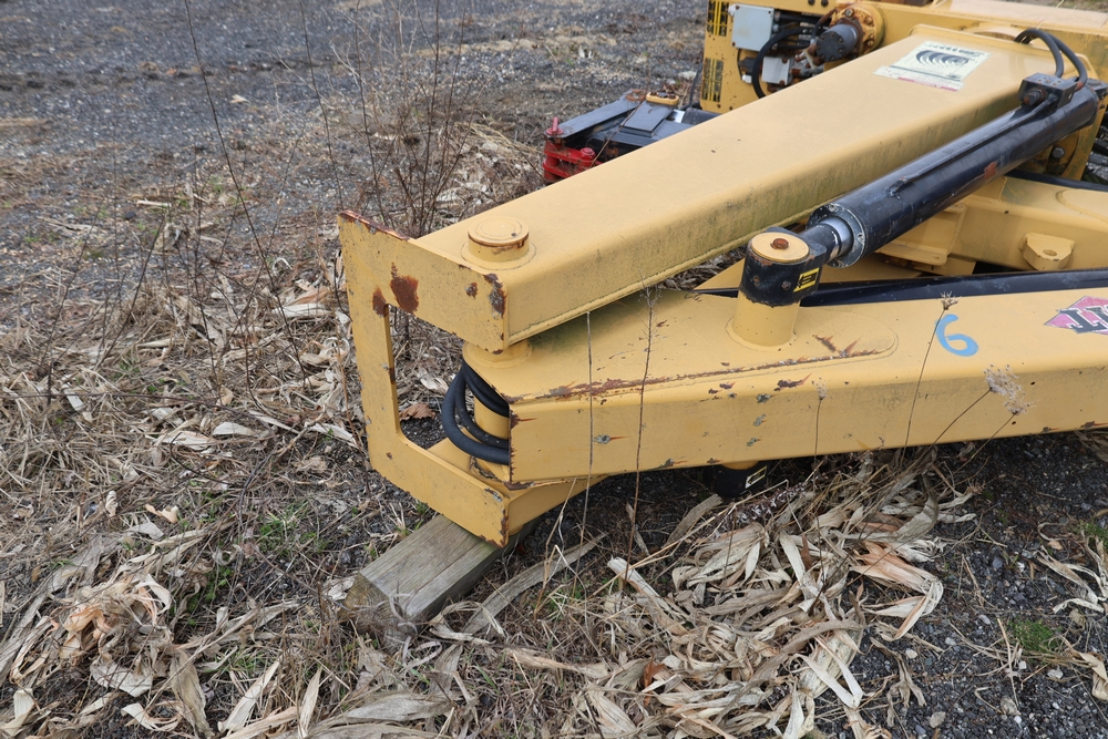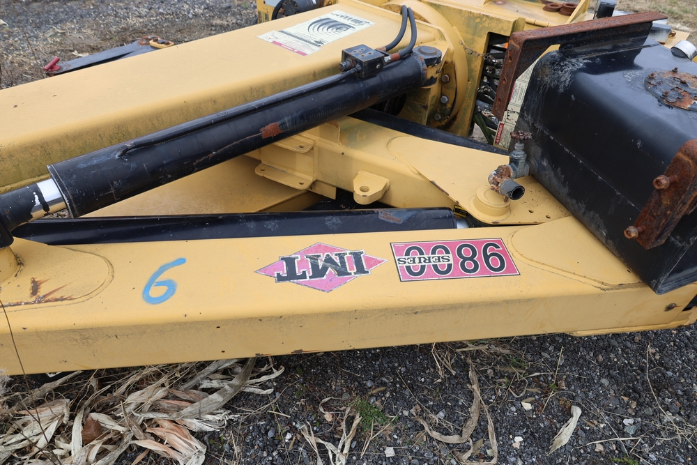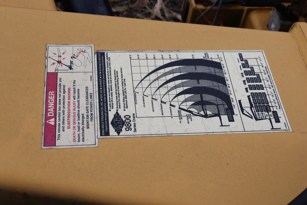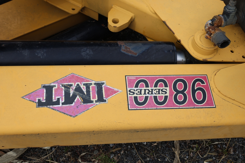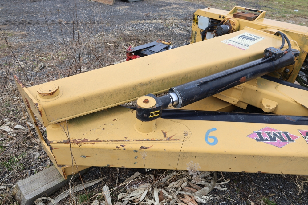 IMT 9800 Series crane attachment with hydraulic system, control valve bank with multiple levers, extendable boom sections, and mounting base frame, includes hydraulic lines and reservoir tank.