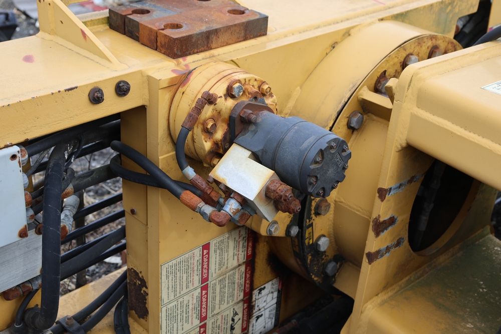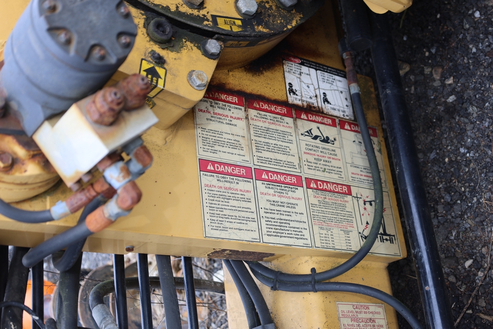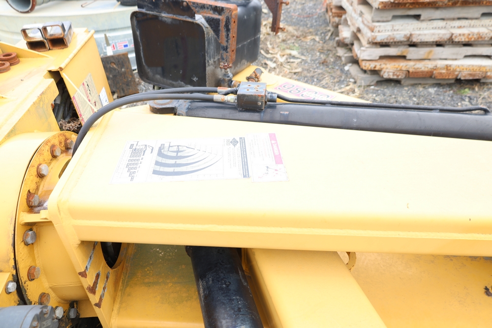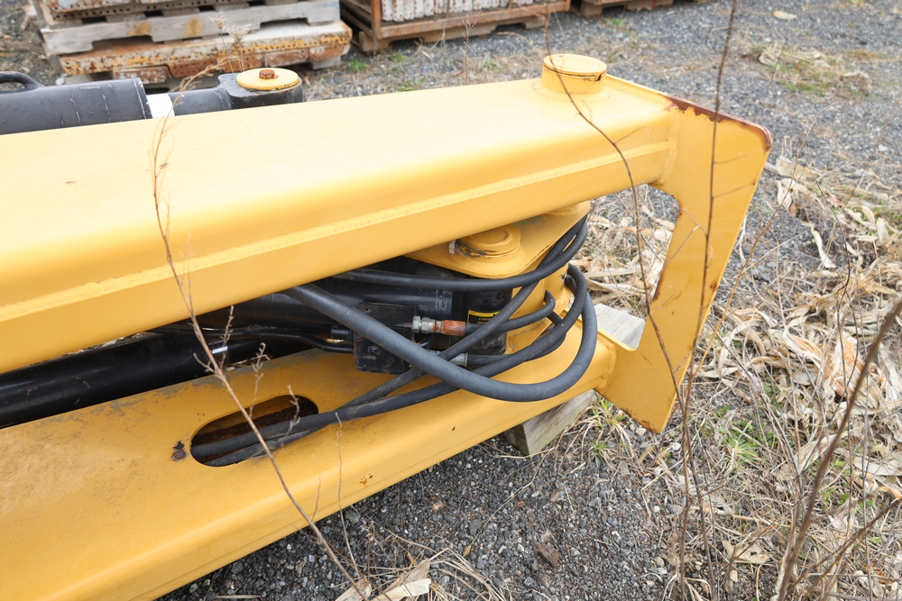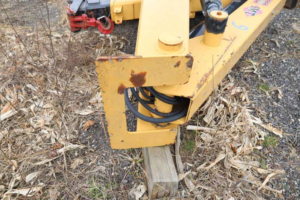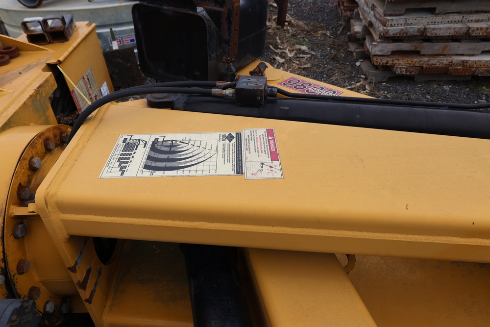 IMT 9800 Series crane attachment with hydraulic system, control valve bank with multiple levers, extendable boom sections, and mounting base frame, includes hydraulic lines and reservoir tank.