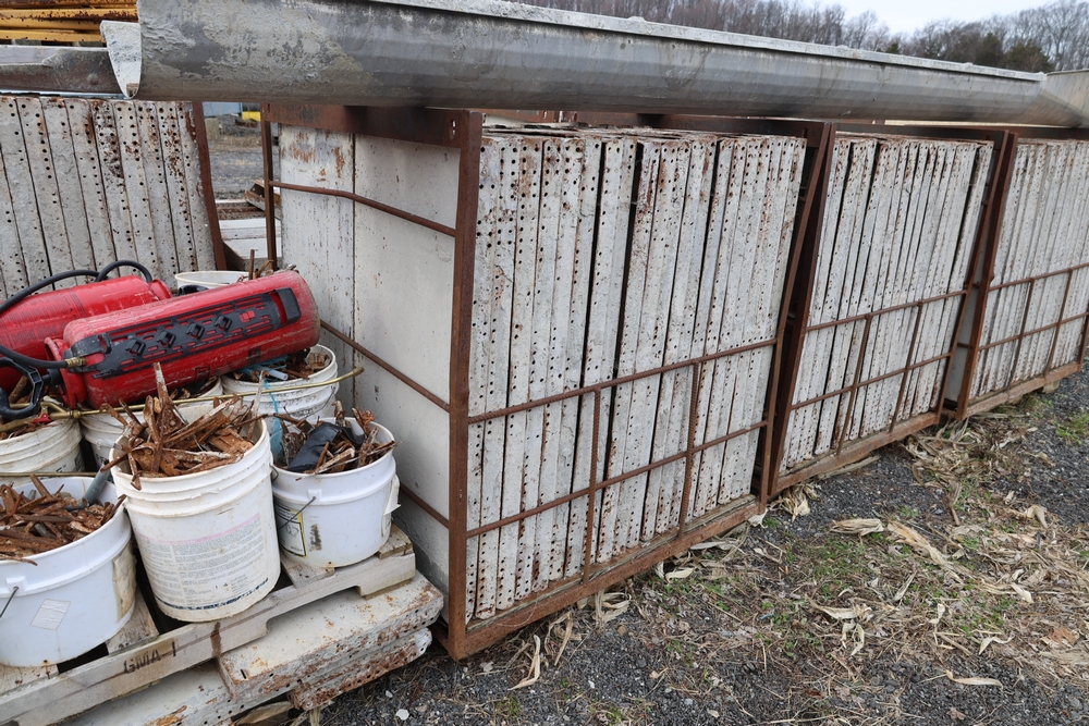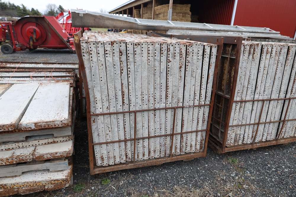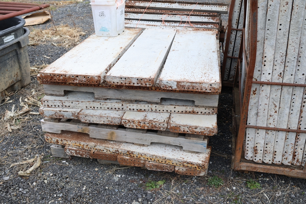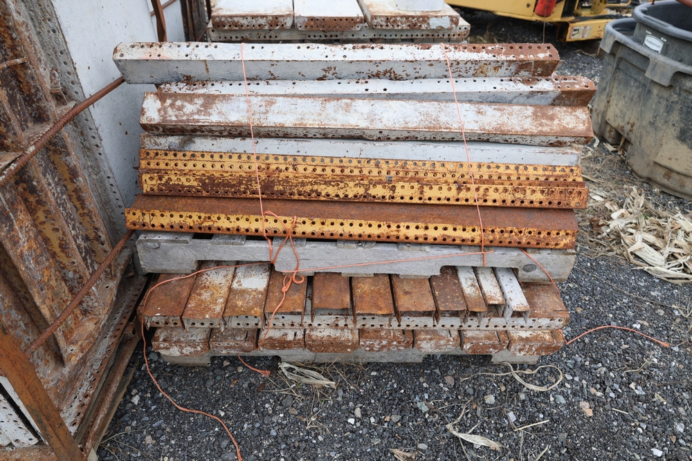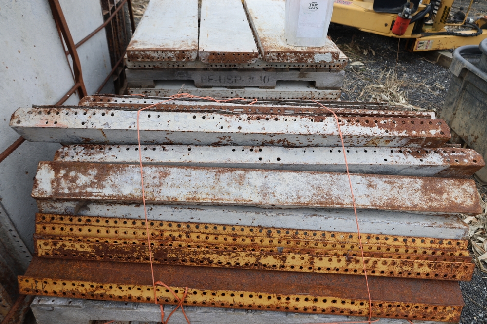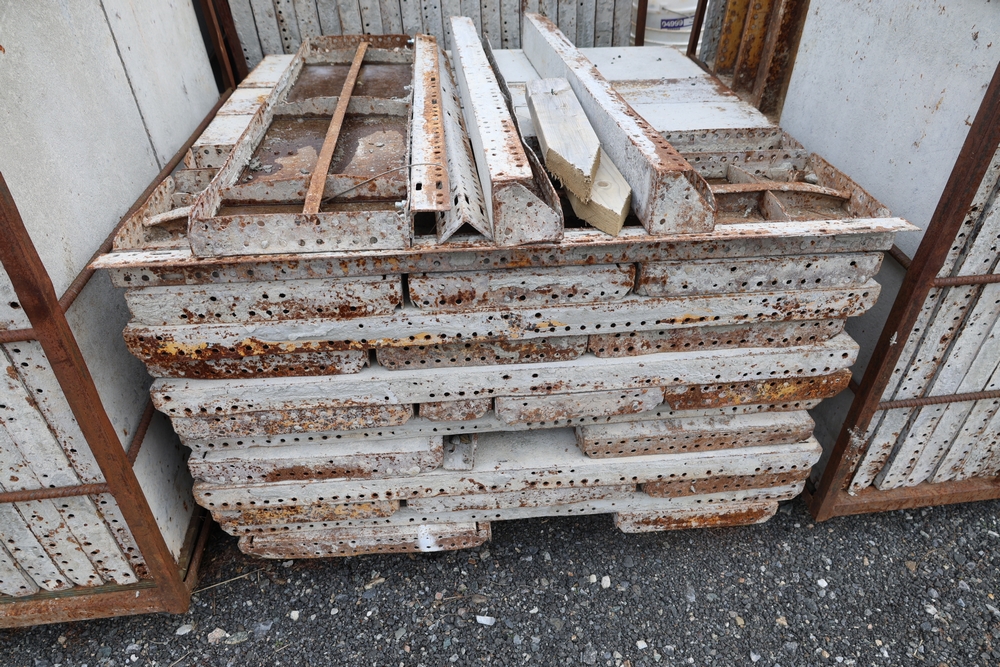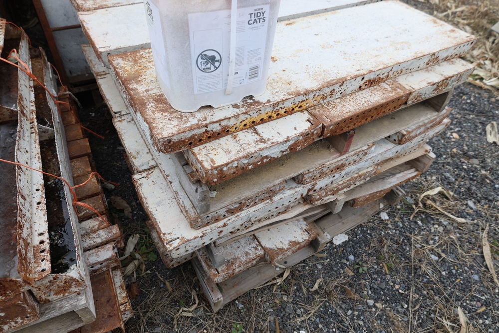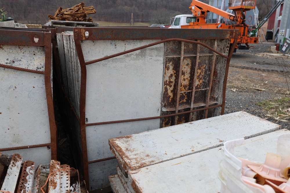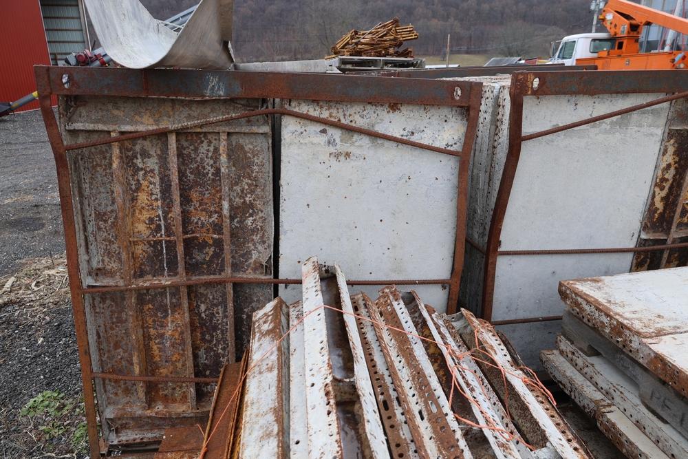 Concrete form supplies including IBC tote tank with metal cage and plastic pallet base containing liquid, includes multiple pallets of steel concrete forms and hardware, assorted metal brackets, buckets with fasteners, and two red portable heaters.