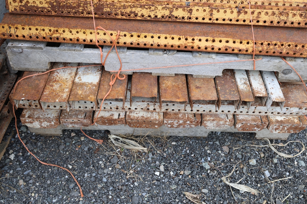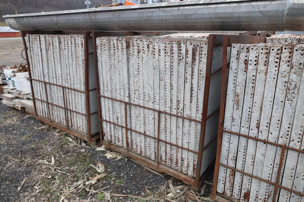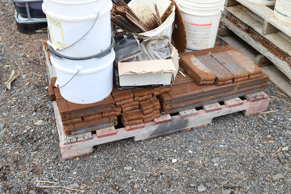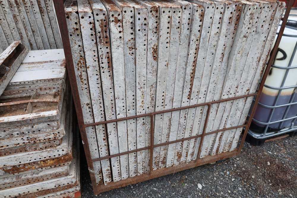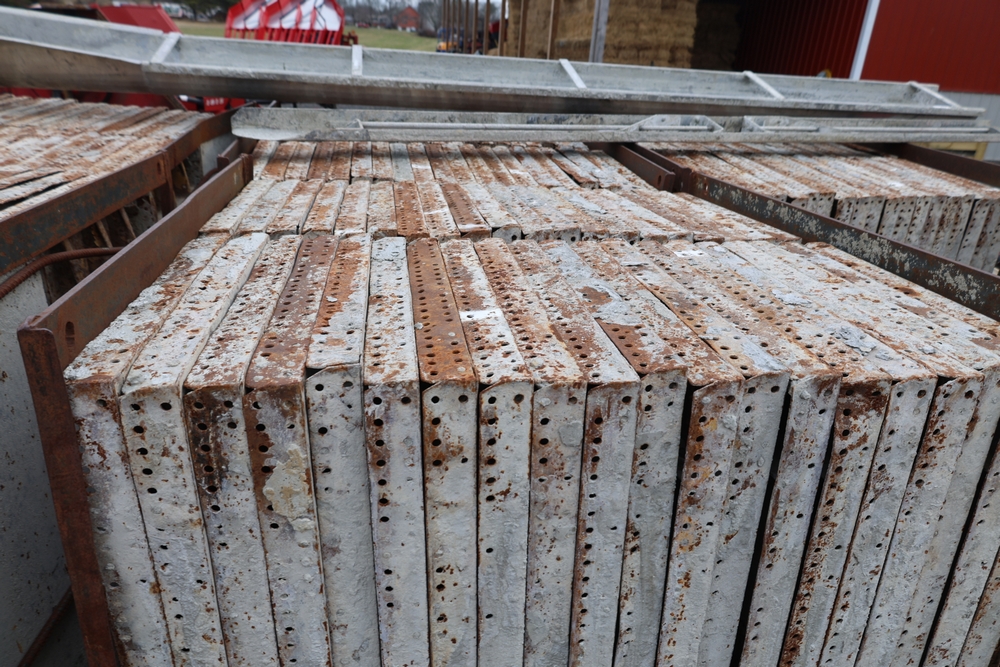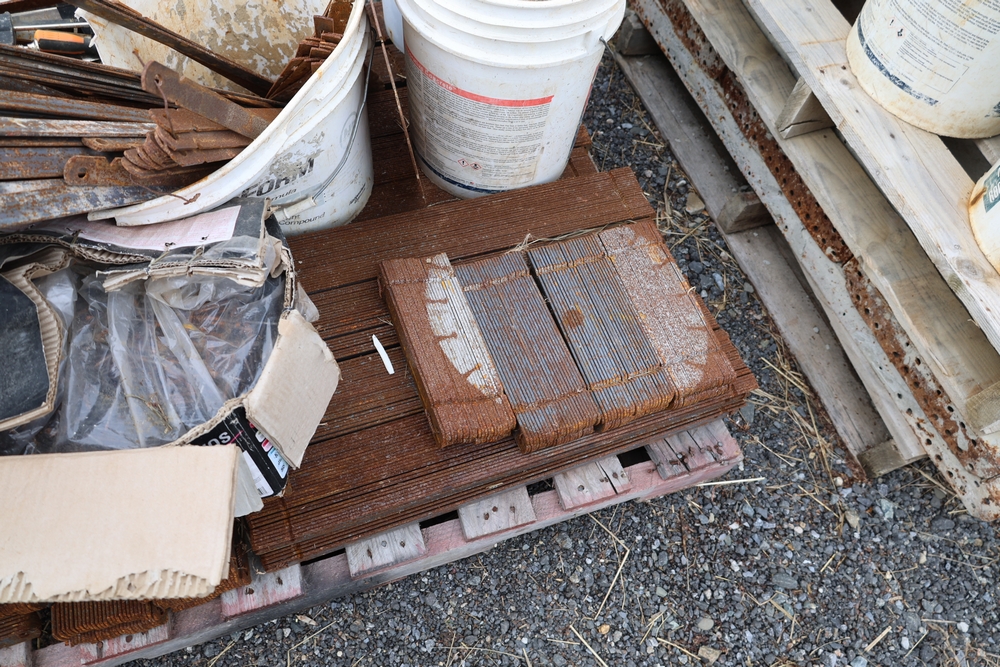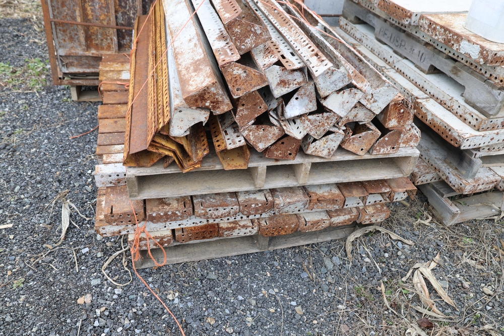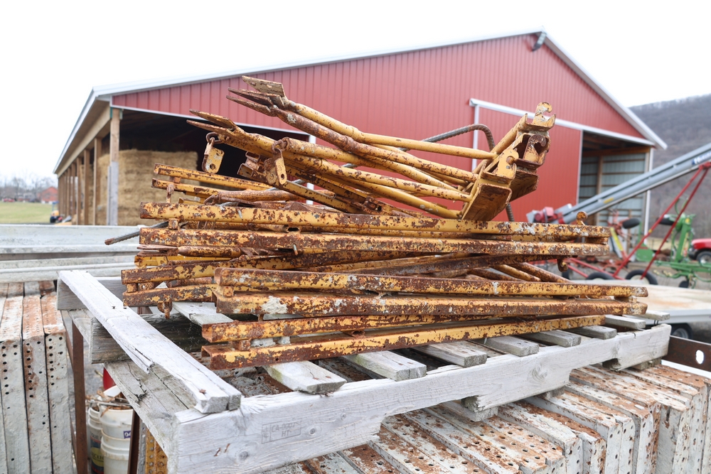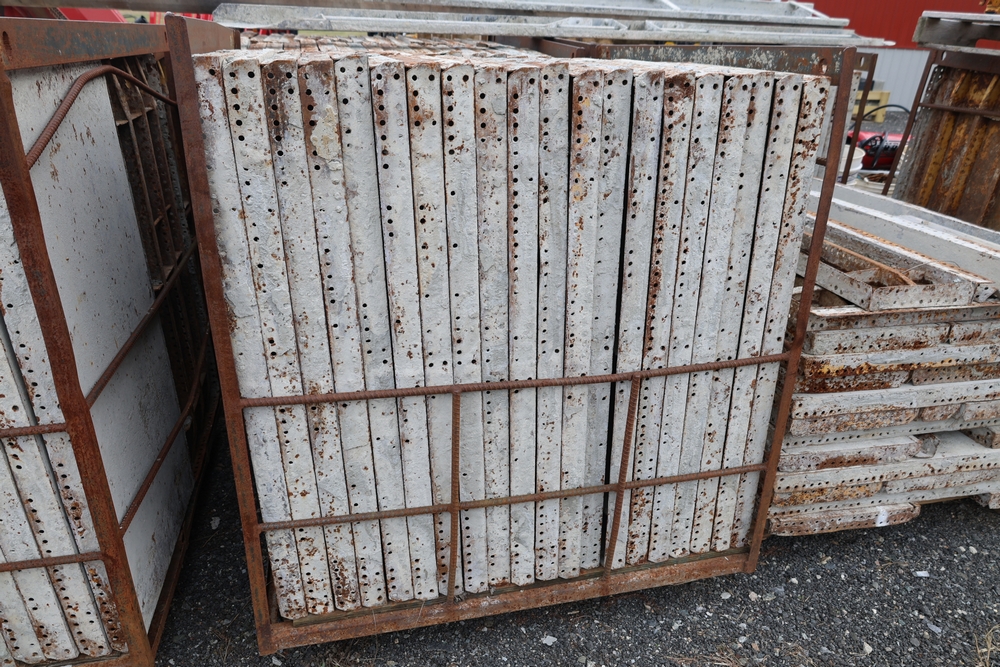 Concrete form supplies including IBC tote tank with metal cage and plastic pallet base containing liquid, includes multiple pallets of steel concrete forms and hardware, assorted metal brackets, buckets with fasteners, and two red portable heaters.