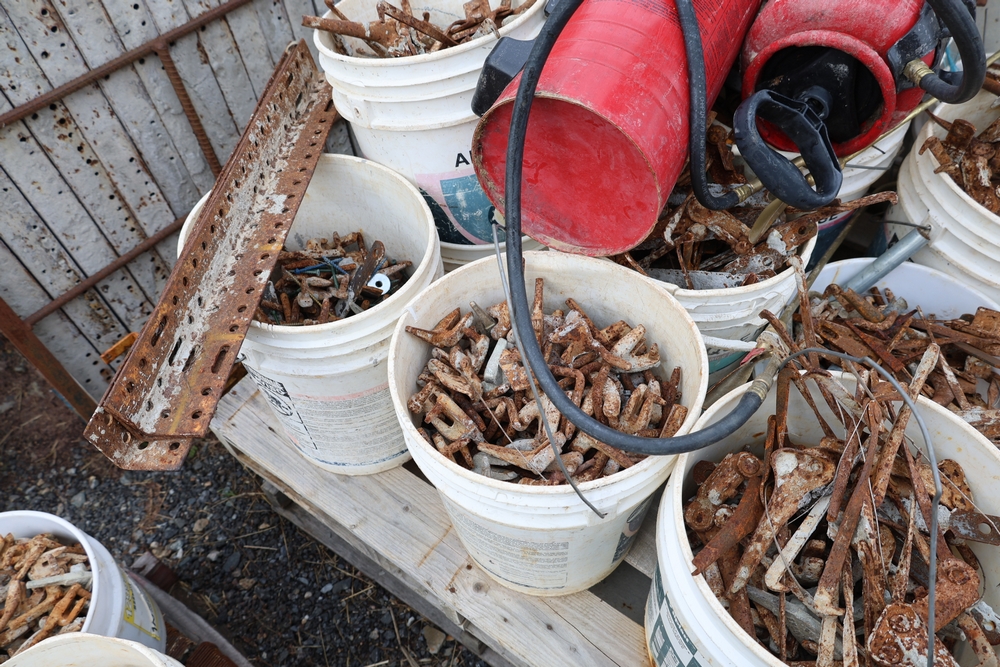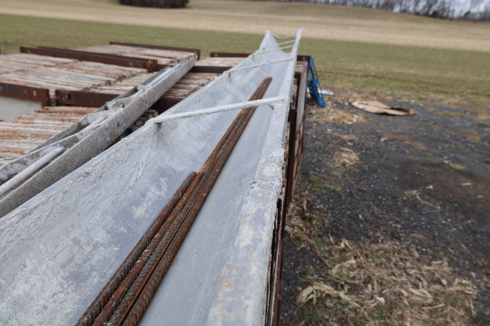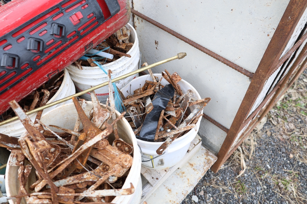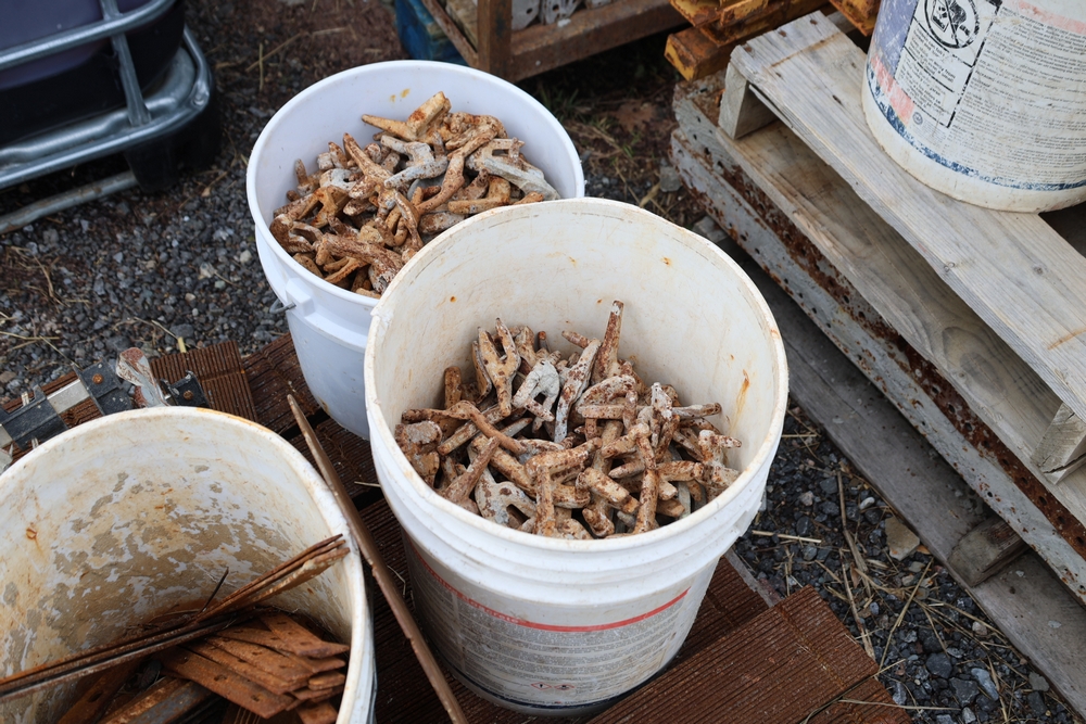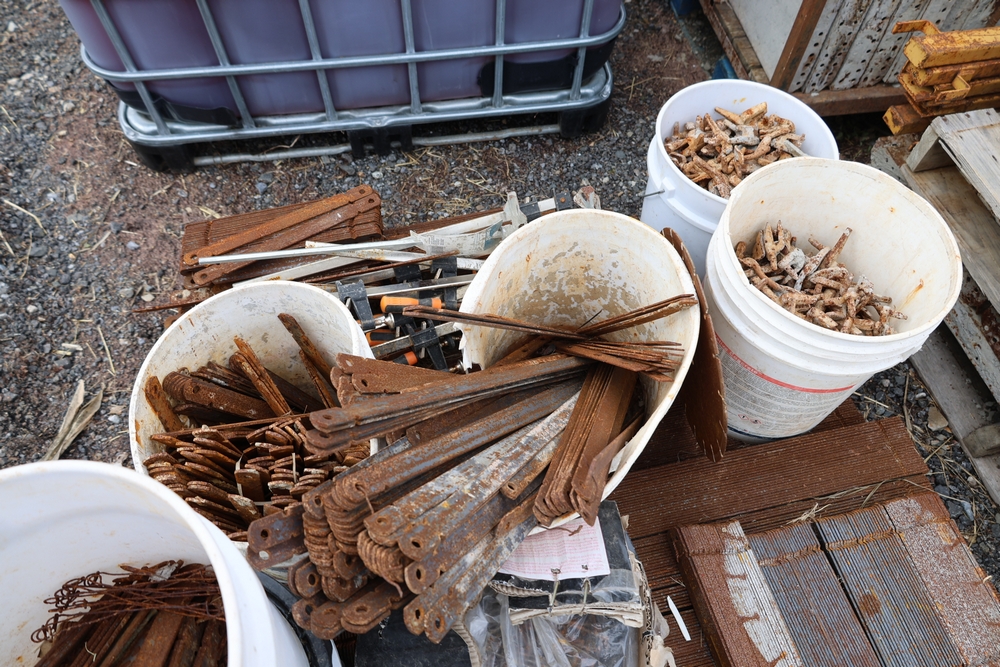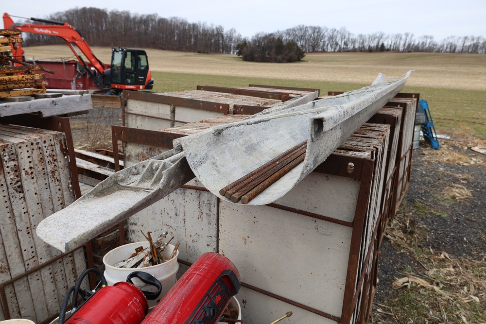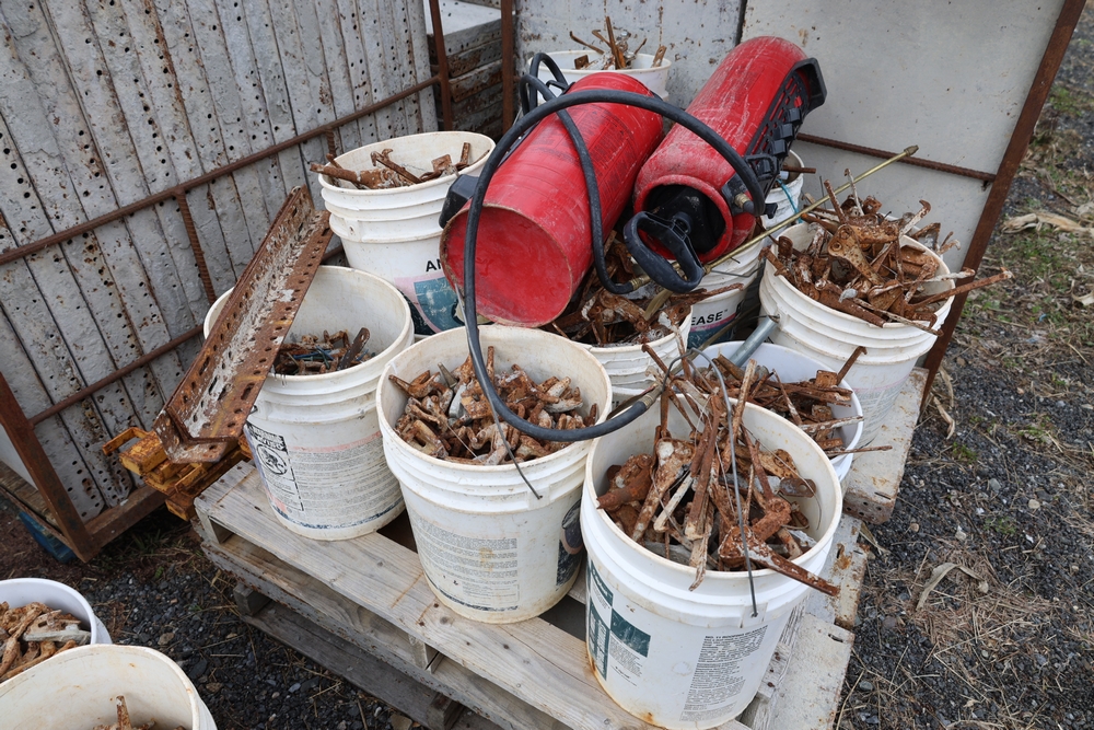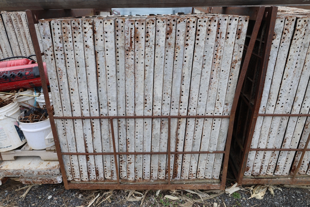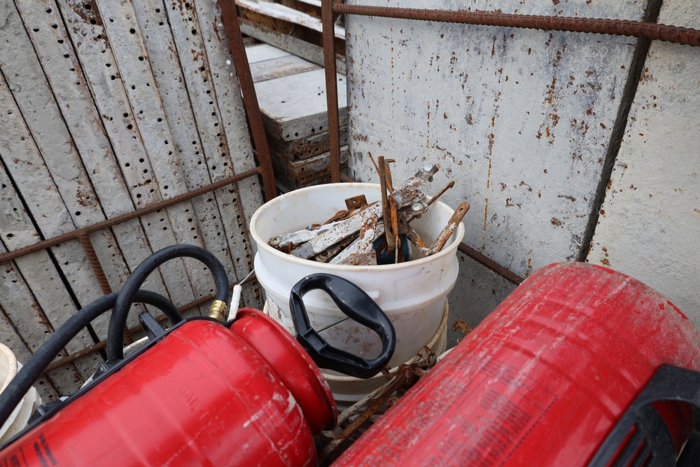 Concrete form supplies including IBC tote tank with metal cage and plastic pallet base containing liquid, includes multiple pallets of steel concrete forms and hardware, assorted metal brackets, buckets with fasteners, and two red portable heaters.