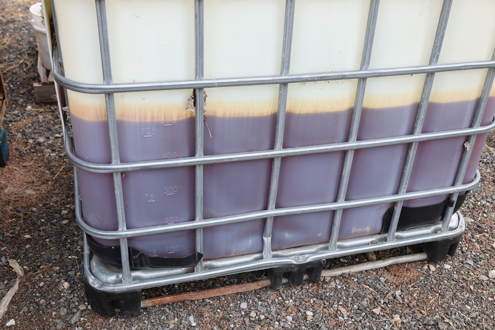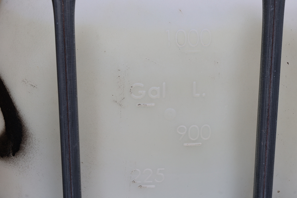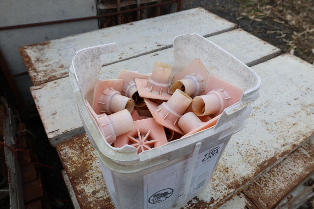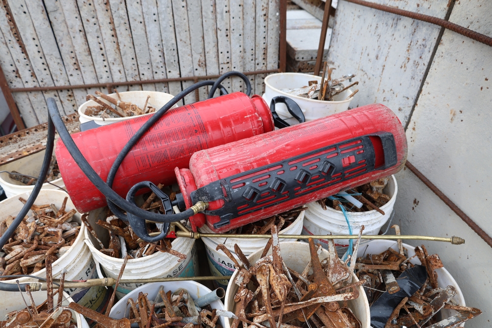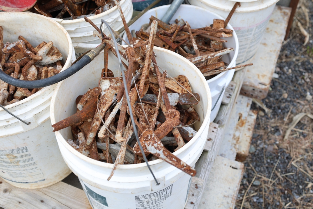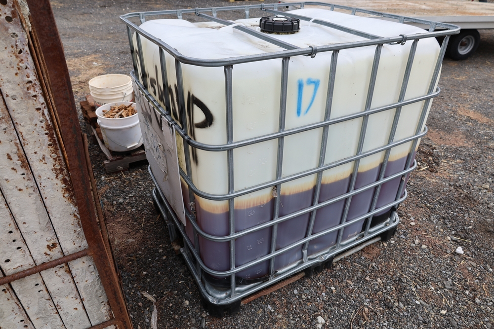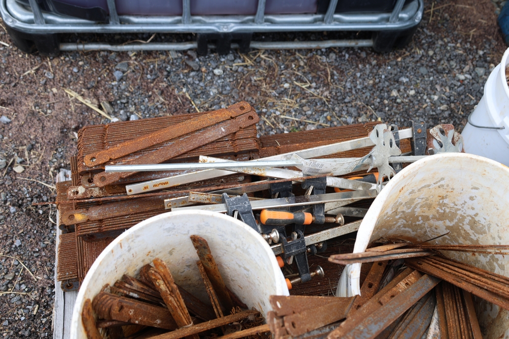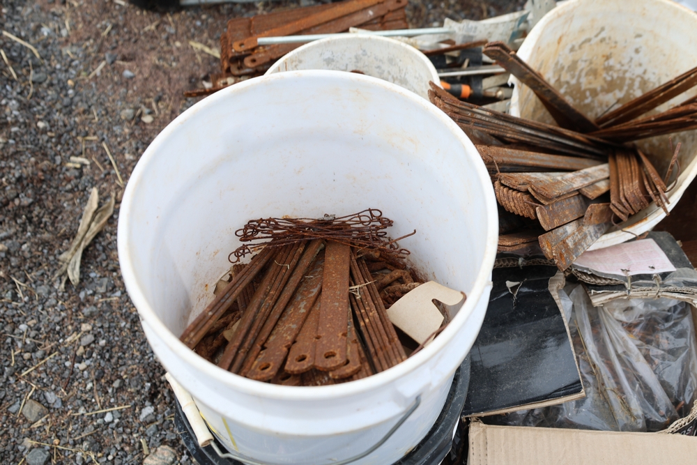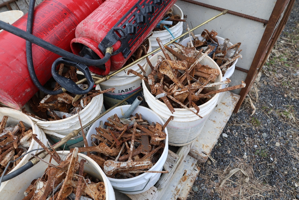 Concrete form supplies including IBC tote tank with metal cage and plastic pallet base containing liquid, includes multiple pallets of steel concrete forms and hardware, assorted metal brackets, buckets with fasteners, and two red portable heaters.