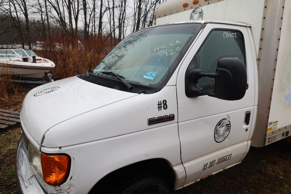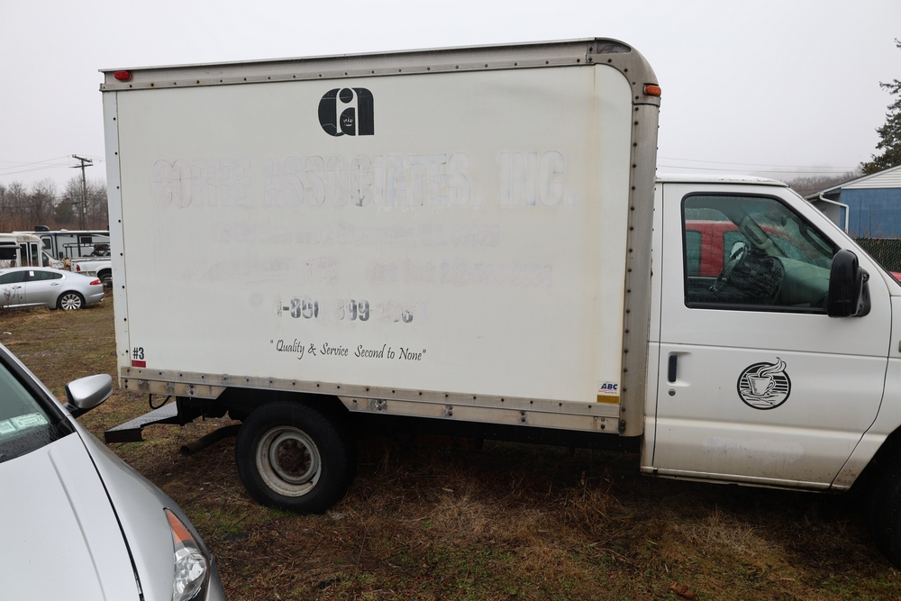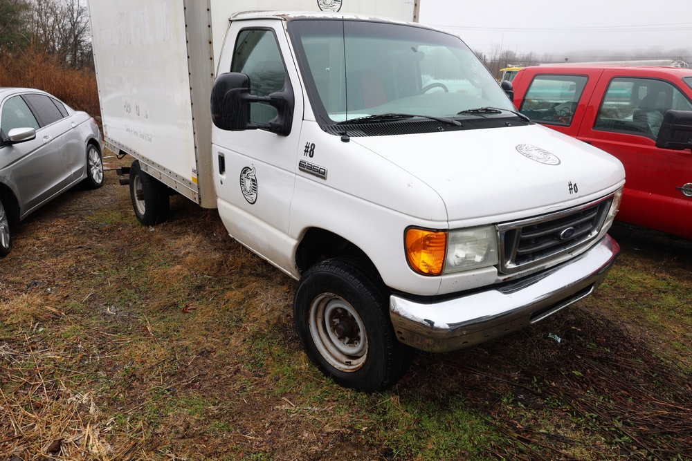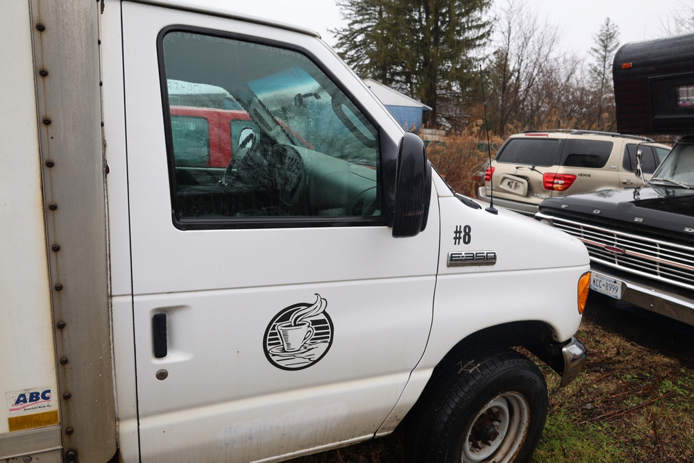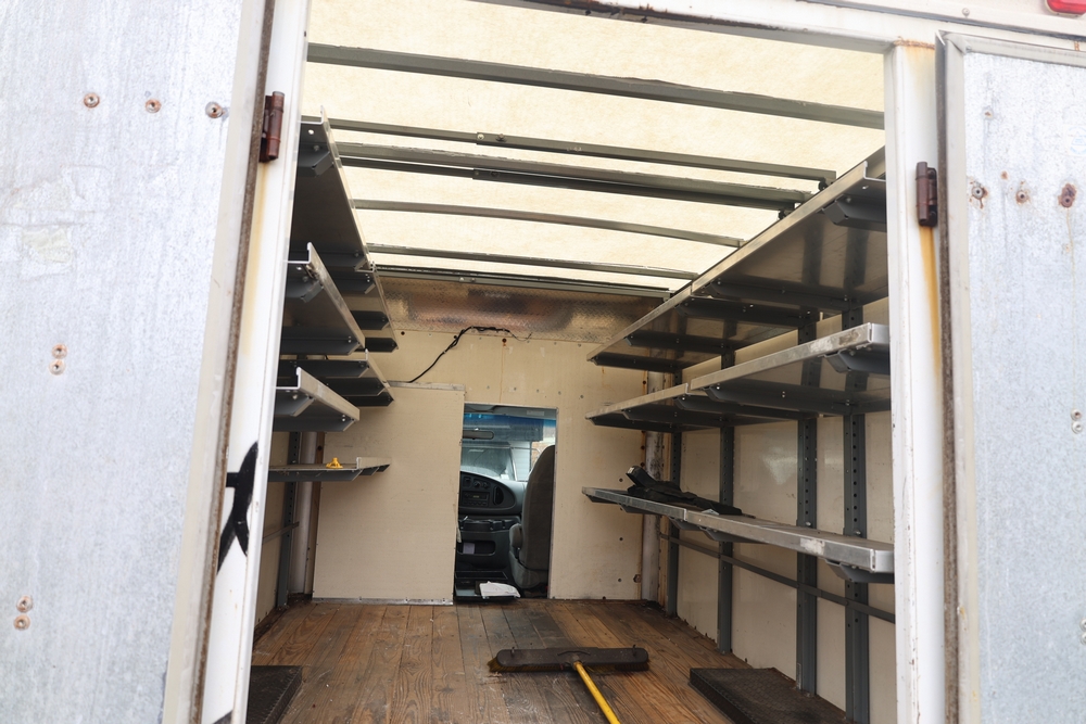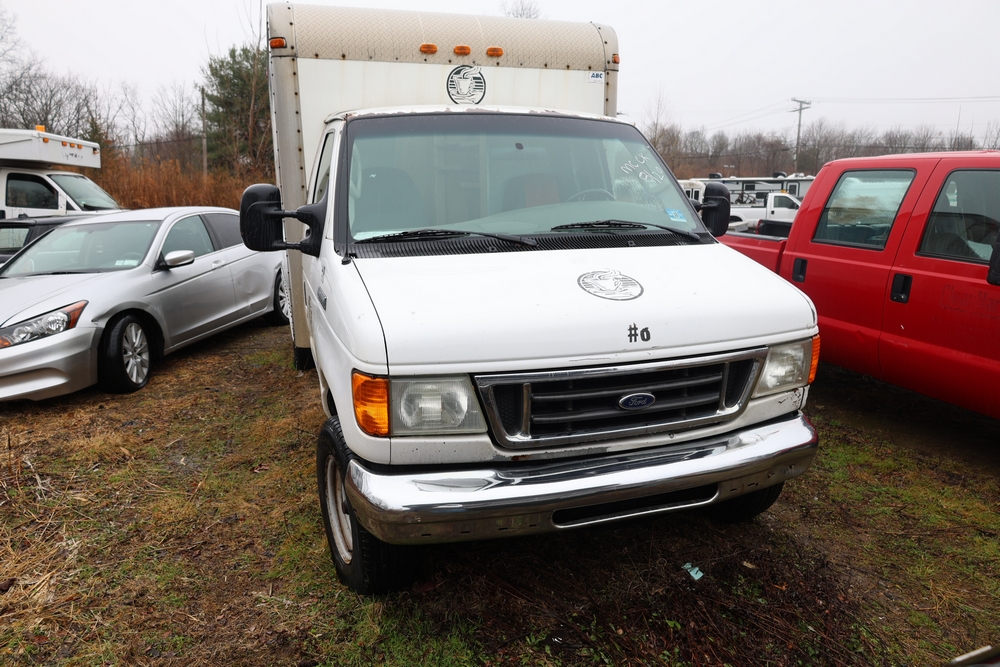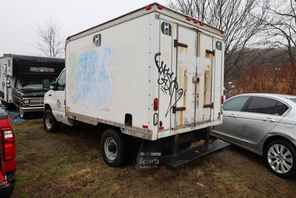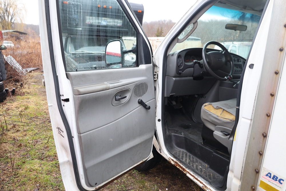 2007 Ford E-Series Van E-350 Super Duty with a 5.4L V8 SOHC 16V engine. VIN: 1FDSE35L97DB03043. Odometer reading: 170479. Body: cutaway. Box truck body with rear swing doors, interior shelving, cab partition, side mirrors, front grille, front bumper, steel wheels. NY Dealer transfer paperwork. Runs and drives. Key available.