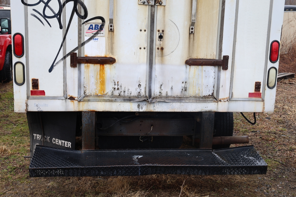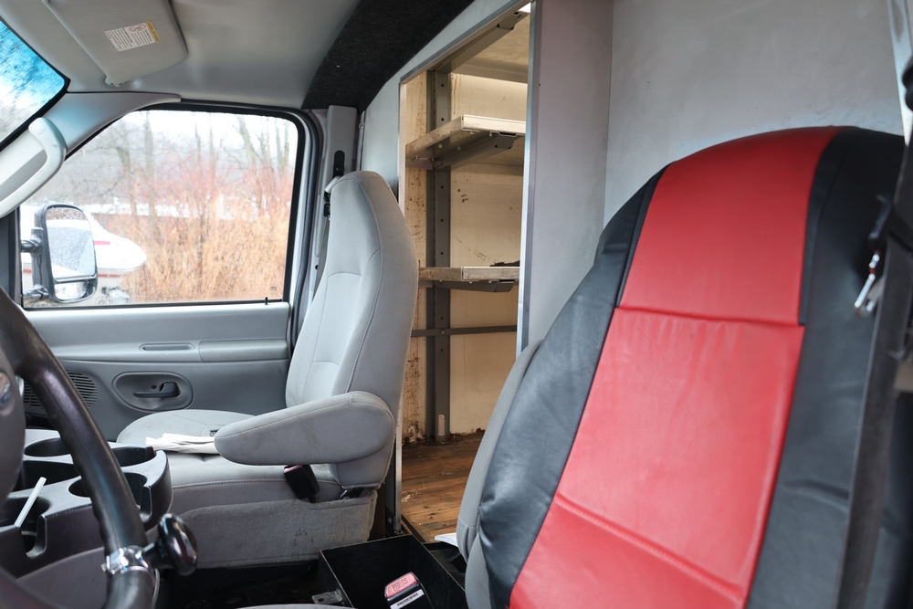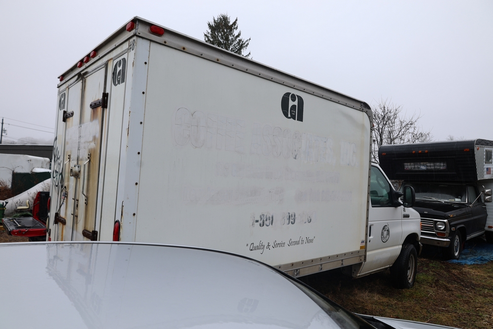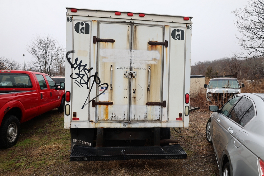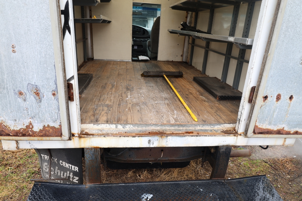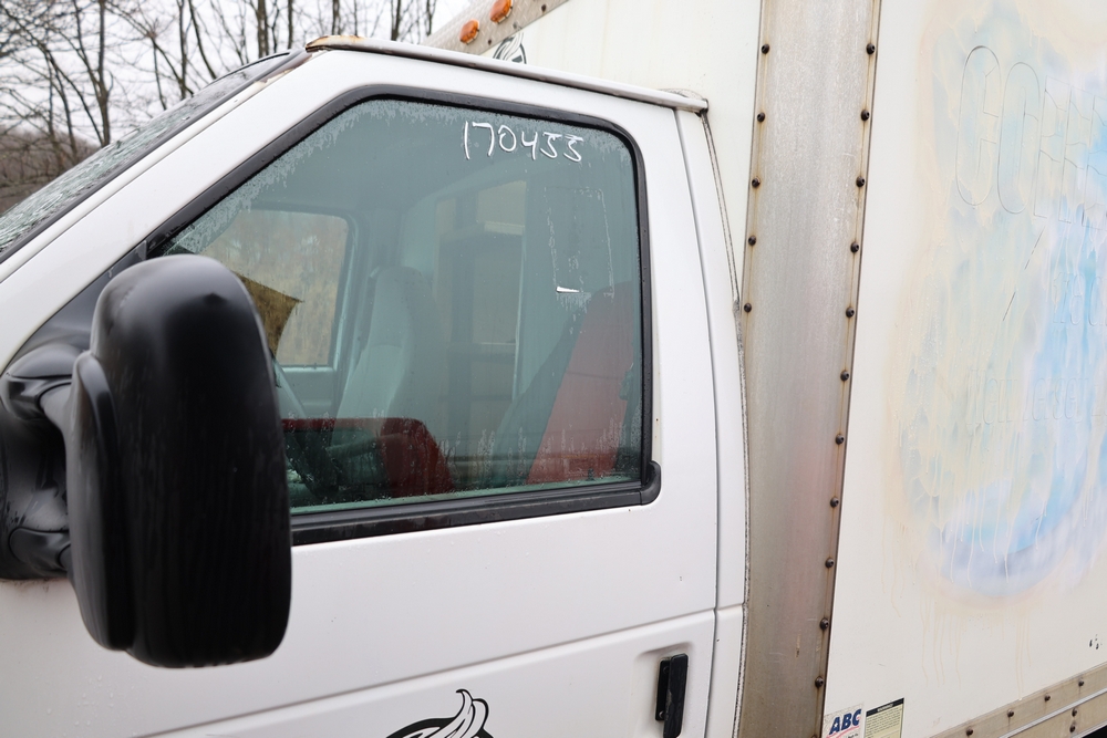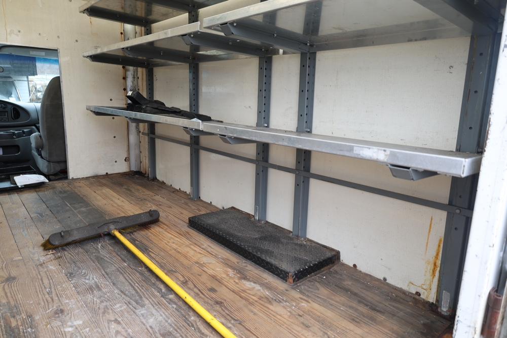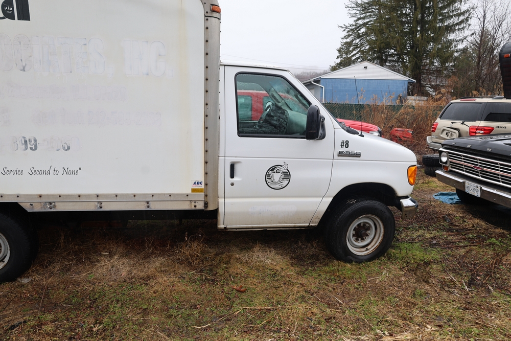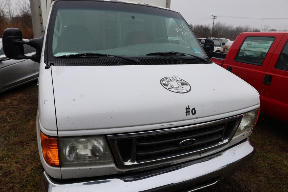2007 Ford E-Series Van E-350 Super Duty with a 5.4L V8 SOHC 16V engine. VIN: 1FDSE35L97DB03043. Odometer reading: 170479. Body: cutaway. Box truck body with rear swing doors, interior shelving, cab partition, side mirrors, front grille, front bumper, steel wheels. NY Dealer transfer paperwork. Runs and drives. Key available.