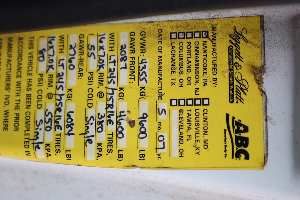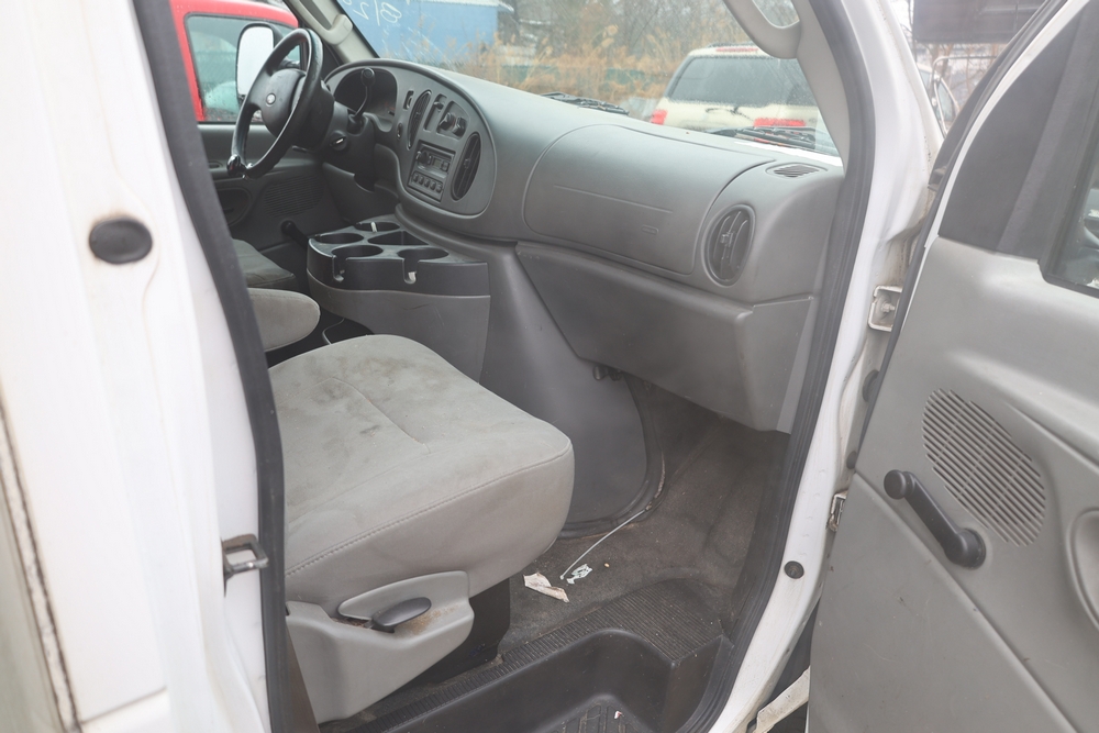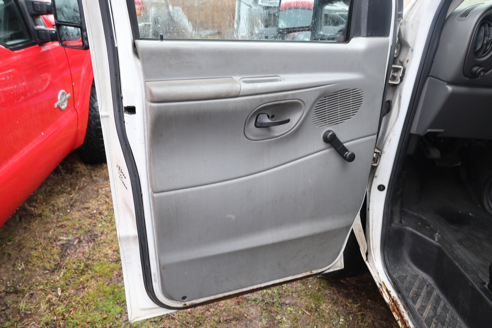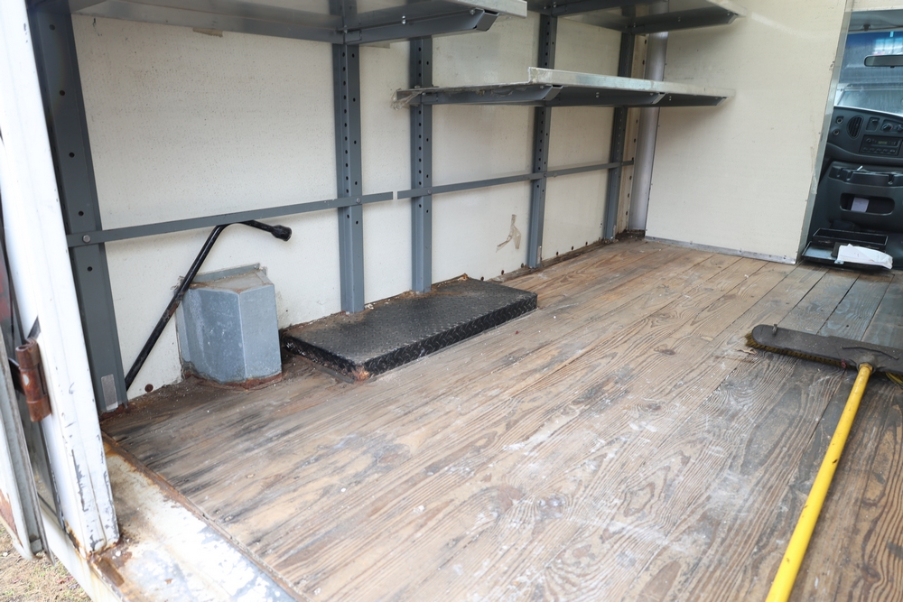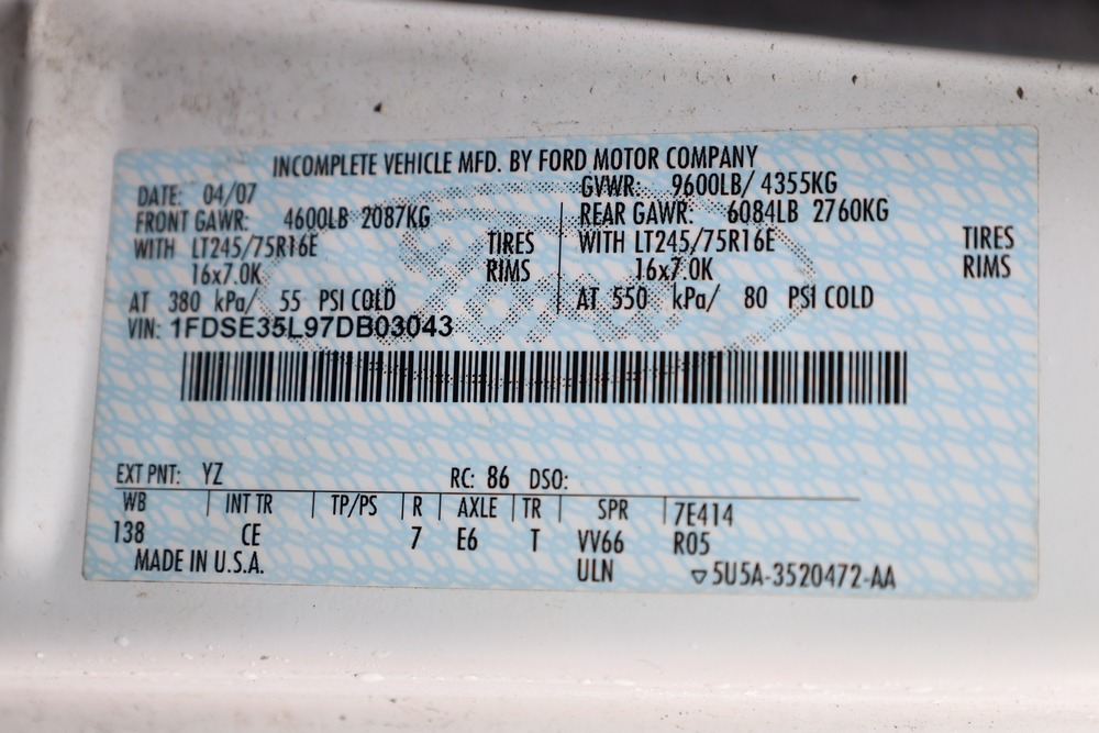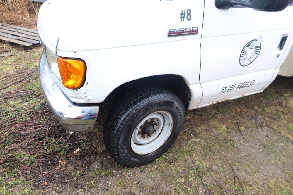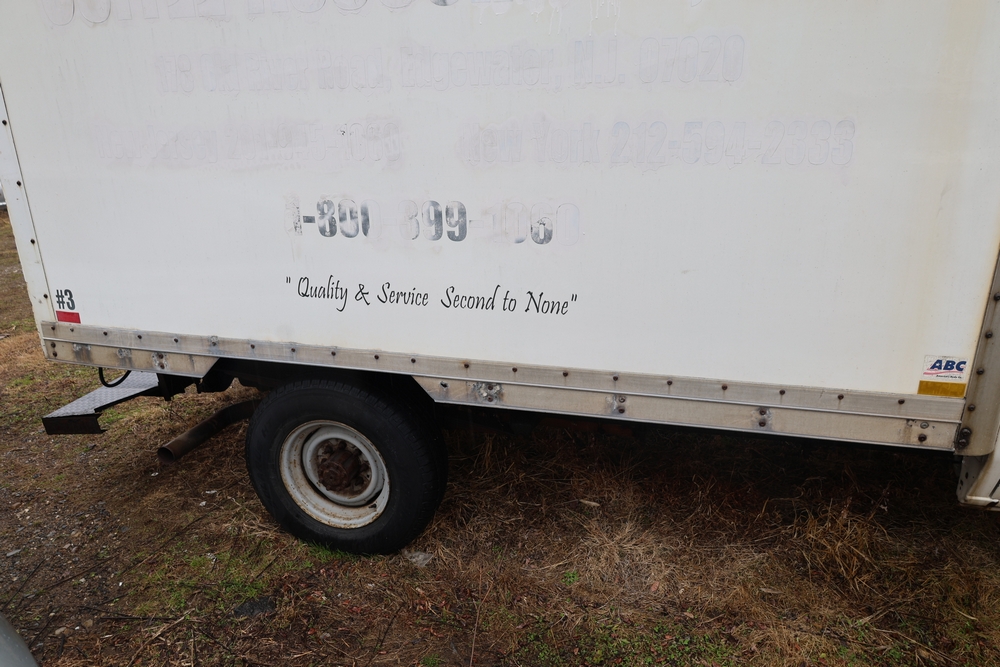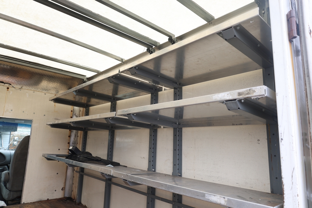 2007 Ford E-Series Van E-350 Super Duty with a 5.4L V8 SOHC 16V engine. VIN: 1FDSE35L97DB03043. Odometer reading: 170479. Body: cutaway. Box truck body with rear swing doors, interior shelving, cab partition, side mirrors, front grille, front bumper, steel wheels. NY Dealer transfer paperwork. Runs and drives. Key available.