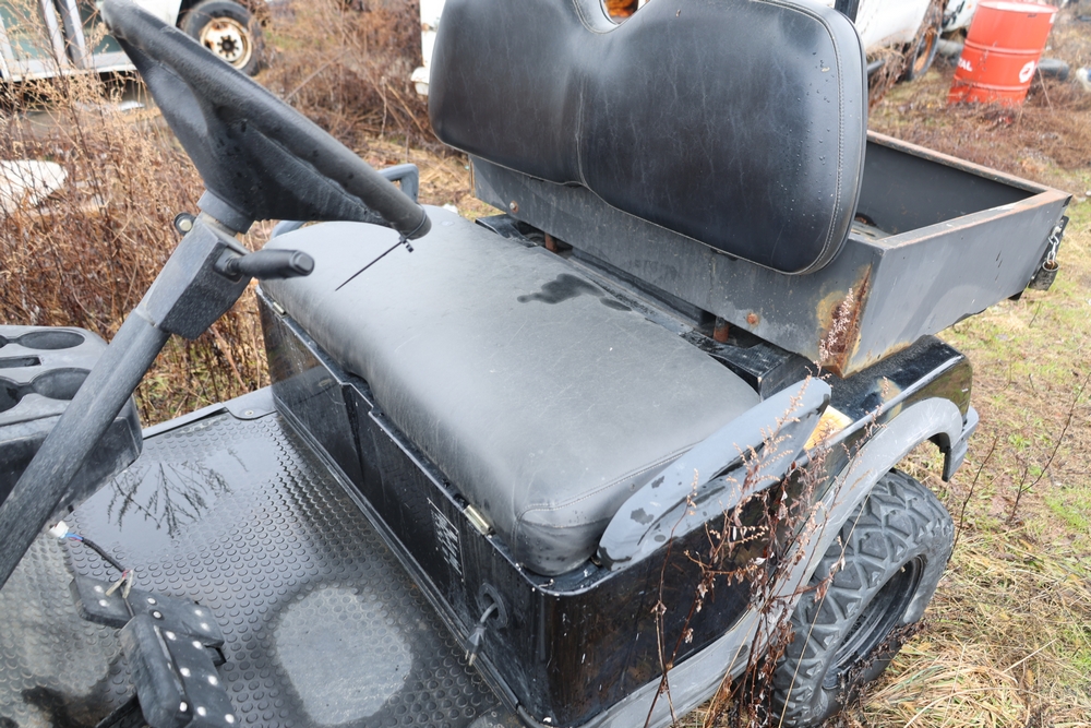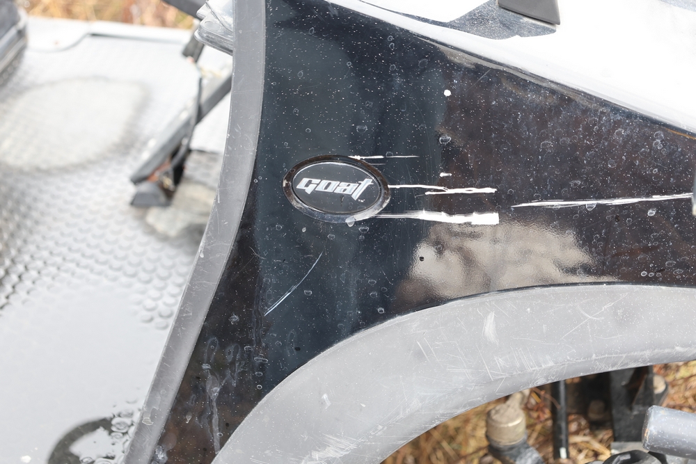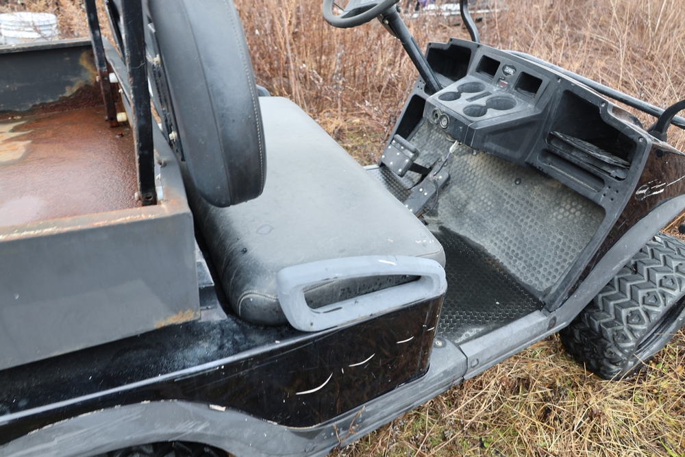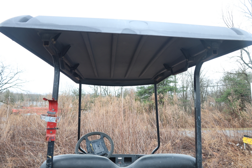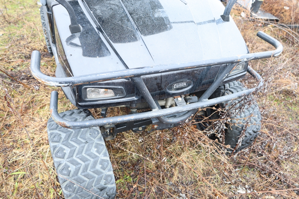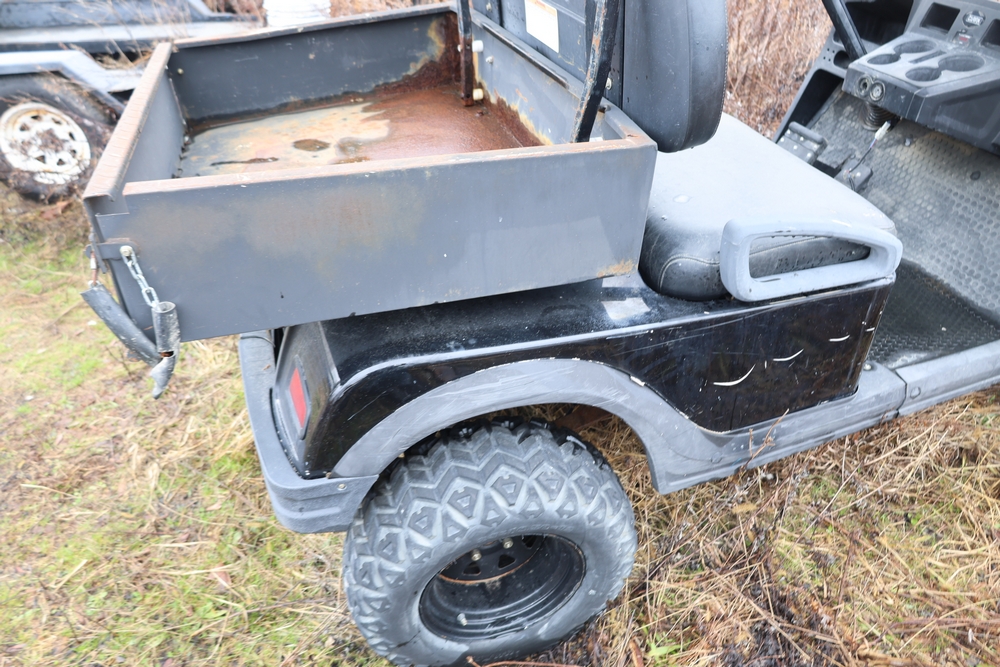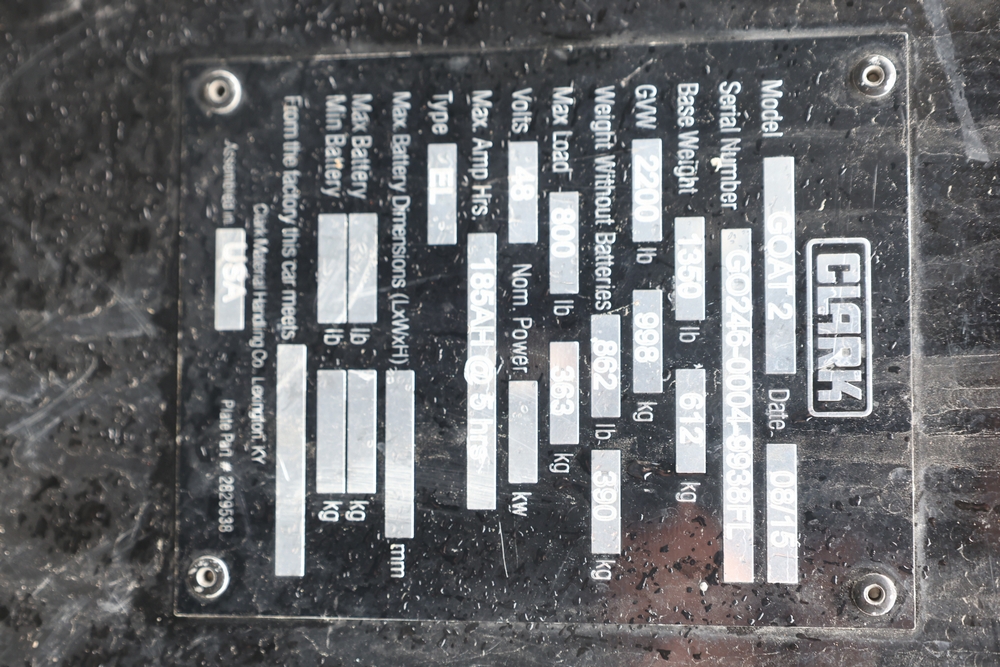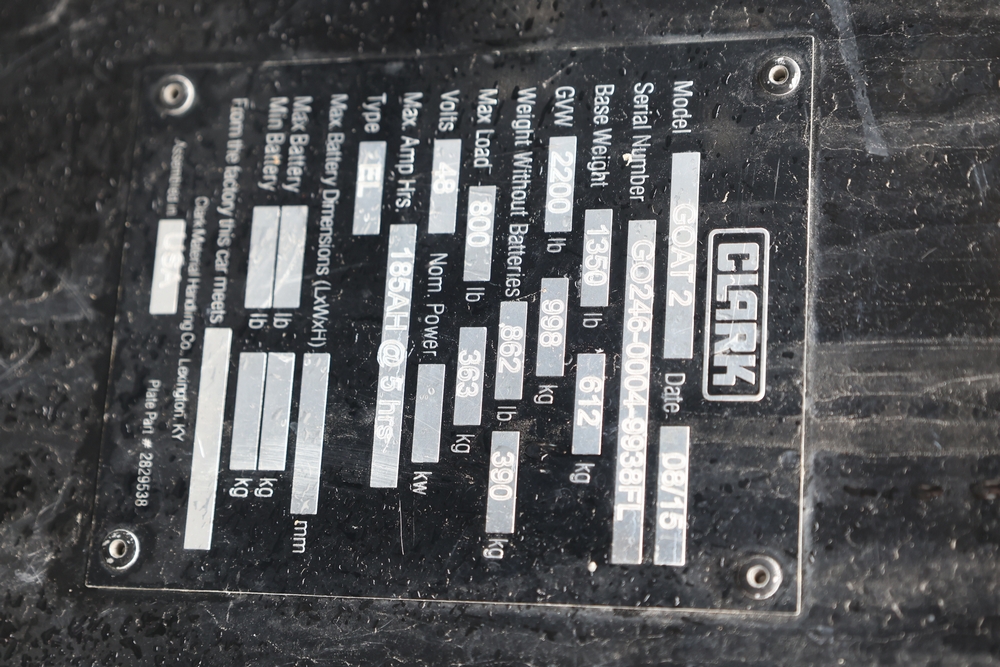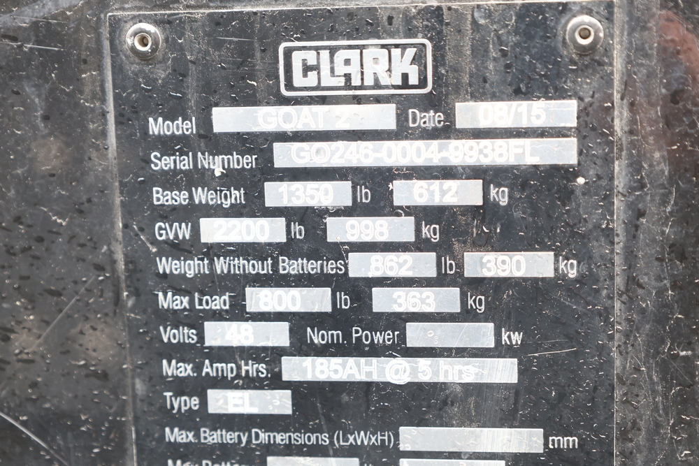 2013 Clark GOAT 2 electric utility cart with roof, two seat configuration, rear cargo bed, and onboard battery system with charger, model GOAT 2, serial number GO246-0004-9938FL. Needs batteries, no key.