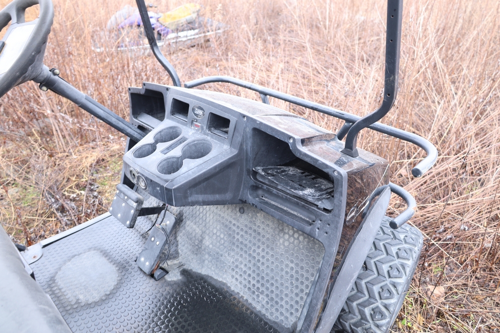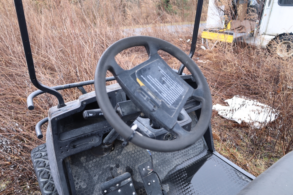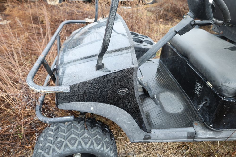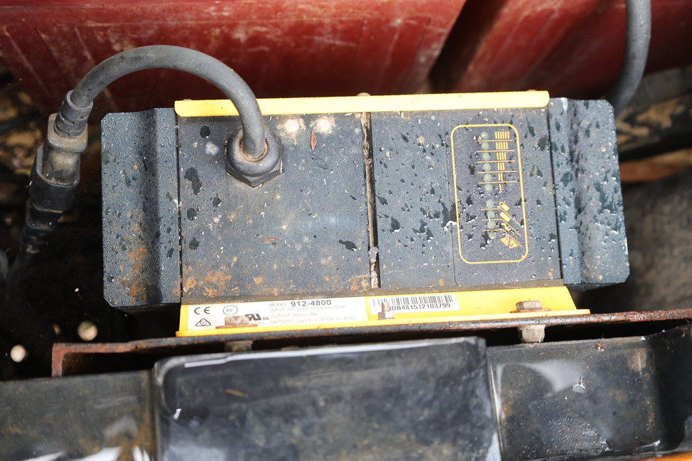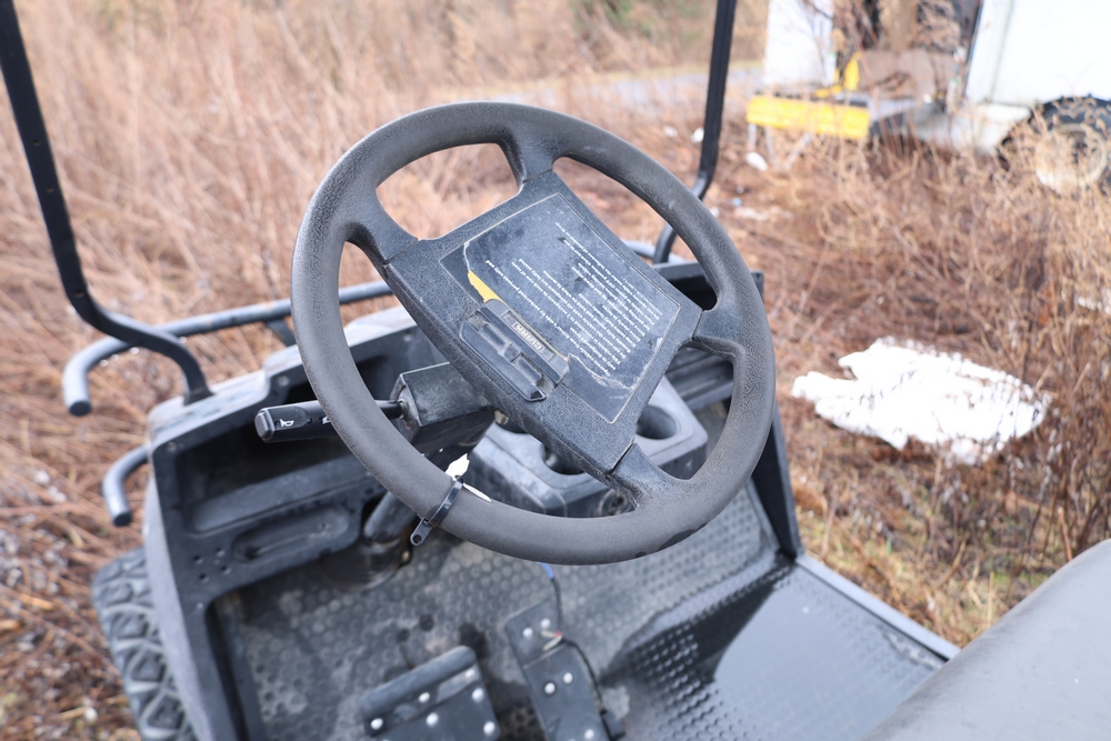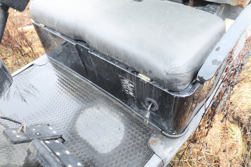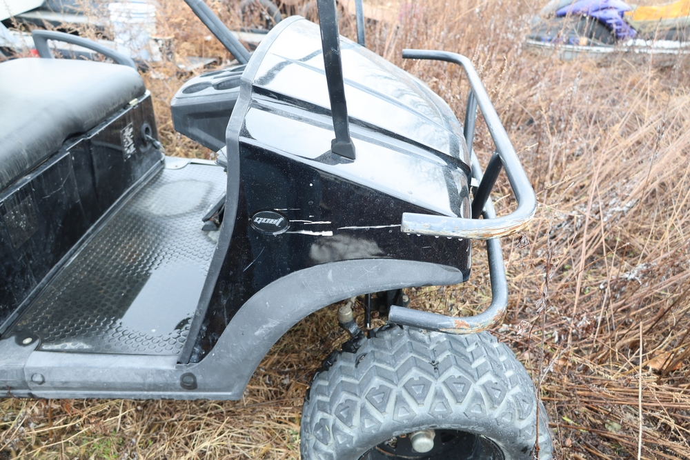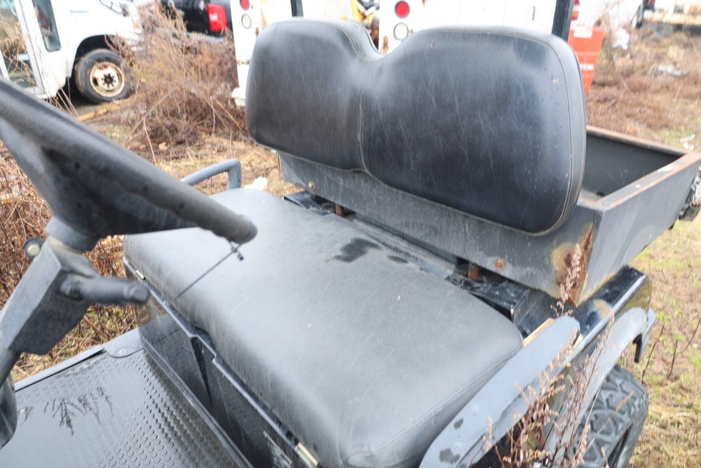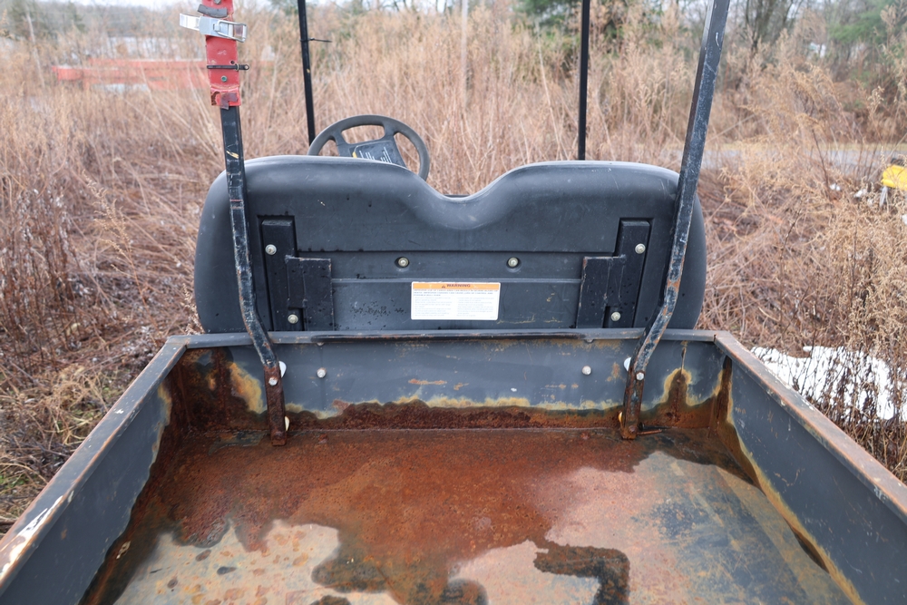 2013 Clark GOAT 2 electric utility cart with roof, two seat configuration, rear cargo bed, and onboard battery system with charger, model GOAT 2, serial number GO246-0004-9938FL. Needs batteries, no key.