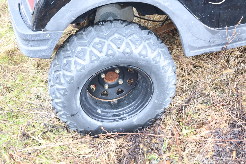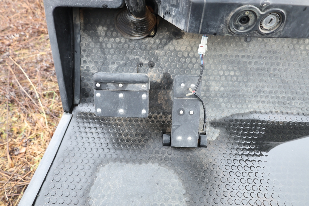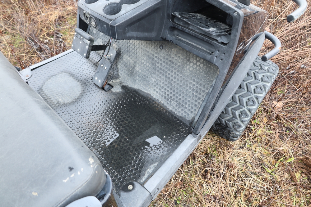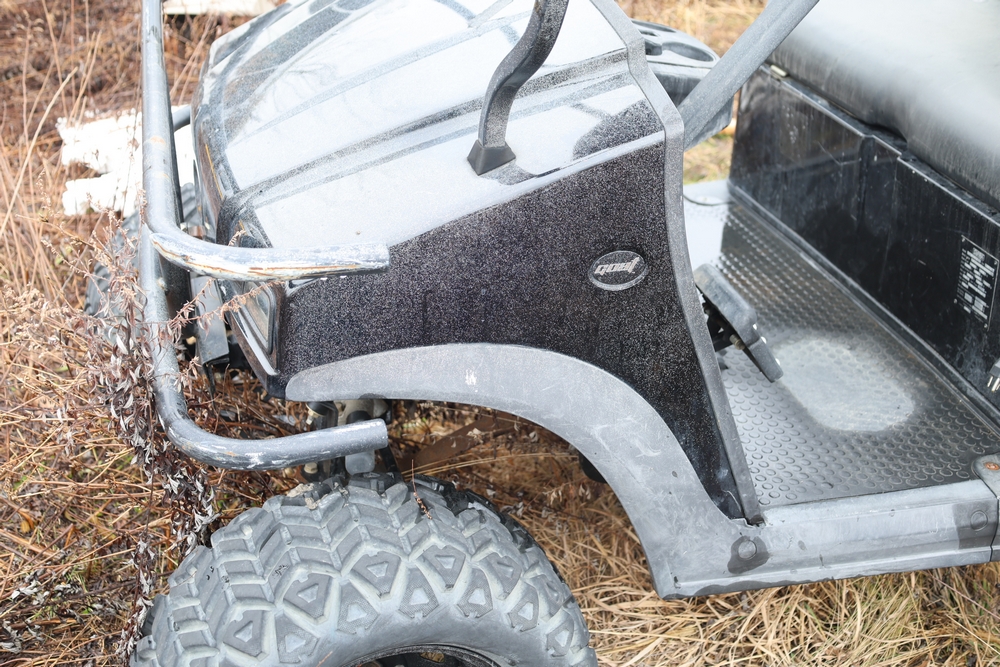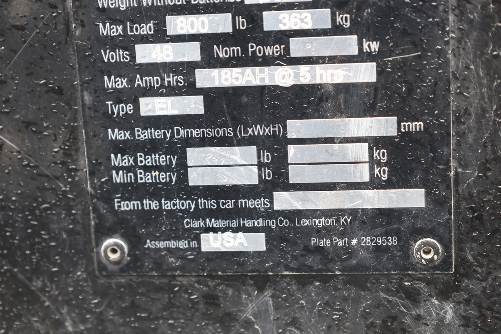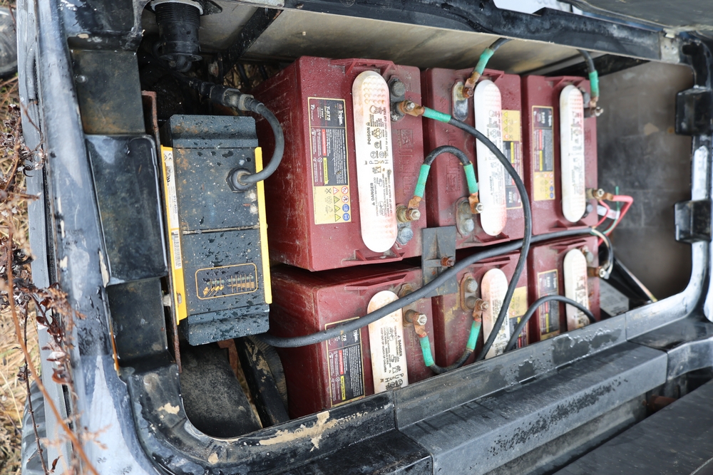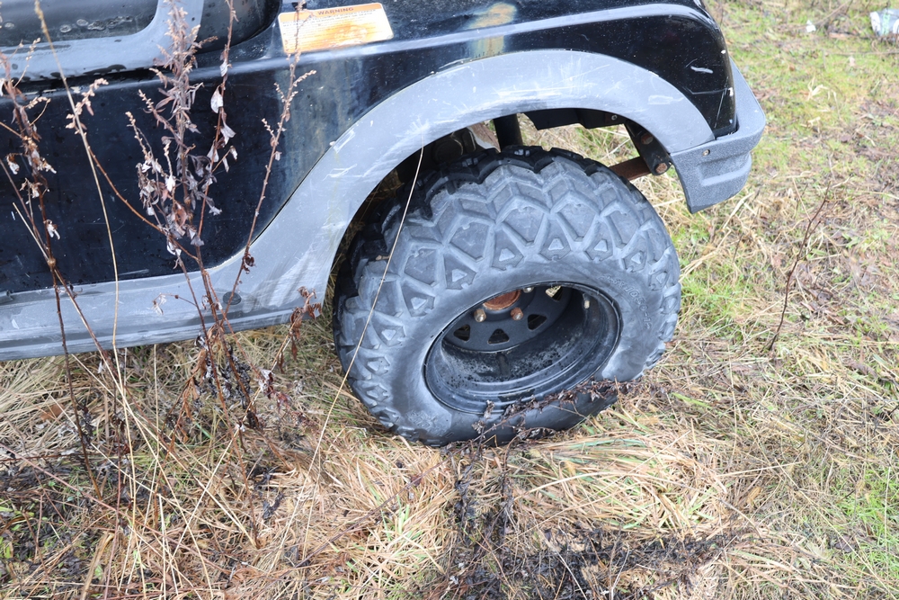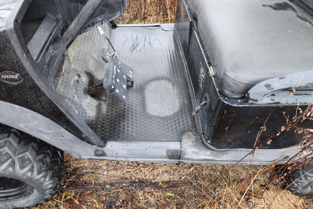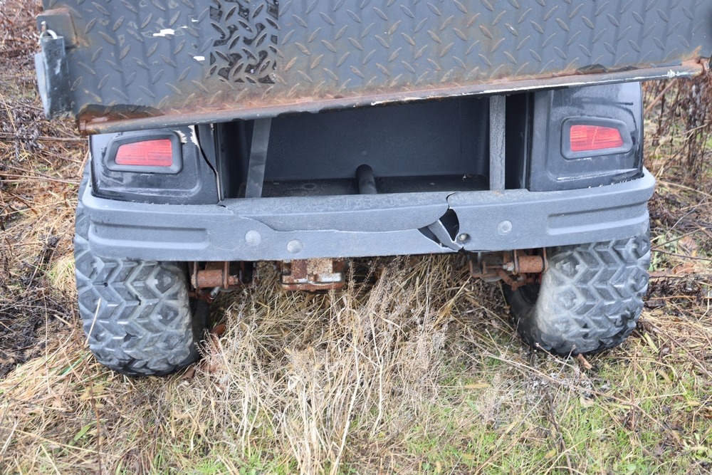 2013 Clark GOAT 2 electric utility cart with roof, two seat configuration, rear cargo bed, and onboard battery system with charger, model GOAT 2, serial number GO246-0004-9938FL. Needs batteries, no key.