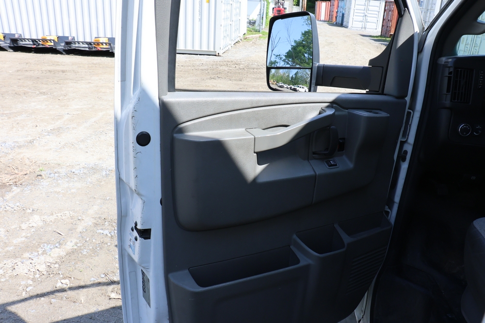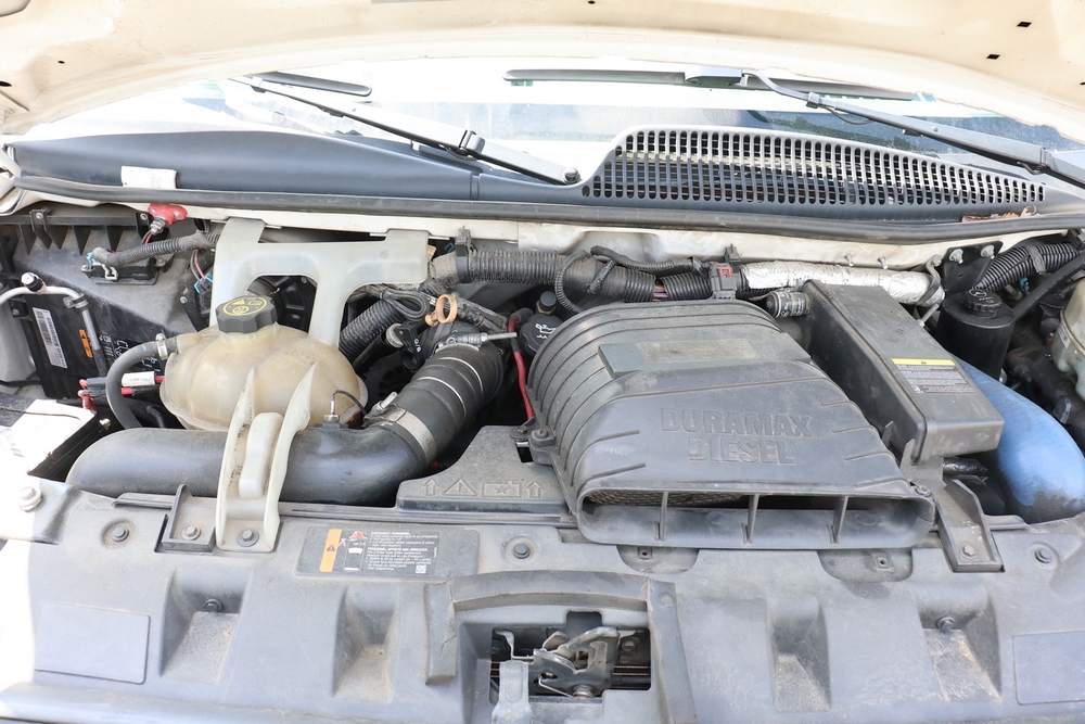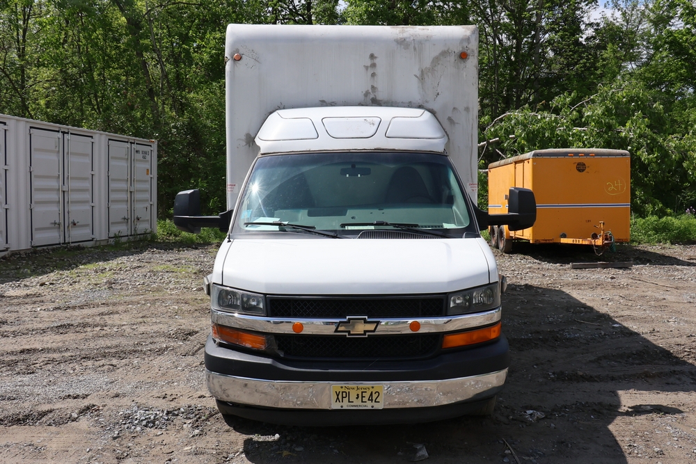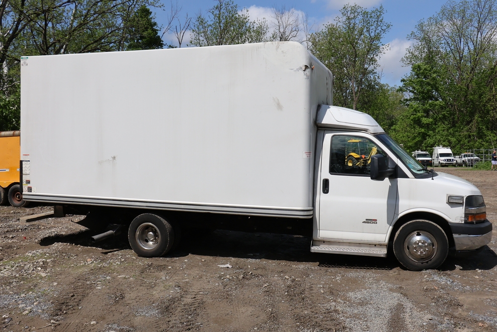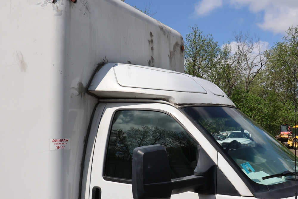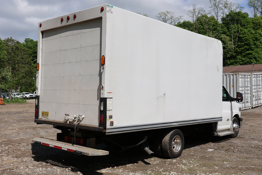 2016 Chevrolet Express G33803 box truck. VIN: 1GB6GUCL3G1250120. Odometer reading: 196,184 miles. Engine: 6.6L V8 OHV 16V Turbo diesel. Transmission: Automatic. Exterior: White cab and box body with dual rear wheels, rear roll-up door, and step bumper. Interior: Gray cloth seating with power outlets, manual climate controls, and factory AM/FM stereo system. Runs and drives. Keys, Title & Bill of Sale Available. Mileage will vary at the time of pickup.
