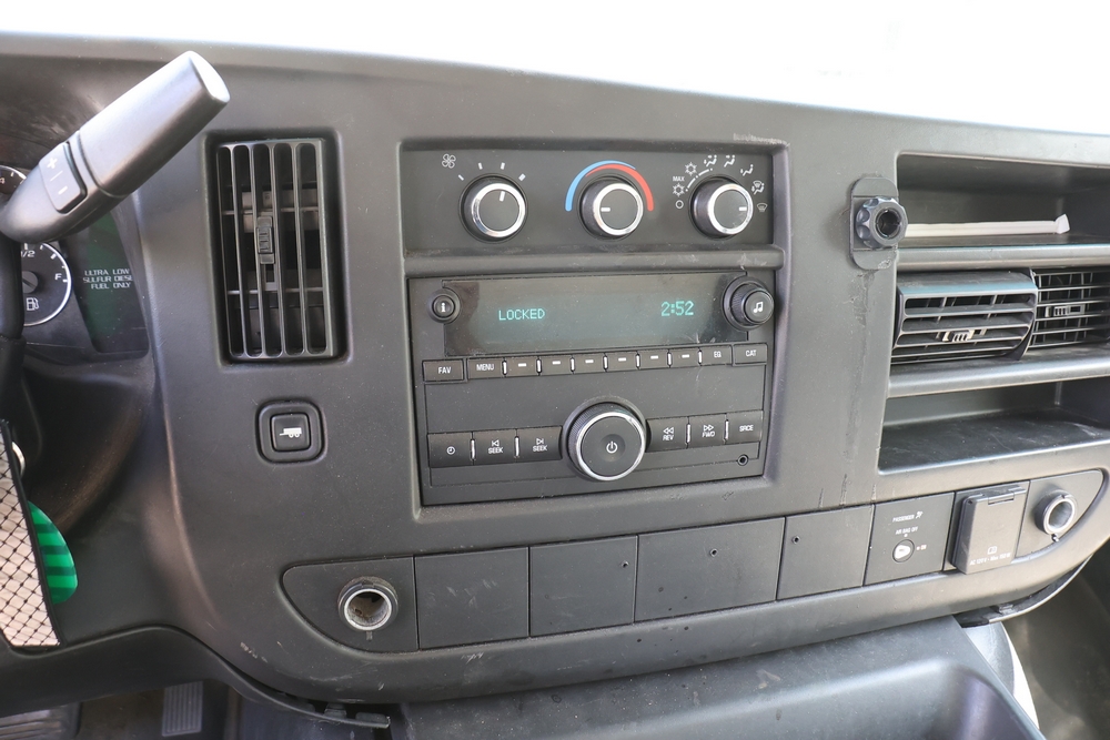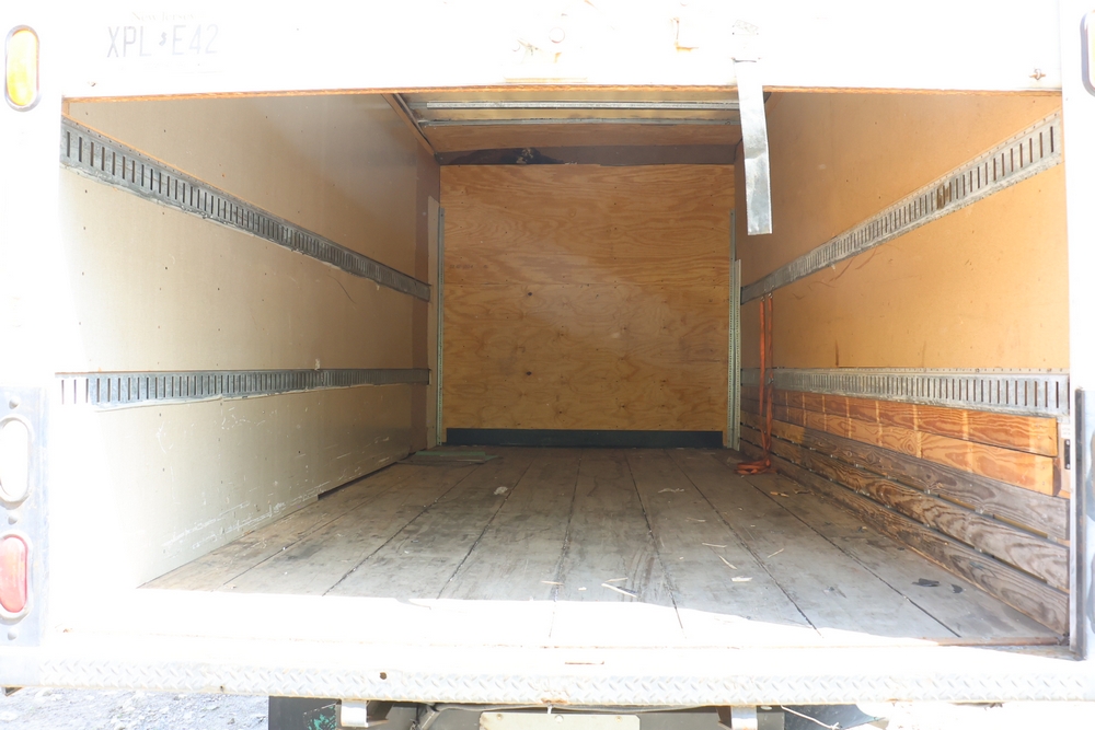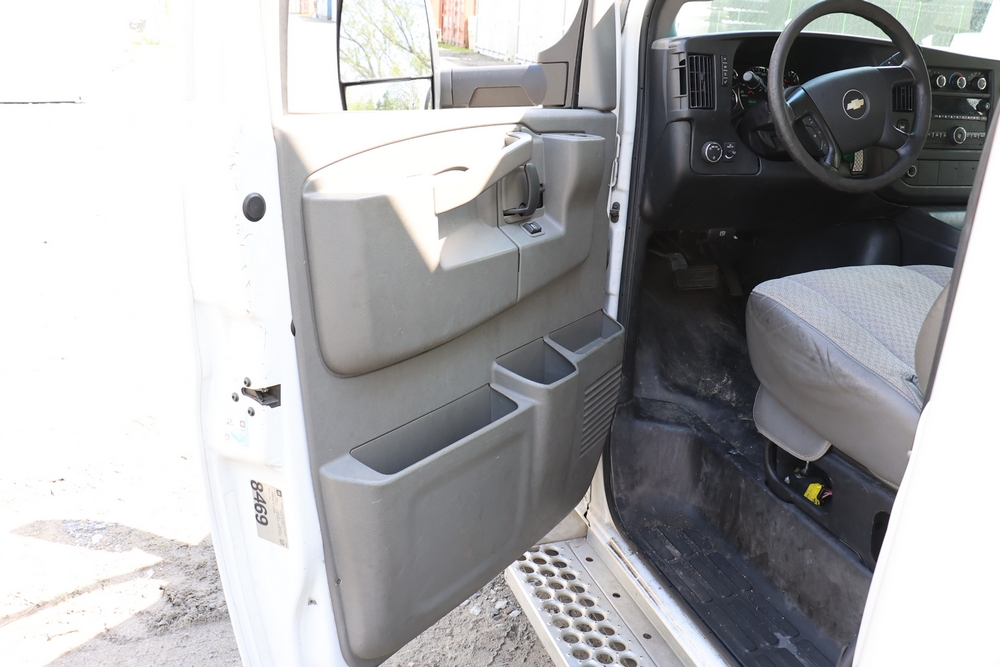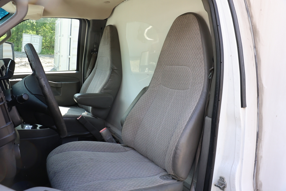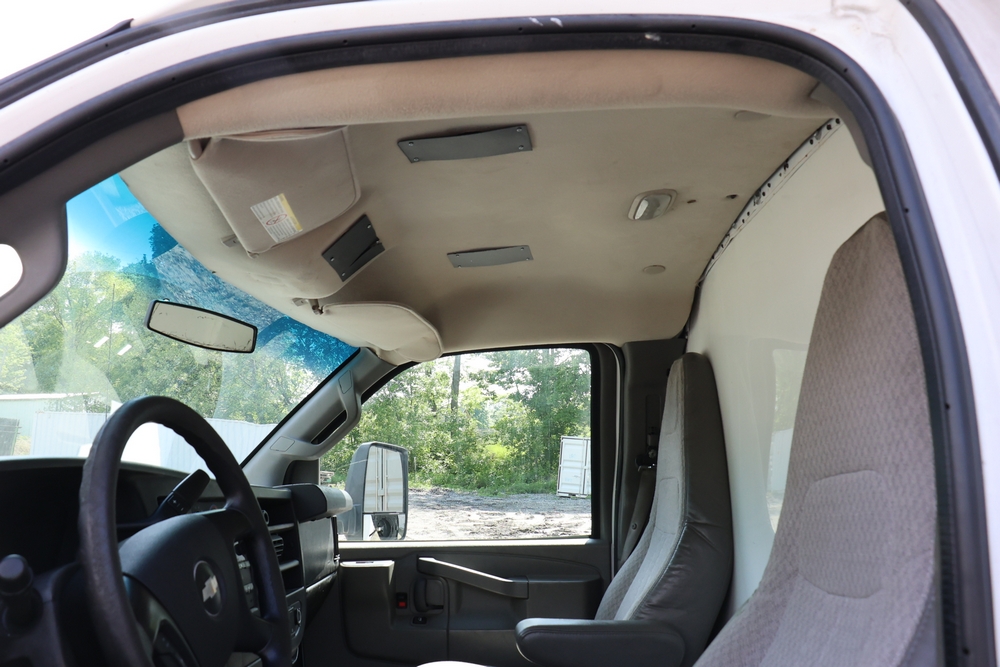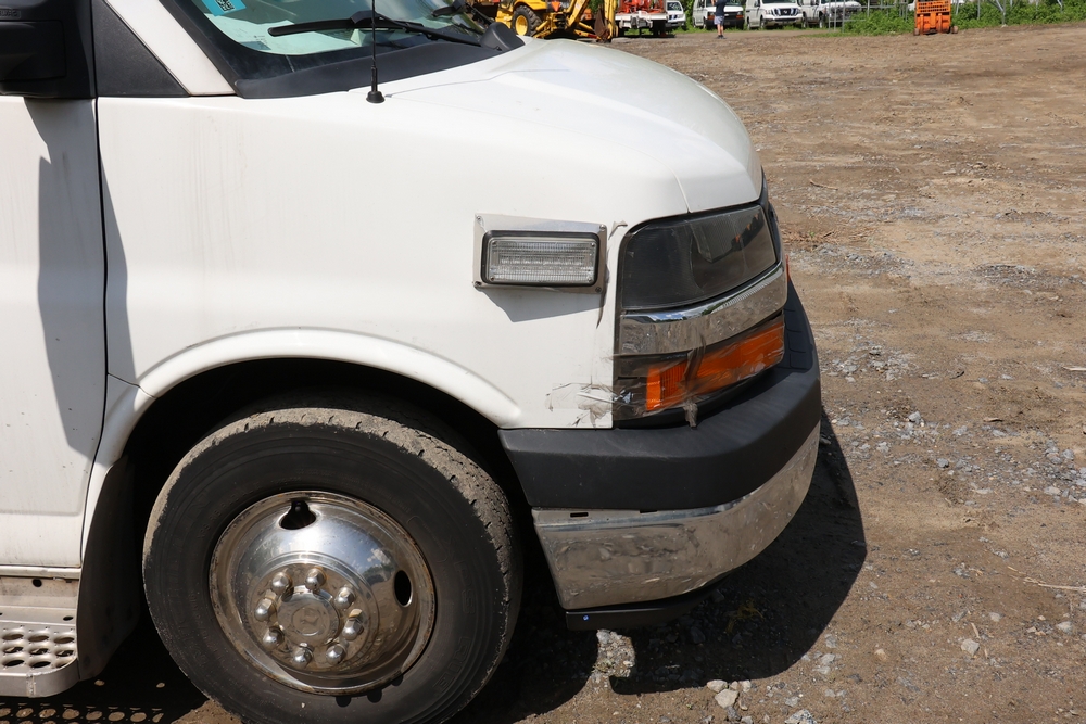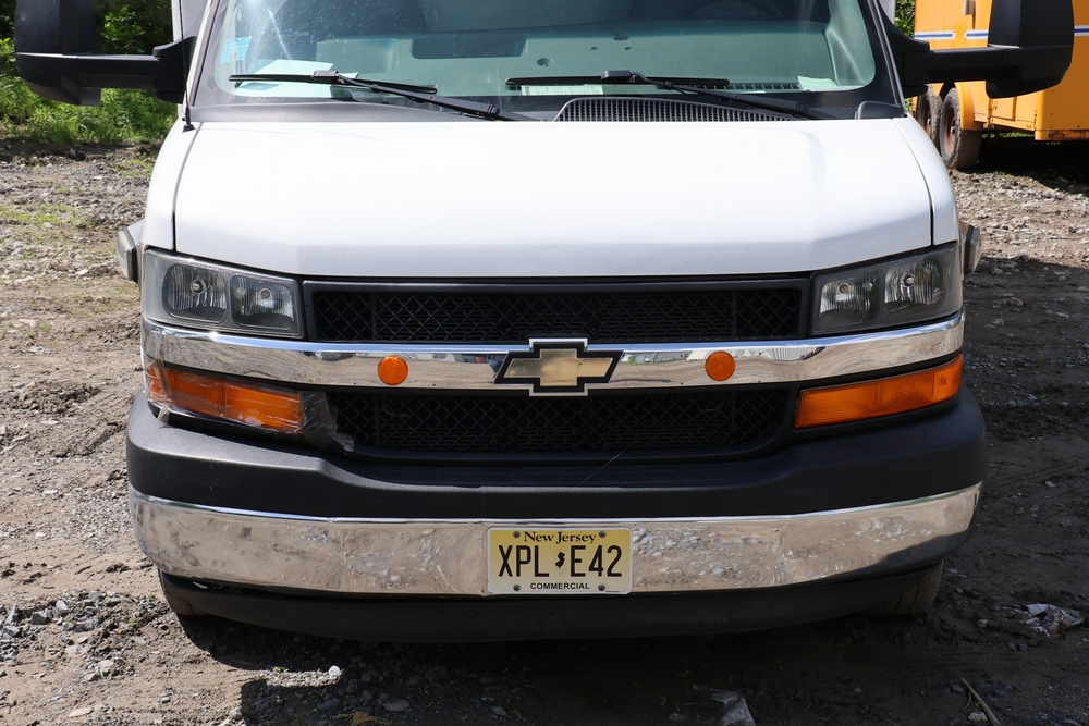 2016 Chevrolet Express G33803 box truck. VIN: 1GB6GUCL3G1250120. Odometer reading: 196,184 miles. Engine: 6.6L V8 OHV 16V Turbo diesel. Transmission: Automatic. Exterior: White cab and box body with dual rear wheels, rear roll-up door, and step bumper. Interior: Gray cloth seating with power outlets, manual climate controls, and factory AM/FM stereo system. Runs and drives. Keys, Title & Bill of Sale Available. Mileage will vary at the time of pickup.