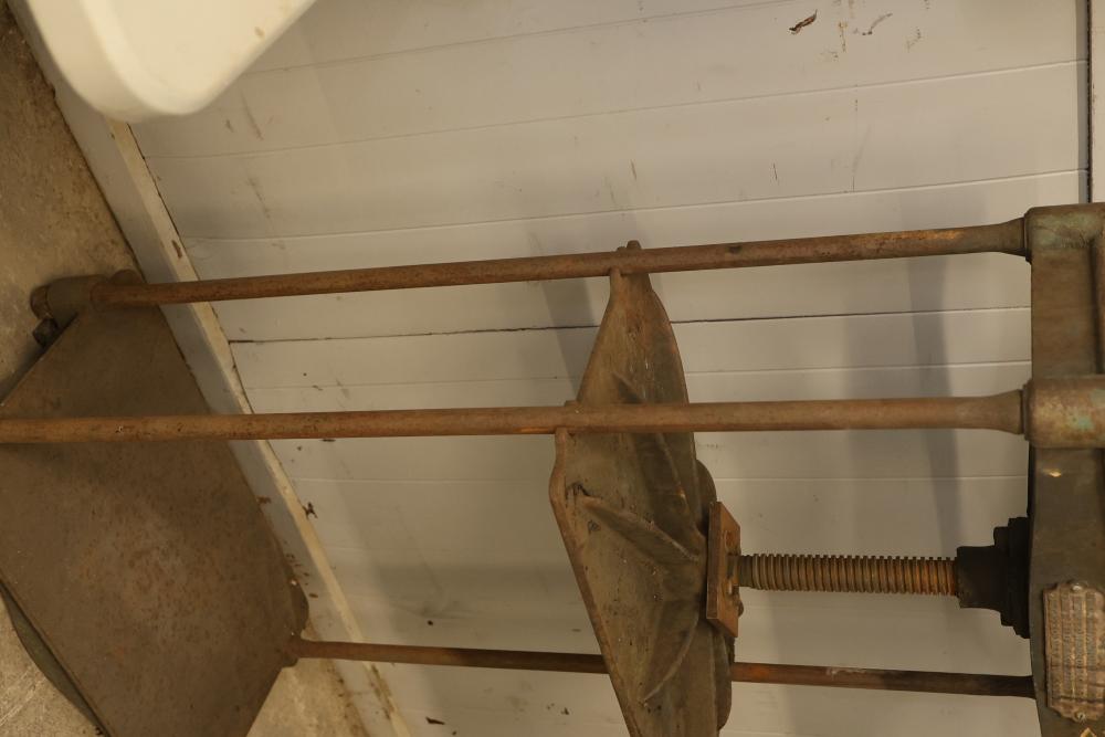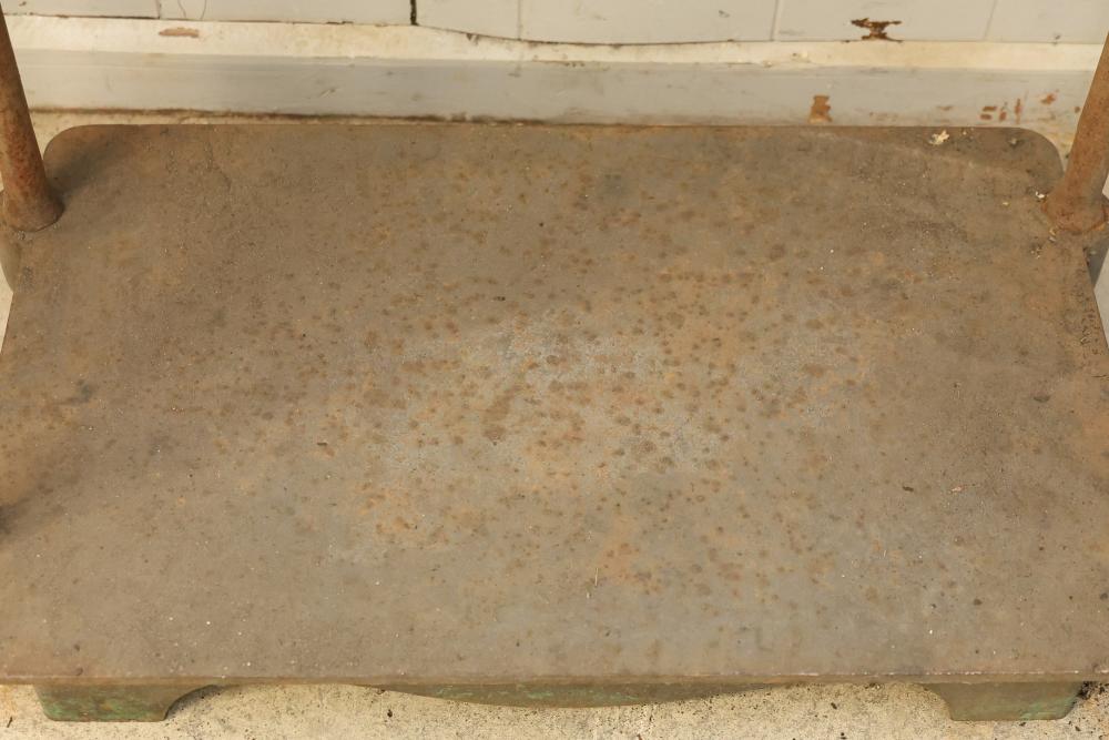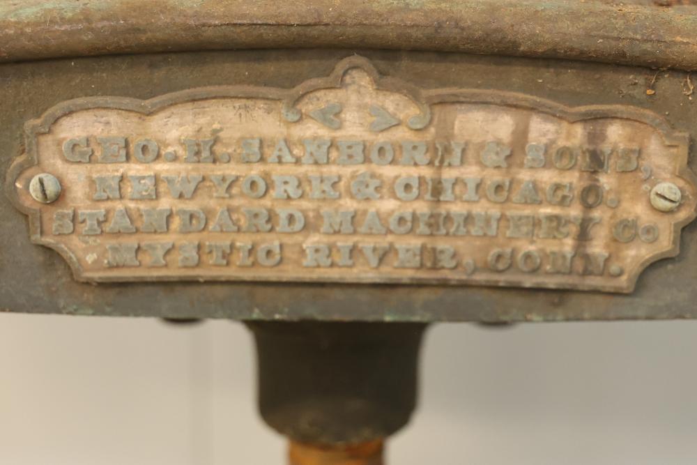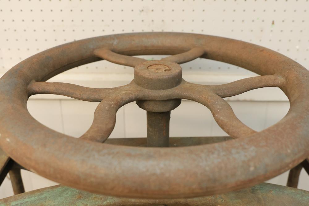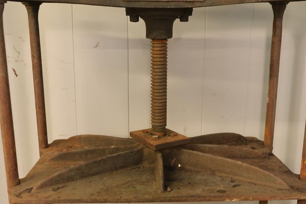 Sanborn Manufacturing Company Cast-Iron Book Embossing Press Frame. Features a cast-iron frame with a hand-operated wheel and screw mechanism. Includes a sturdy multi-shelf construction with a labeled plaque indicating the manufacturer. Notable surface wear and rust consistent with age and use. Pickup only.