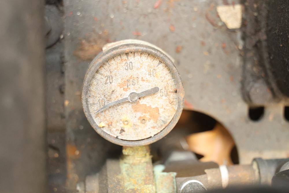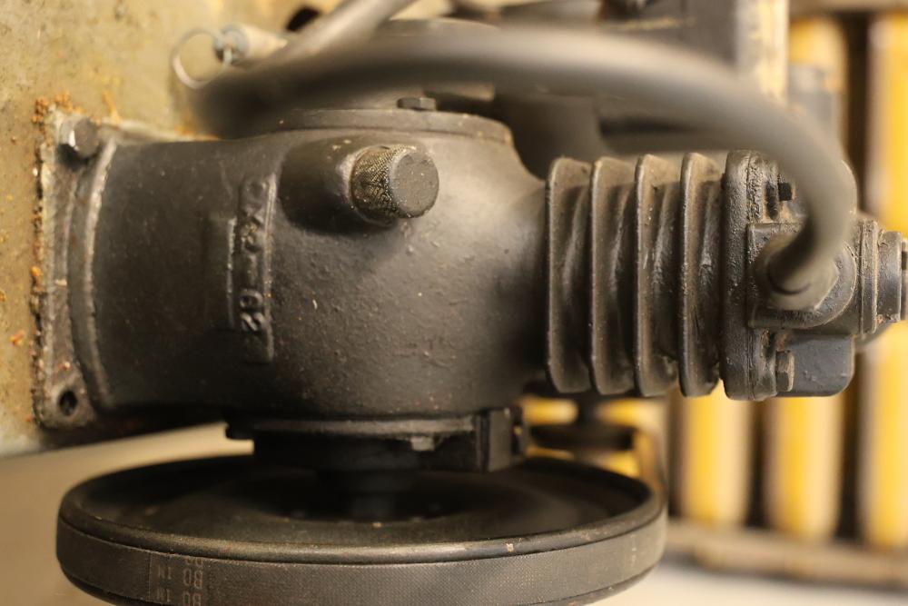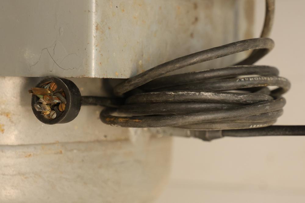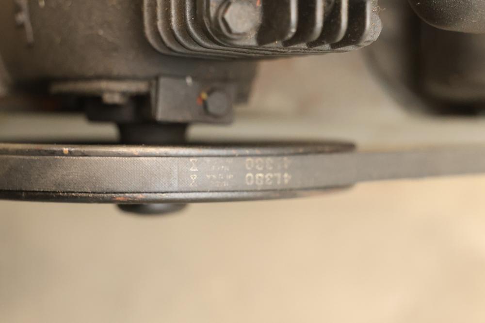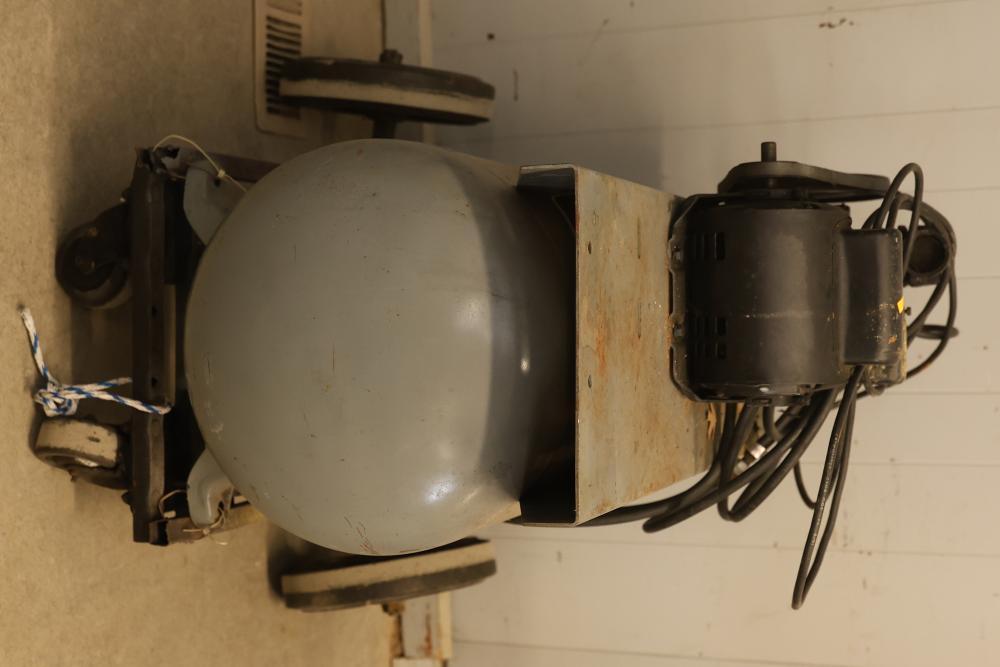 Portable Air Compressor with General Electric 5KC43MG1B Belt Drive Motor. Features a 0.5 HP motor operating at 1725 RPM with a 115/230V single-phase configuration and a 56 frame size. Capable of up to 60 PSI. Includes a wheeled base for mobility and a visible pressure gauge. Shows signs of wear and use. Pickup only.