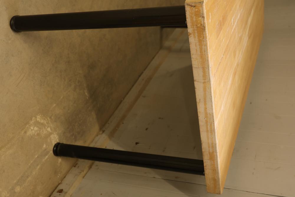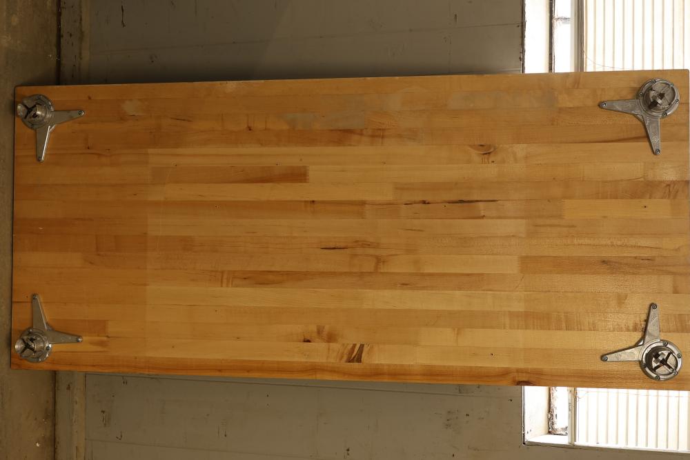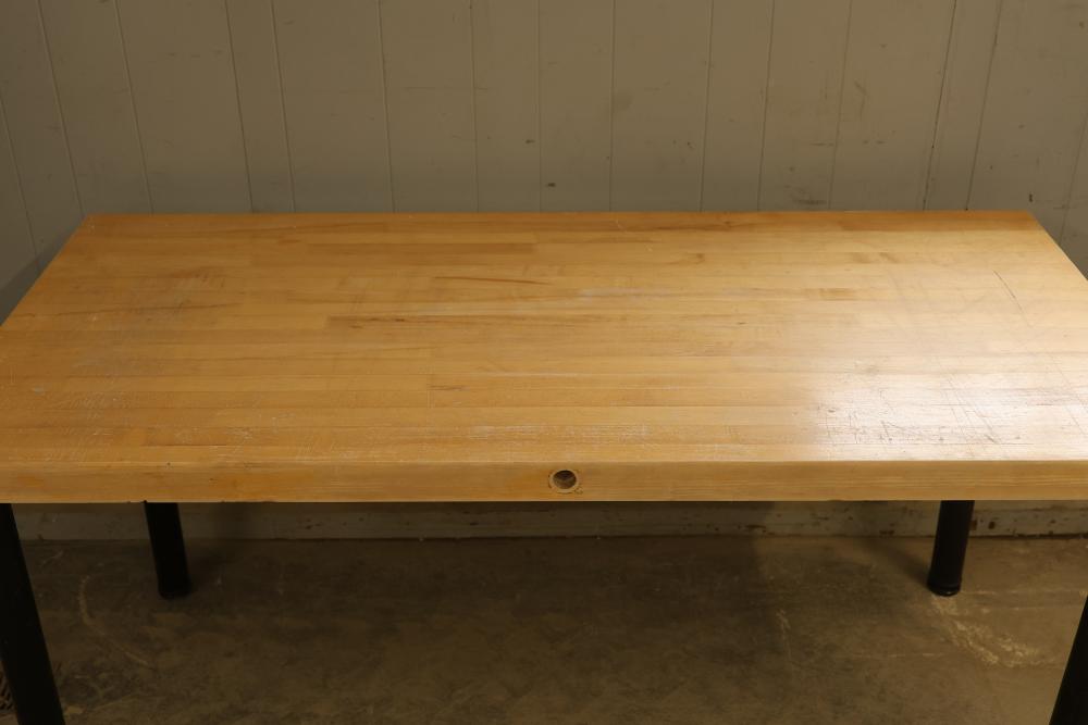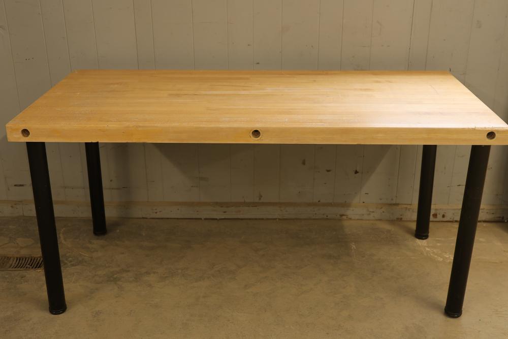2 Butcher Block Tables with Legs, 64 x 30 x 30 Inches Each. Tables feature sturdy butcher block tops and attachable black metal legs for strong support. Ideal for durable workspace use or similar applications. Each table is 64 inches long, 30 inches wide, and 30 inches high. Pickup only.