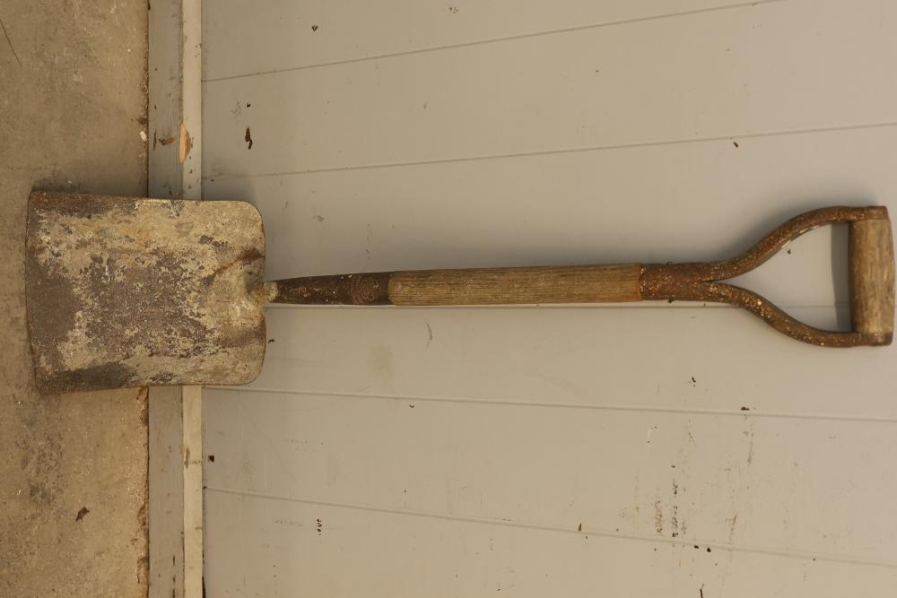 Hand Tools Set with 3 Short-Handled Shovels. Each shovel features a wooden handle with a metal blade. The set includes two shovels with square blades and one with a round blade. Signs of wear and rust are present, indicating prior use. Ideal for practical outdoor or garden tasks. Pickup only.