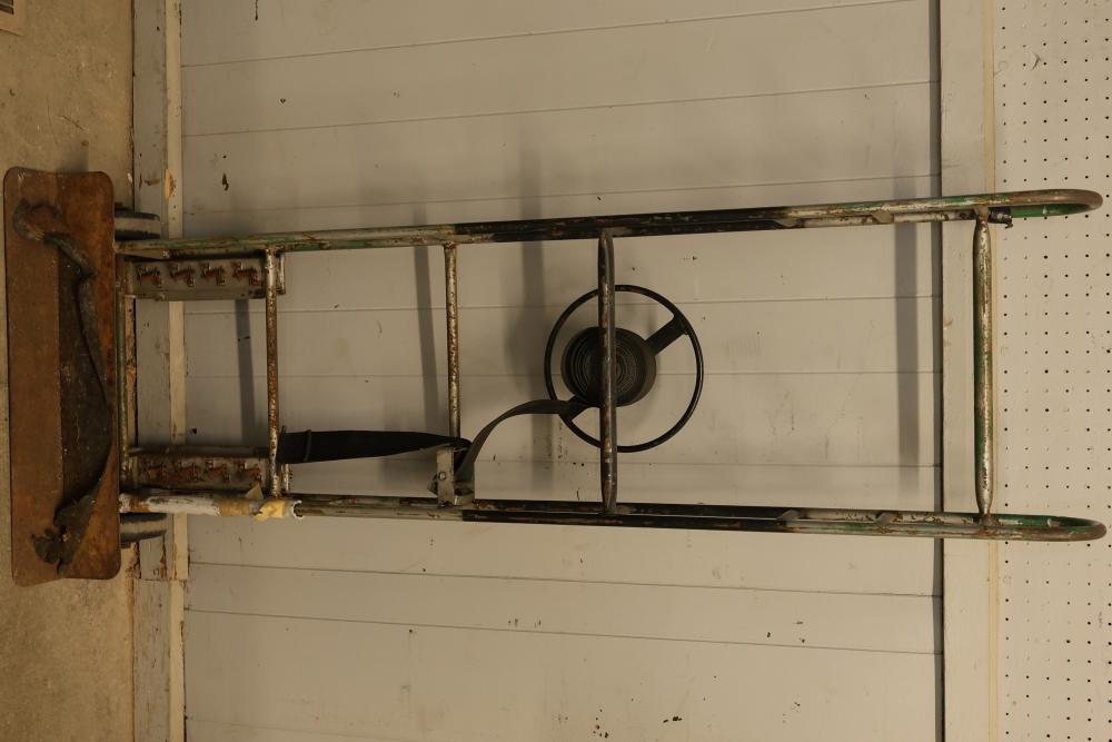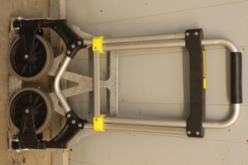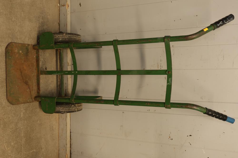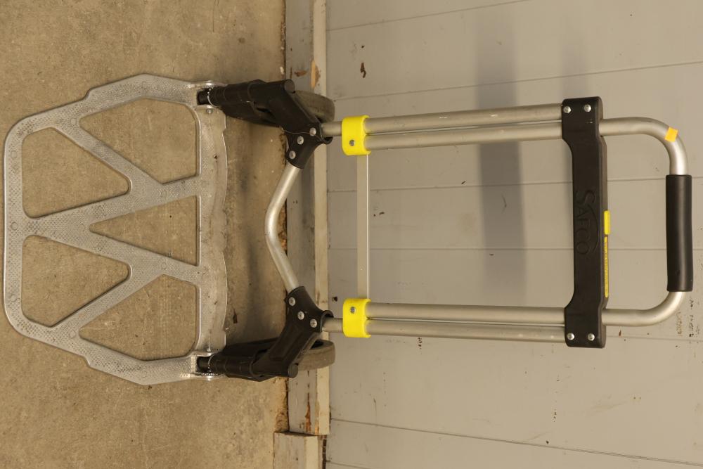 Material Handling Equipment consisting of 3 Hand Trucks, Including a Safco Collapsible Hand Truck. Includes a Safco collapsible hand truck with a lightweight aluminum frame and foldable platform for compact storage, one green steel hand truck with solid rubber wheels, and one traditional-style steel hand truck with a built-in securing strap. Functional for various transport needs. Pickup only.