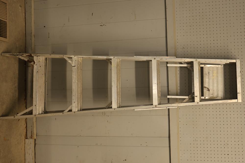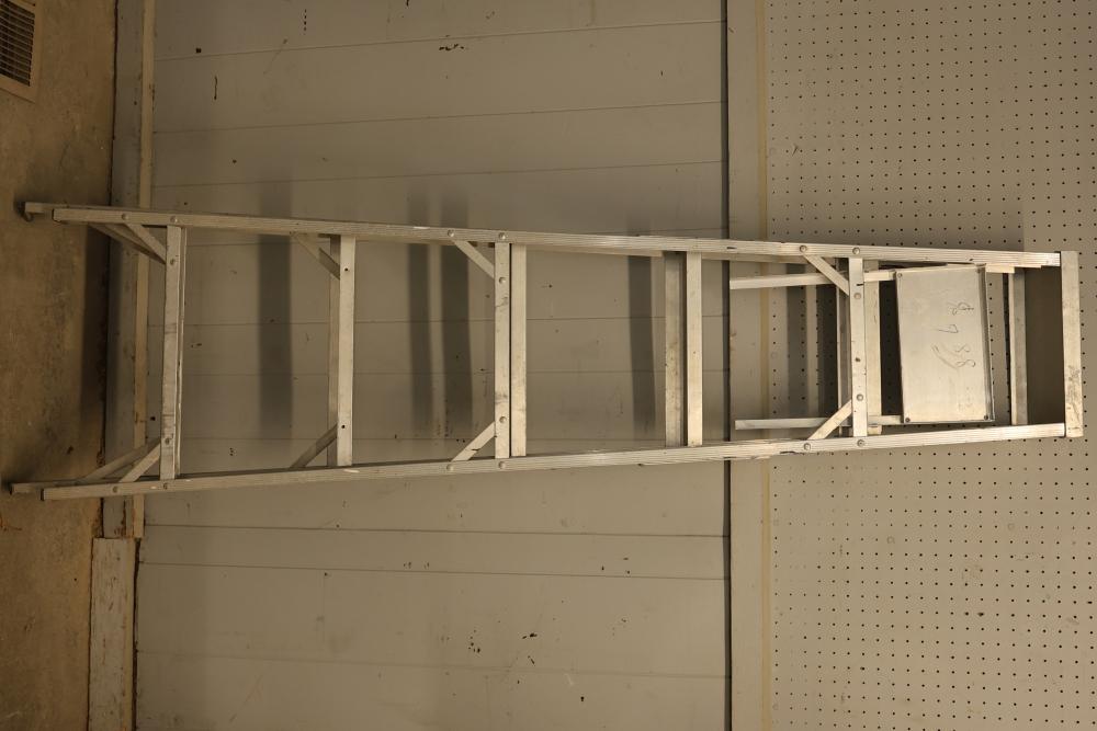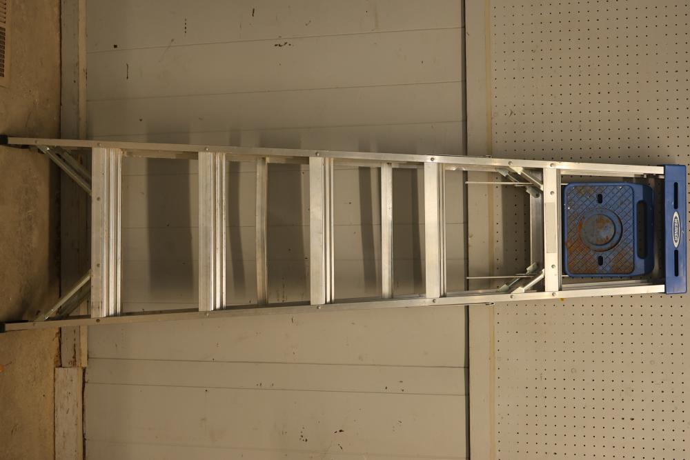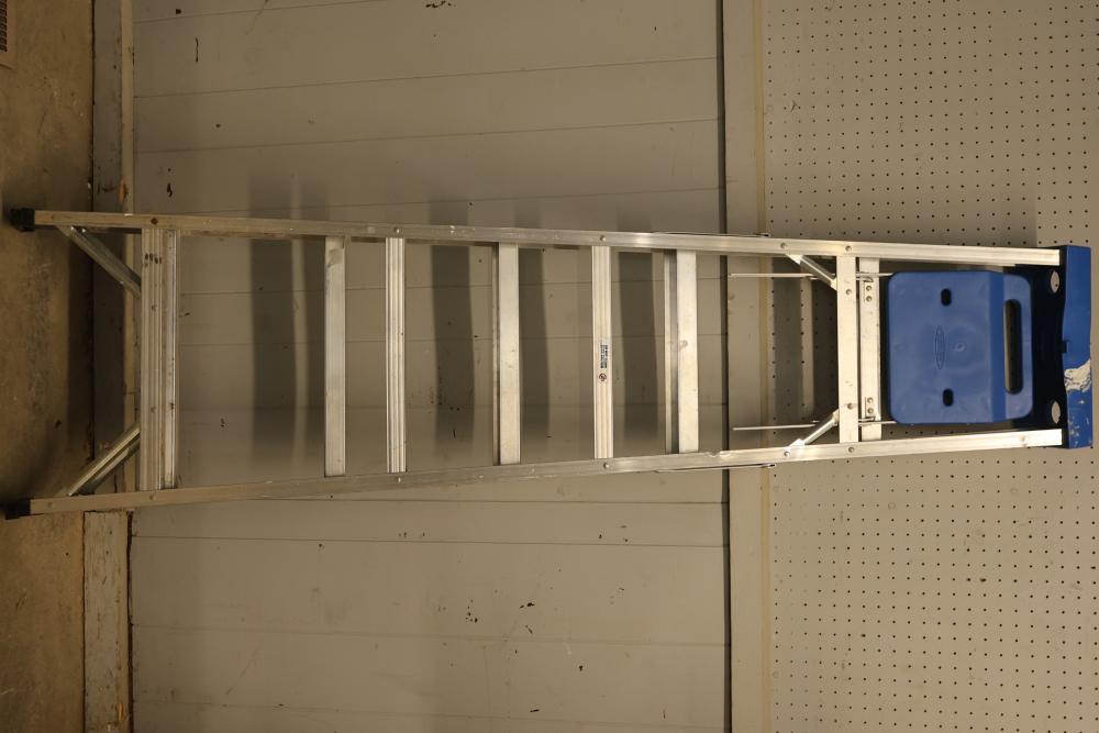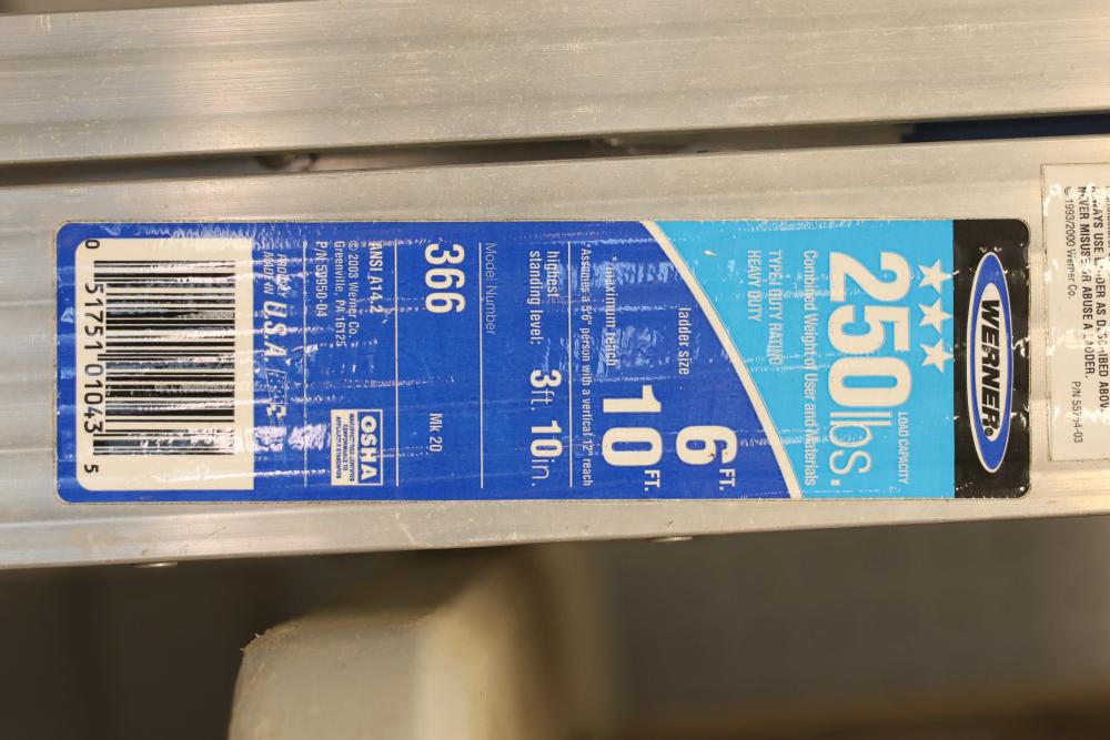 Werner Model 366 6 Foot Steel Ladder and Unmarked 6 Foot Steel Ladder. The Werner ladder has a 250 lb load capacity and features labels indicating ANSI compliance. The other ladder is unmarked but appears to be of similar construction and size. Both items show signs of use. Pickup only.