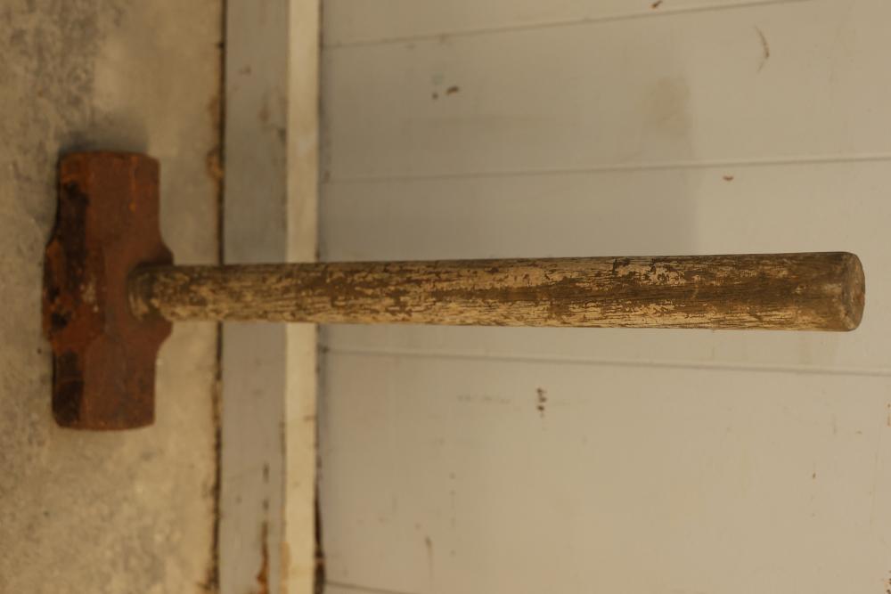 Striking Tools Including 2 Pickaxes and 1 Sledgehammer. Includes a sledgehammer with a wooden handle and two pickaxes with wooden handles. All tools show signs of previous use and wear consistent with their age. Pickup only.