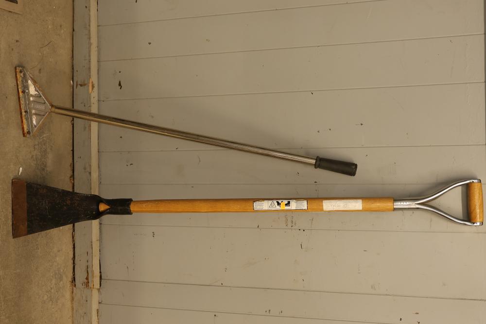 Landscaping Tools Set Including Shovels, Hoes, and Scrapers. Includes a variety of tools such as long-handle hoes, a T-handle tool, scrapers, and digging implements, each with wood or metal handles. Ideal for gardening or landscaping purposes. Pickup only.