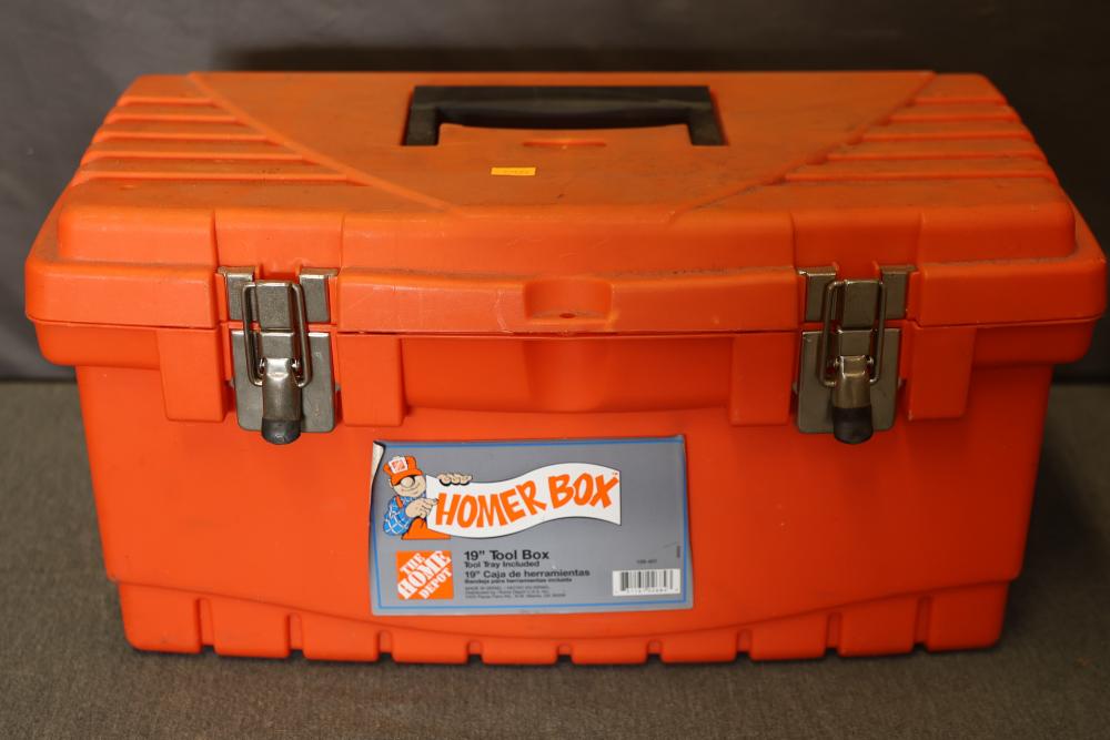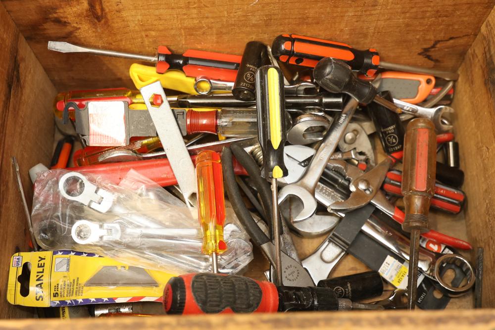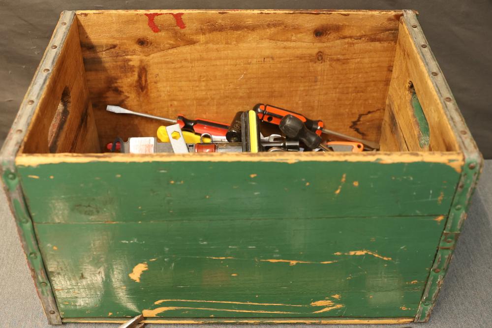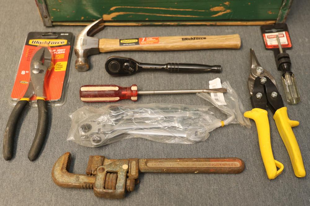 Hand Tools Lot Featuring 1 Toolbox and 1 Wooden Crate Filled With Tools. Includes a toolbox with assorted wrenches, sockets, screwdrivers, and other tools. The lot also features a wooden crate containing hand tools such as hammers, pliers, ratchets, and more. Both containers are included in the sale. Pickup only.