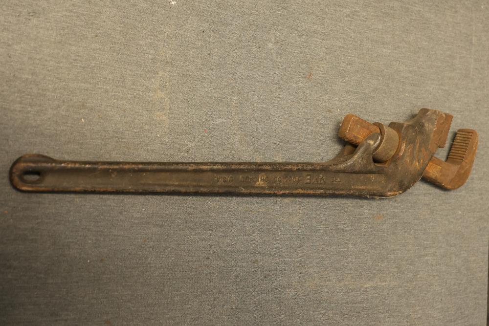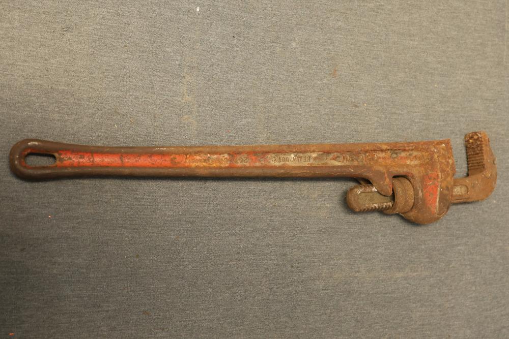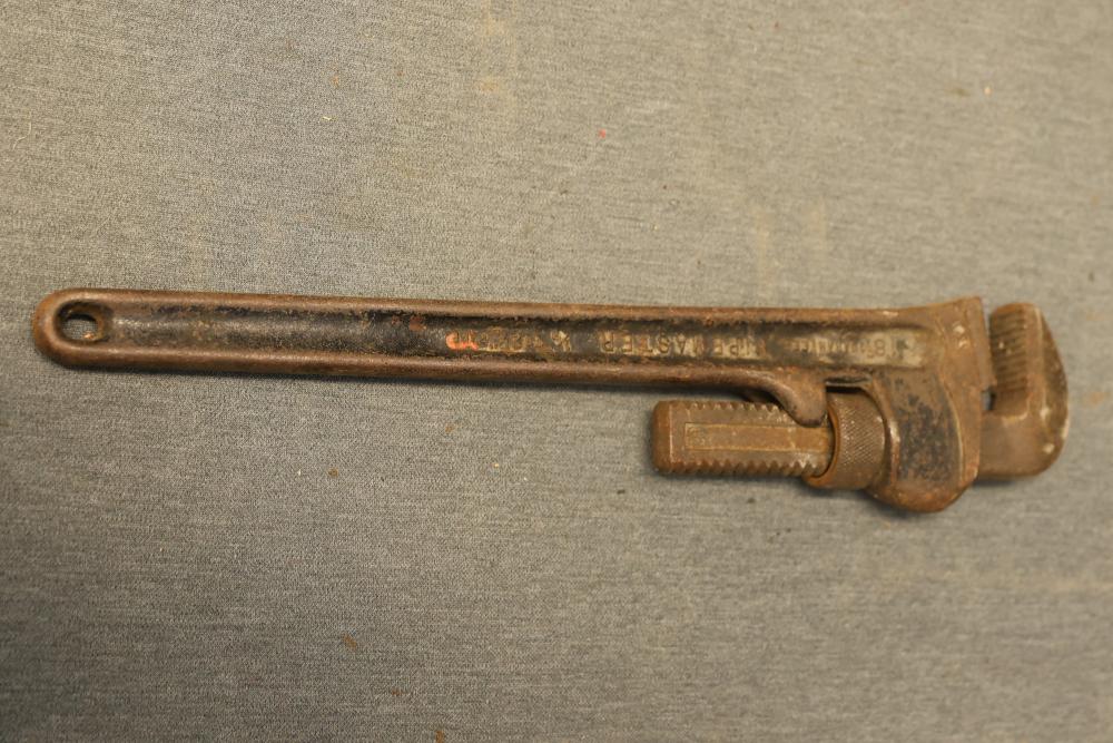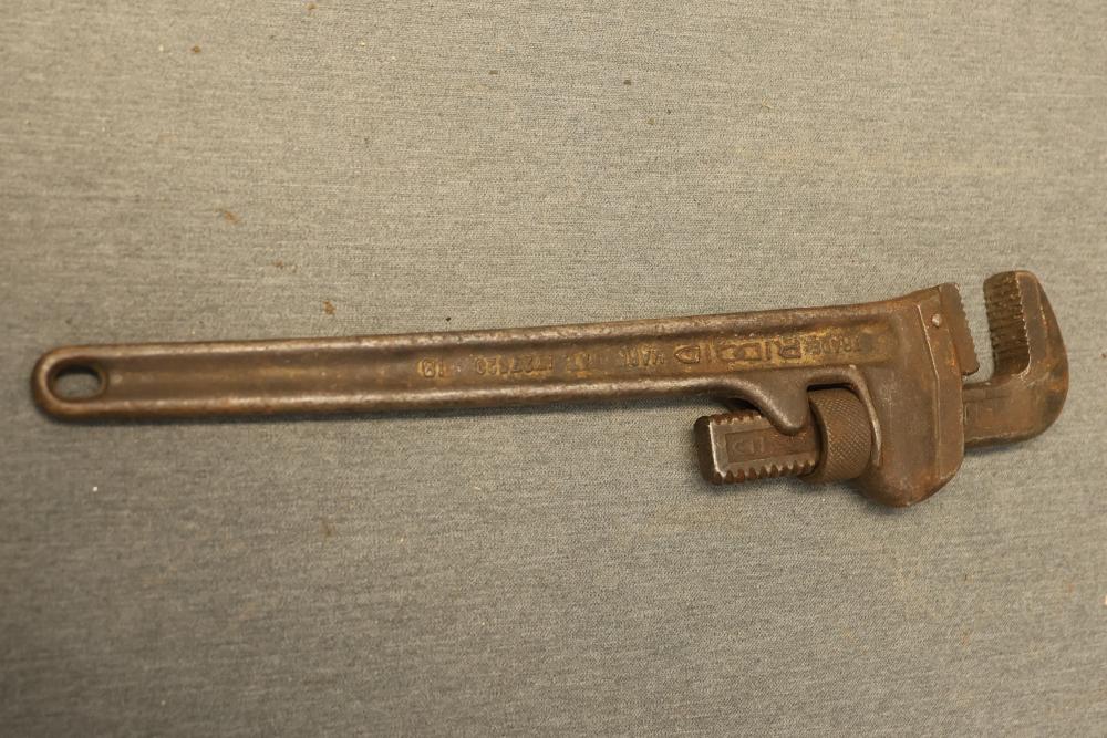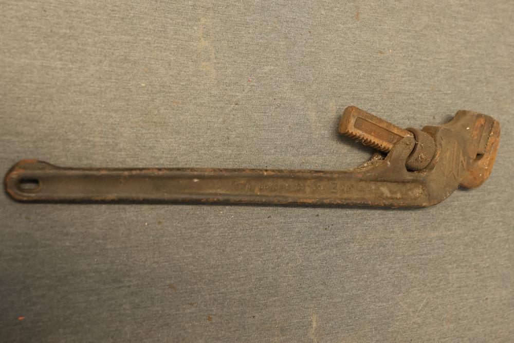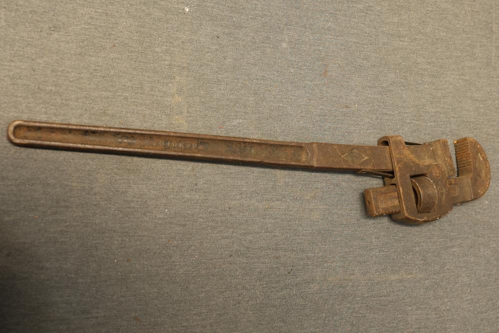Pipe Wrench Set. Includes six metal pipe wrenches with varying lengths and wear. Wrenches show substantial rust and signs of use but appear solid and intact. Pickup only.