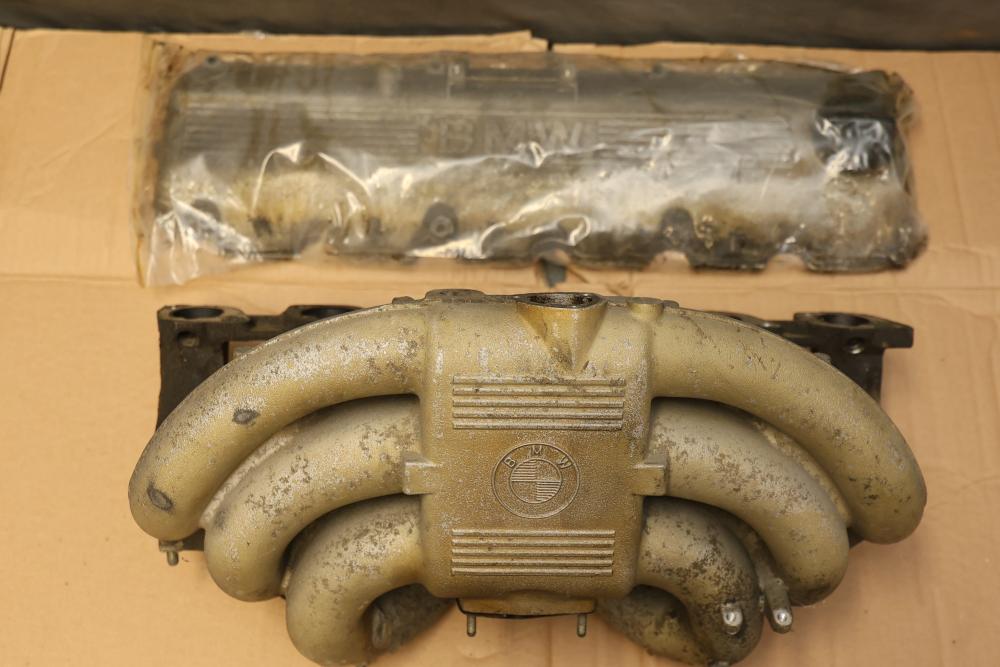 BMW E30 3-Series M20B25 Intake Manifold and Engine Valve Cover in used condition. Both components show wear and discoloration consistent with prior use. The intake manifold features the BMW emblem and stamped identifying numbers. The valve cover is packaged in plastic and labeled with a visible BMW logo. Suitable for restoration or replacement projects. Pickup only.