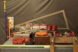 Toolboxes, Tools, Doorknob Sets, and Accessories. Includes five toolboxes (various tools inside), doorknob sets with some pieces missing, a Master Lock with key, Harris-Dracon TS21 Telephone Test Set, Black and Decker 71960 screwdriver bit organization case (some bits included), tool holsters, a lightbulb changer, and a moving dolly. Pickup only.