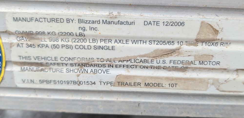 2007 Blizzard Model 10T Snowmobile Trailer; Vin: 5PBFS10197B001534, Title on hand.
