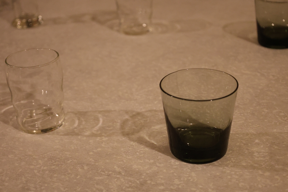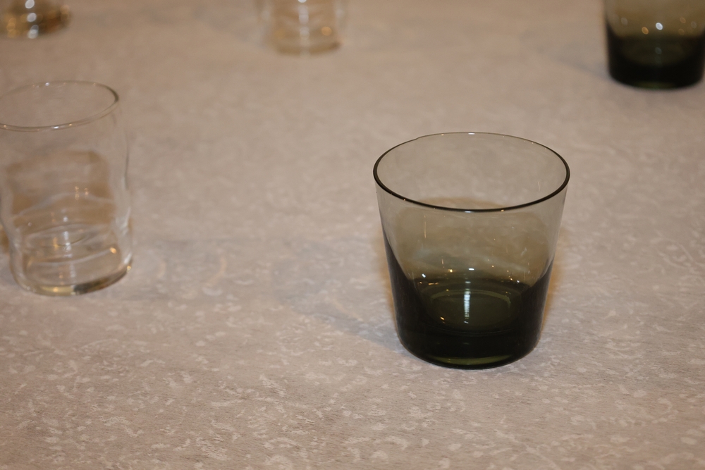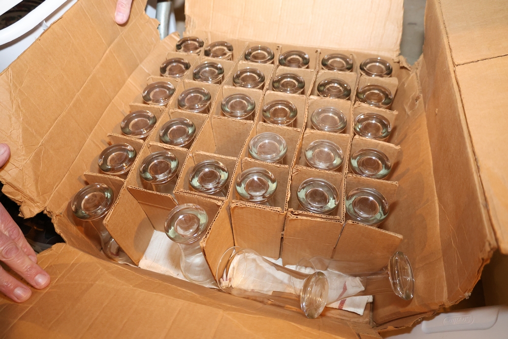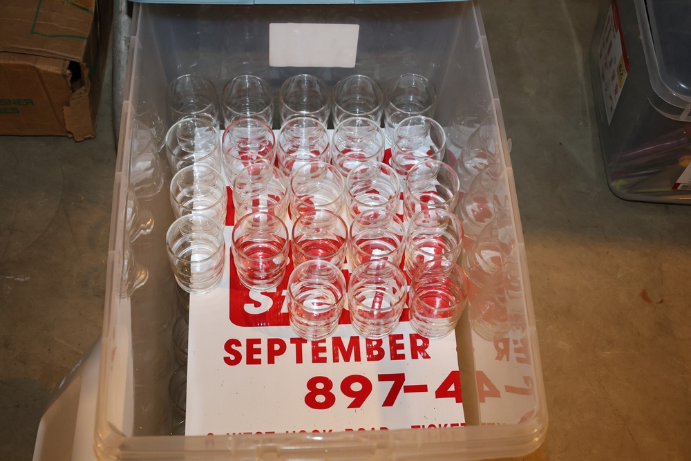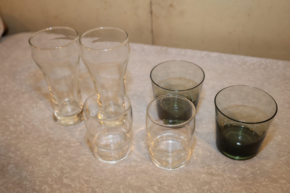 Drinking Glasses, 30 Black/Green Drinking glasses, 60 8oz. Juice Glasses, 35 10oz. Beer Glasses.