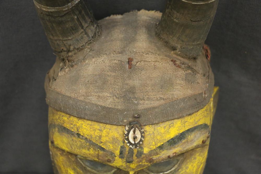 A cap with horns sits on top of this mask of Jine, a bush spirit with human facial features and transparent glass eyes. A cowrie shell surrounded by beads is attached to the forehead, and there are painted facial scarifications. H 29.5 in. Wood, paint, horns, beads, cowrie shell, glass, cloth, metal. Page number 147 figure 172 in the book: The colorful Sogo Bò Puppets of Mali, Mary Sue Rosen Paul, Paul Peter Rosen.