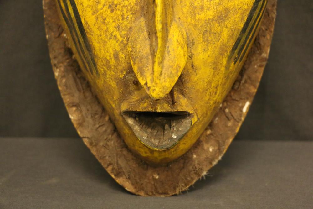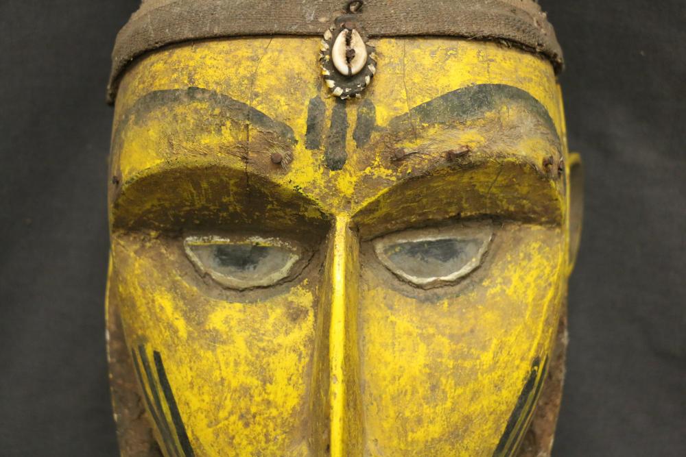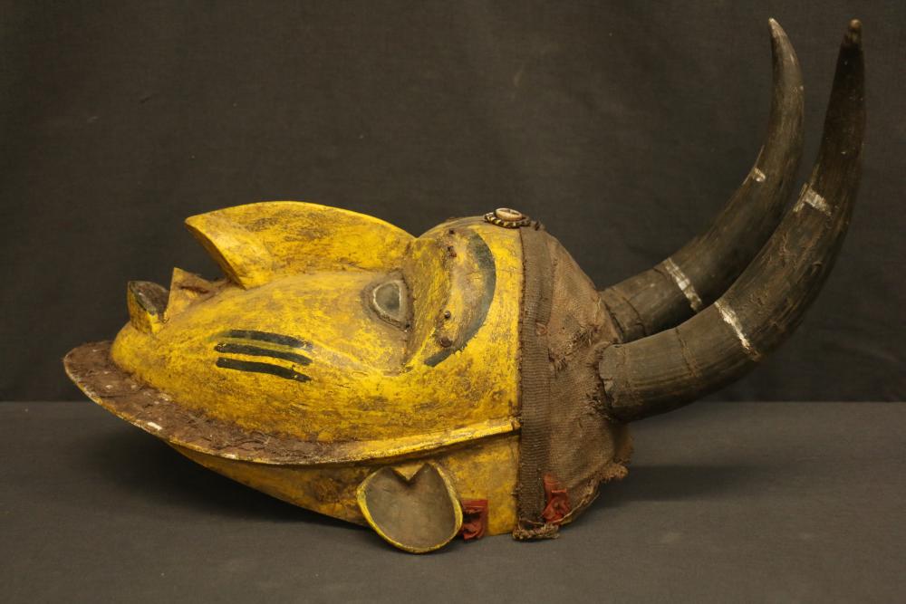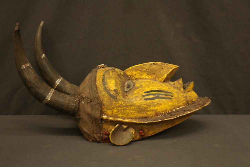 Over 170 lots of African art. Items include women's indigo wraps. Marka/Dafing people, Burkina Faso; Dan headdress, Liberia; large carved Mali-style African drum; old currency spears. Tuareg people, Mali & Niger; rod puppet head of Dankalankule, the Oryx antelope; Bandaka “jellyfish” form currency. Mambila & Chamba people; pendants, Coptic Christian people, Ethiopia; leg band. Mongo & Konda people, Congo; Koranko body mask, Guinea, Sierra Leone; abstract bogolan textile. Bamana people, Mali; ceremonial snake-form bayonet/knife. Lobi people, Burkina Faso; ceremonial blacksmith’s hammer, Northern Nigeria; wedding blanket. Tuareg people, Niger & Mali; West African heddle pulleys. (A) Senufo people, Ivory Coast; maternity figure. Lokko people, Sierra Leone; male Chi Wara head crest mask. Bamana people, Mali; rare Asafo flag bearer/dancer's skirt. Fante people, Ghana & more. Items are located in Pleasant Valley, NY.