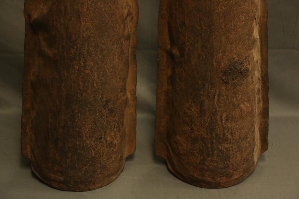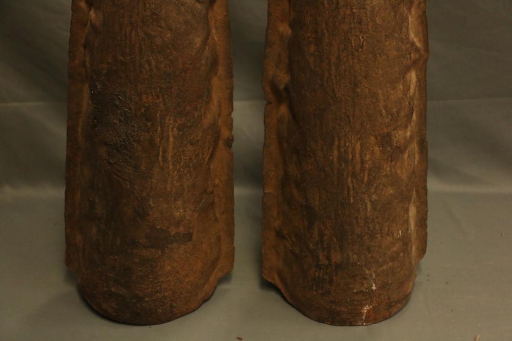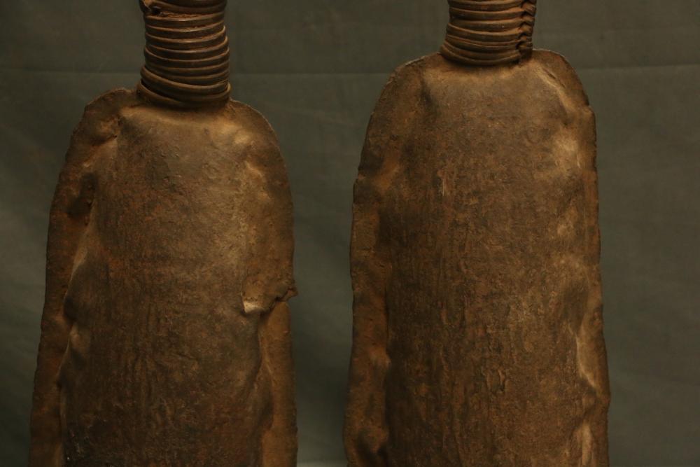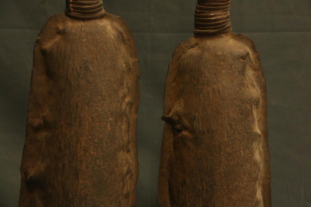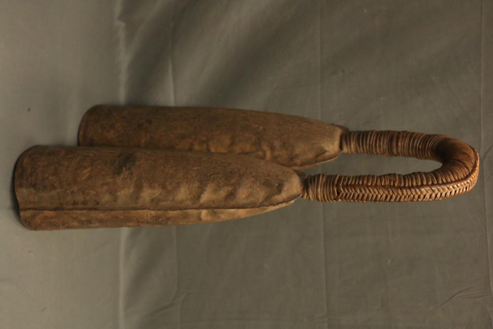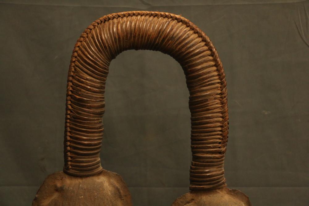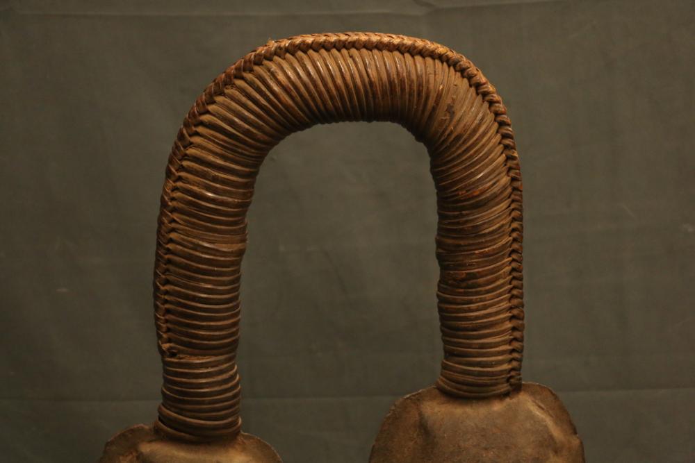 CEREMONIAL DOUBLE GONG. Bamum people, Cameroon. Large double gongs such as this are important emblems of the Kwifoyn Society composed of elite members of the royal court. The arched handle is wrapped with intricately woven straps of leather-like raffia. The bells a made from hand forged iron. The gong was used during funerals for members of the Kwifoyn Society, other solemn occasions, and to announce the arrival of the King. Iron, raffia. H 36.5in W 20in.