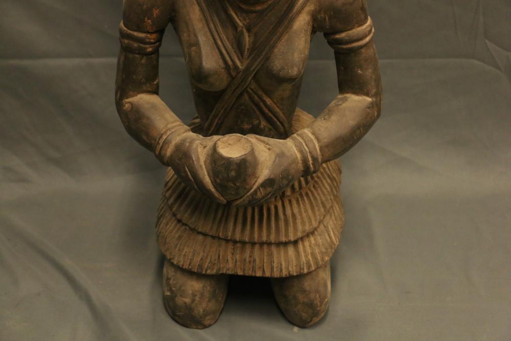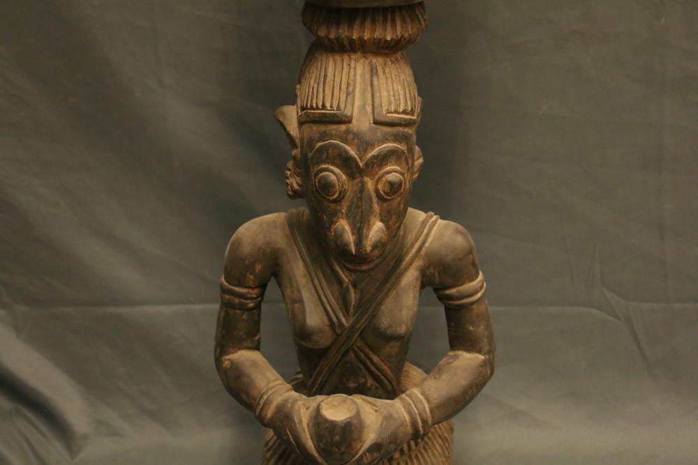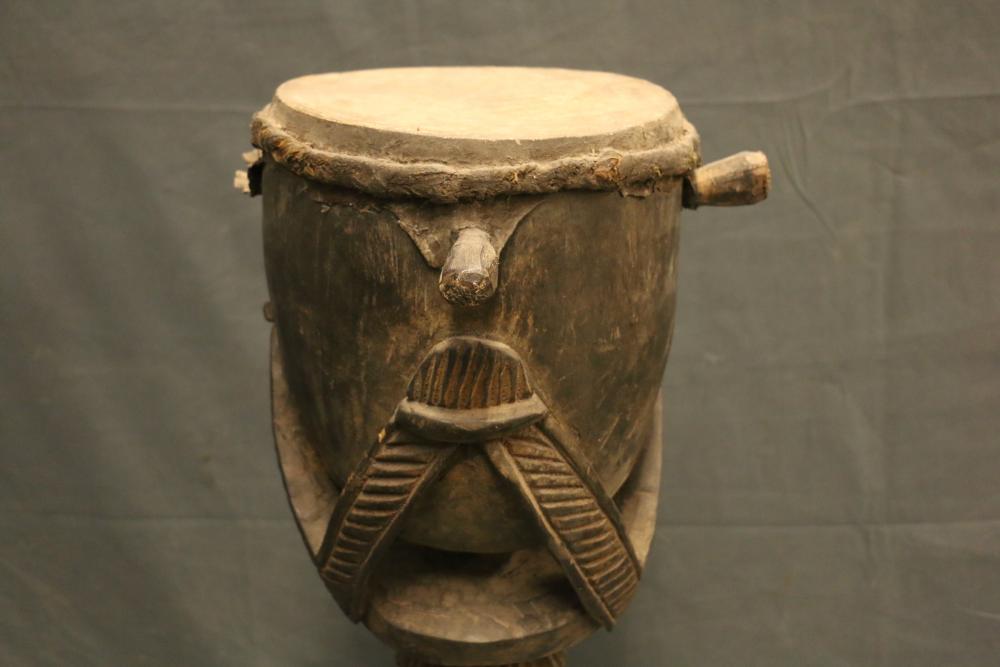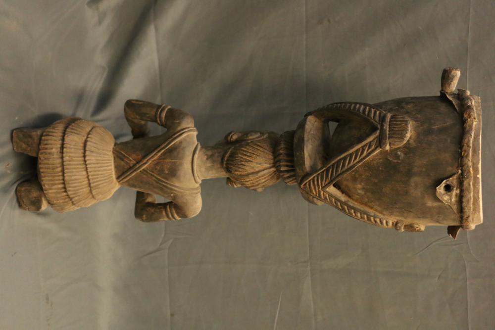 Over 170 lots of African art. Items include women's indigo wraps. Marka/Dafing people, Burkina Faso; Dan headdress, Liberia; large carved Mali-style African drum; old currency spears. Tuareg people, Mali & Niger; rod puppet head of Dankalankule, the Oryx antelope; Bandaka “jellyfish” form currency. Mambila & Chamba people; pendants, Coptic Christian people, Ethiopia; leg band. Mongo & Konda people, Congo; Koranko body mask, Guinea, Sierra Leone; abstract bogolan textile. Bamana people, Mali; ceremonial snake-form bayonet/knife. Lobi people, Burkina Faso; ceremonial blacksmith’s hammer, Northern Nigeria; wedding blanket. Tuareg people, Niger & Mali; West African heddle pulleys. (A) Senufo people, Ivory Coast; maternity figure. Lokko people, Sierra Leone; male Chi Wara head crest mask. Bamana people, Mali; rare Asafo flag bearer/dancer's skirt. Fante people, Ghana & more. Items are located in Pleasant Valley, NY.