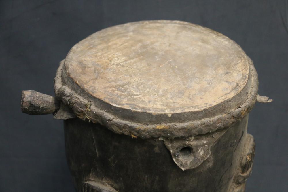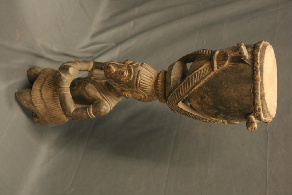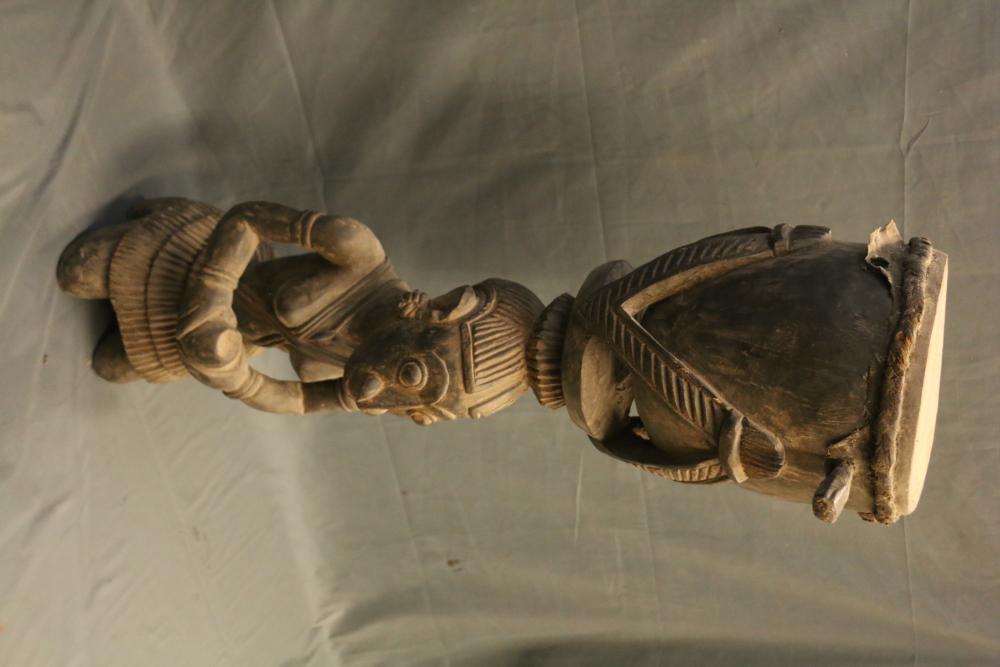 Drum affixed to head of woman holding a drinking cup. Purchaed in the 2nd quarter of the 20th C, from Baga Guinee, Africa.