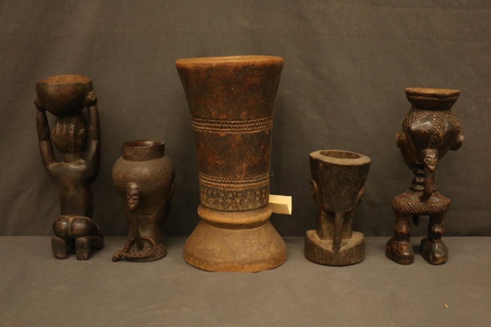 Five figural pcs African art incl marked "Nyam West Tanzania Mortar", all with intricate carvings. Largest is 13.5"T.