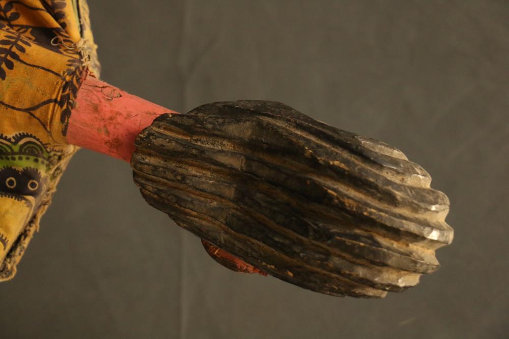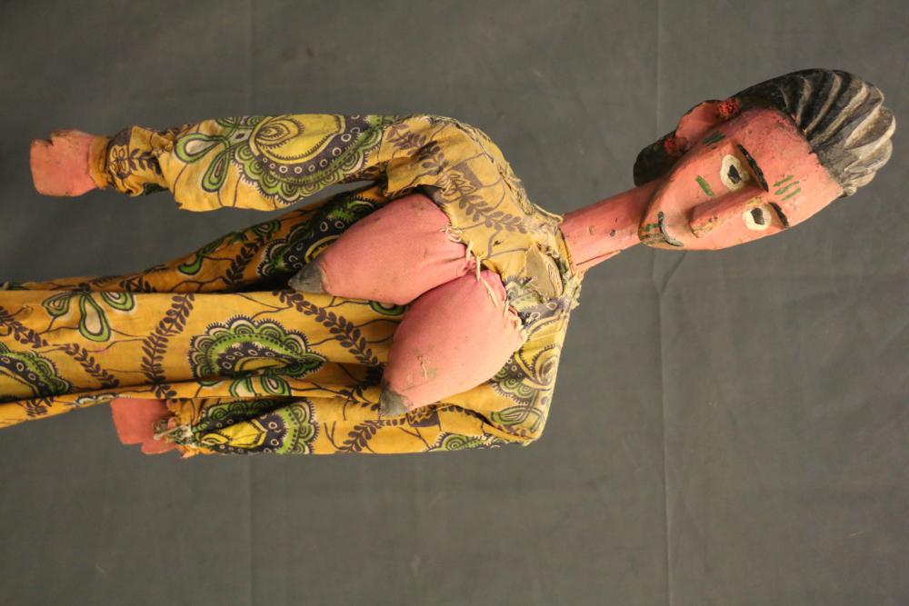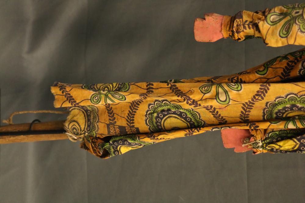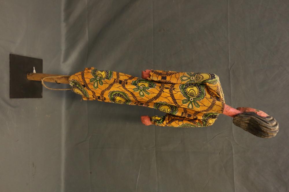 The cotton print robe worn by this tall rod puppet figure of a beautiful woman covers strings that move her articulated arms. The appended, protruding bosom made of cloth is an unusual feature of this puppet. H 44 in. Wood, paint, cloth, metal, string. Page number 153 figure 179 in the book: The colorful Sogo Bò Puppets of Mali, Mary Sue Rosen Paul, Paul Peter Rosen.