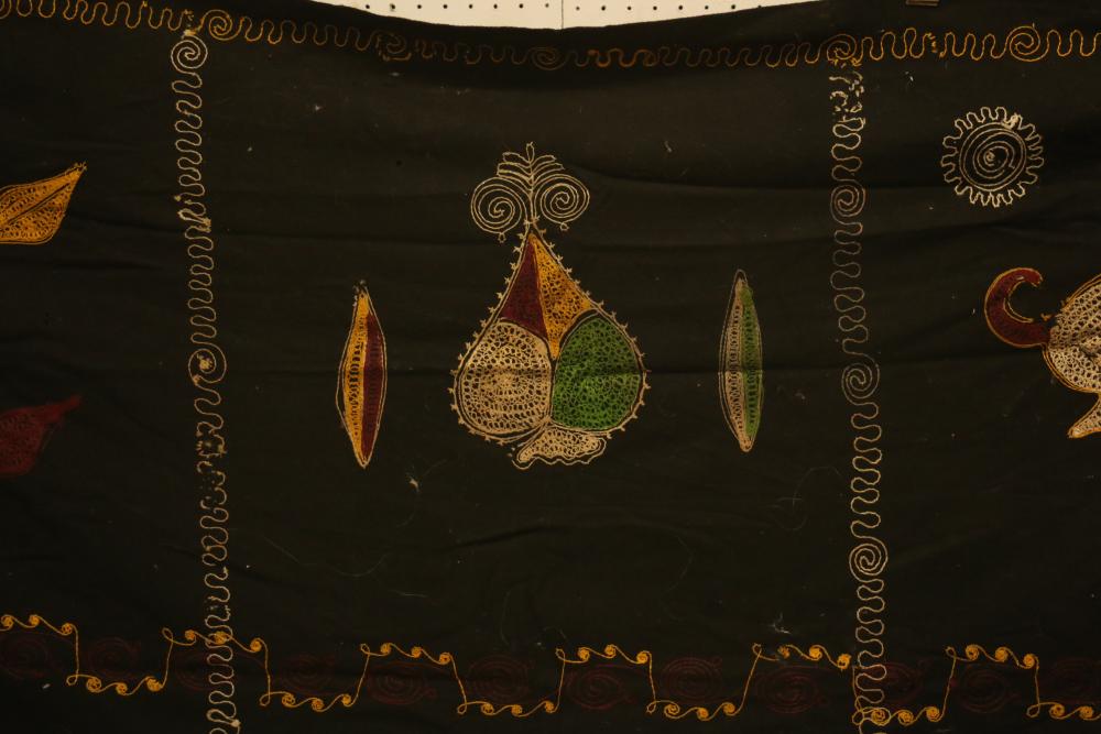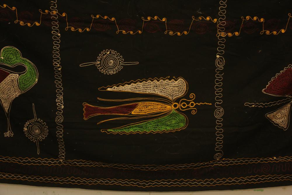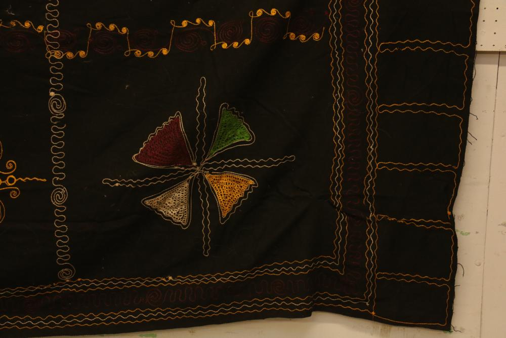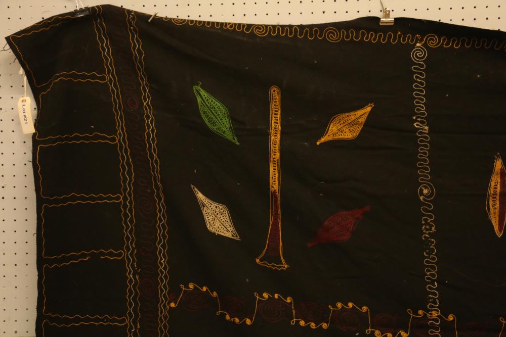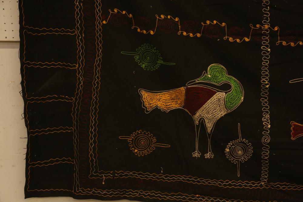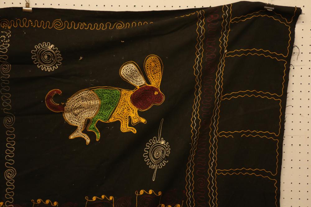 CEREMONIAL AKUNINTAN (“OHENE AKUNINTOMA”) CLOTH. Ashanti people, Ghana. This very rare textile belonged to the wife of a Paramount Chief. A number of towns and villages report to a Paramount Chief who in turn reports to the King. Among the embroidered symbols representing the authority of the wearer is that of the Sankofa bird who has a habit of repeatedly looking over its back. It symbolizes wisdom gained from past experience. The grid pattern of the designs is typical for an Akunintan textile. This cloth was created by a master of this embroidery technique, Opanin Akwasi Bamieh in Kumasi, the Ashanti capital city. It is in excellent museum quality condition despite an estimated age of at least 50 years when it was collected in 2005 in Kumasi. Exhibited at the Pen and Brush Gallery New York 2006. Black felt textile with embroidered multicolored designs. 100in x 55in.