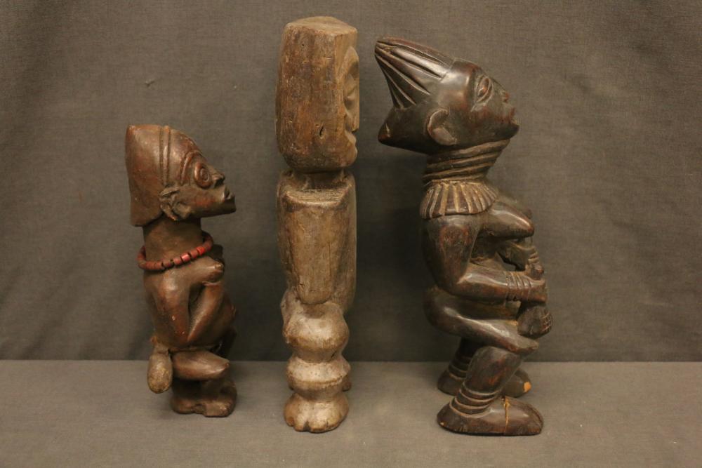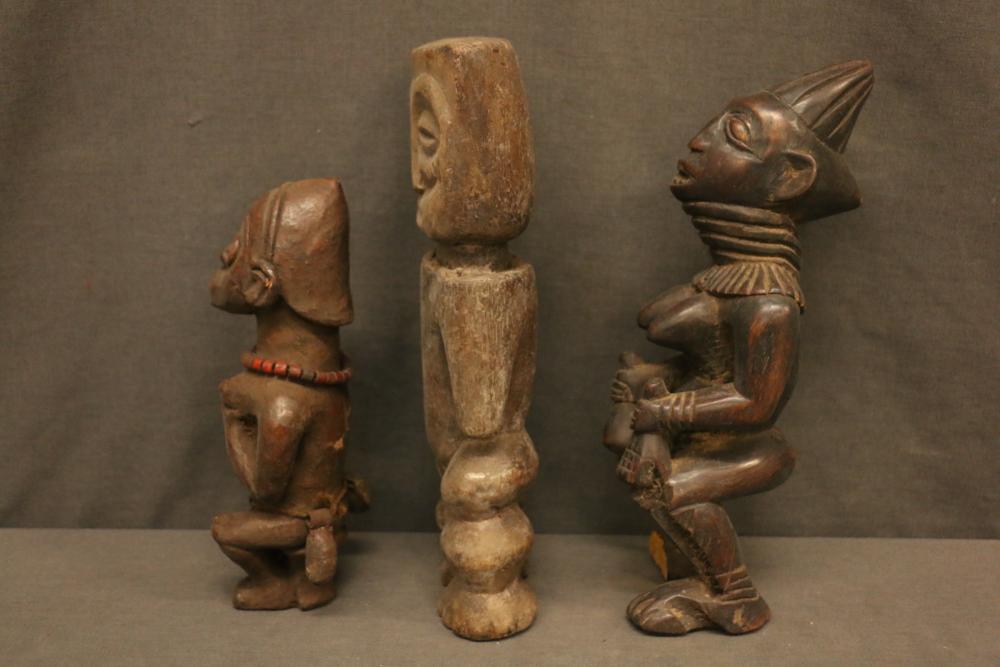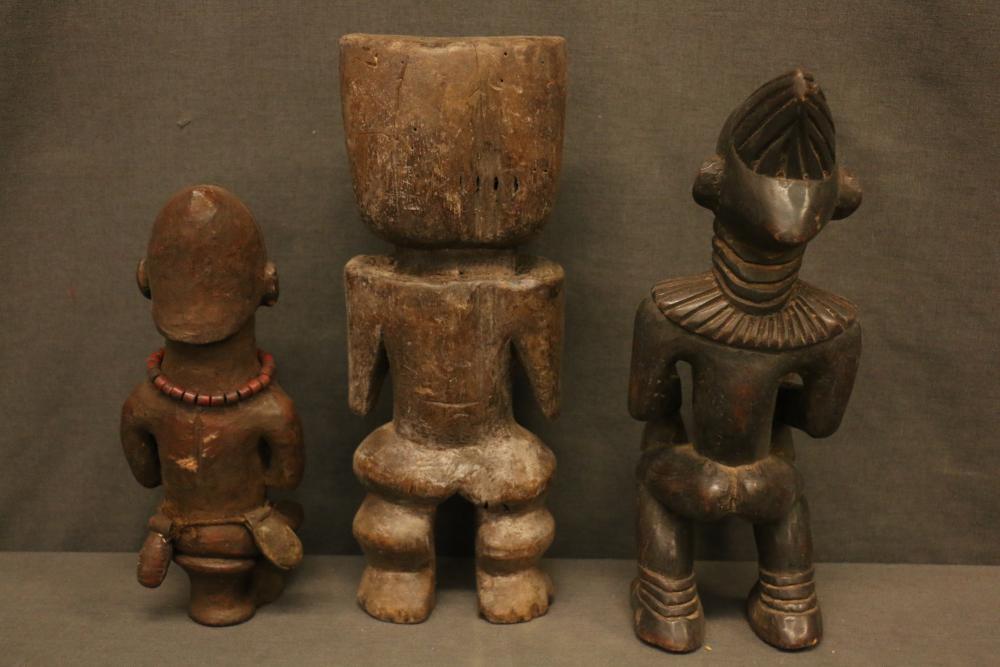 Over 170 lots of African art. Items include women's indigo wraps. Marka/Dafing people, Burkina Faso; Dan headdress, Liberia; large carved Mali-style African drum; old currency spears. Tuareg people, Mali & Niger; rod puppet head of Dankalankule, the Oryx antelope; Bandaka “jellyfish” form currency. Mambila & Chamba people; pendants, Coptic Christian people, Ethiopia; leg band. Mongo & Konda people, Congo; Koranko body mask, Guinea, Sierra Leone; abstract bogolan textile. Bamana people, Mali; ceremonial snake-form bayonet/knife. Lobi people, Burkina Faso; ceremonial blacksmith’s hammer, Northern Nigeria; wedding blanket. Tuareg people, Niger & Mali; West African heddle pulleys. (A) Senufo people, Ivory Coast; maternity figure. Lokko people, Sierra Leone; male Chi Wara head crest mask. Bamana people, Mali; rare Asafo flag bearer/dancer's skirt. Fante people, Ghana & more. Items are located in Pleasant Valley, NY.