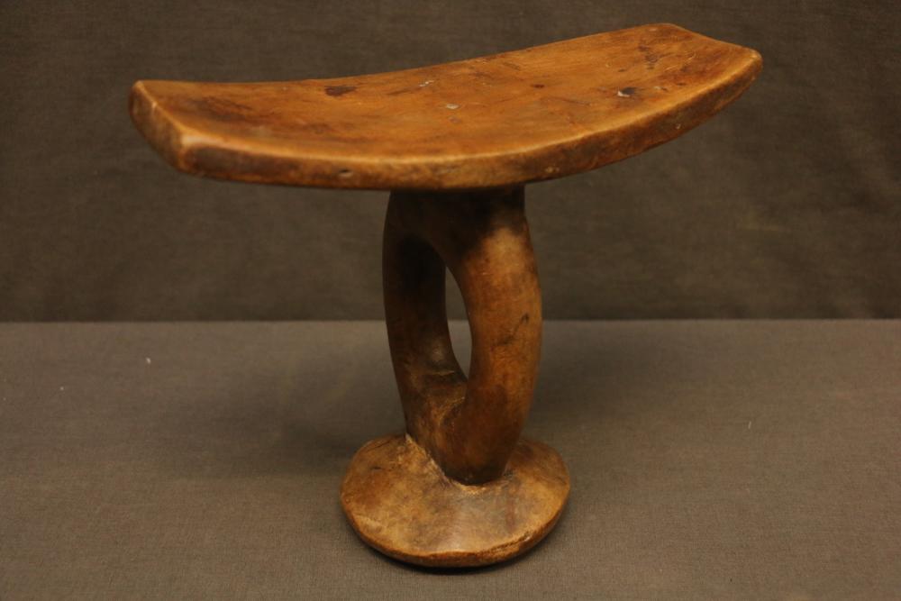RARE EAST AFRICAN HEADRESTS. Each hand carved from a single block of wood. Note the patina and wood grain. (A) Dinka people, Uganda. Rare form shaped like a two-headed horse on tripod support. Braided leather thong for carrying over shoulder. Wood. 19.5in. wide, 8.75in. high. (B) Me’en people, Ethiopia. Slightly concave platform set on an oval hollow pedestal rising from a round base. Elegant form juxtaposing rectangular, oval and rounds shapes. Wood. 9in. wide, 7.75in. high.