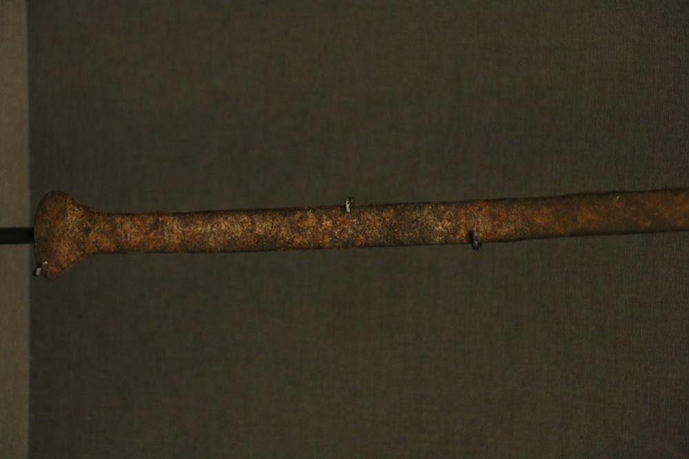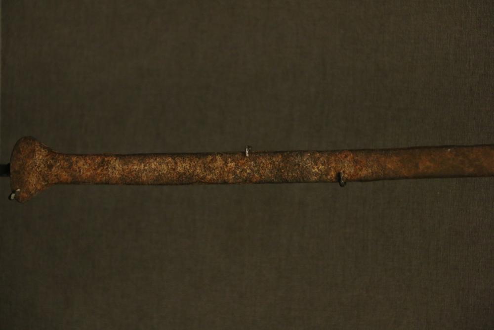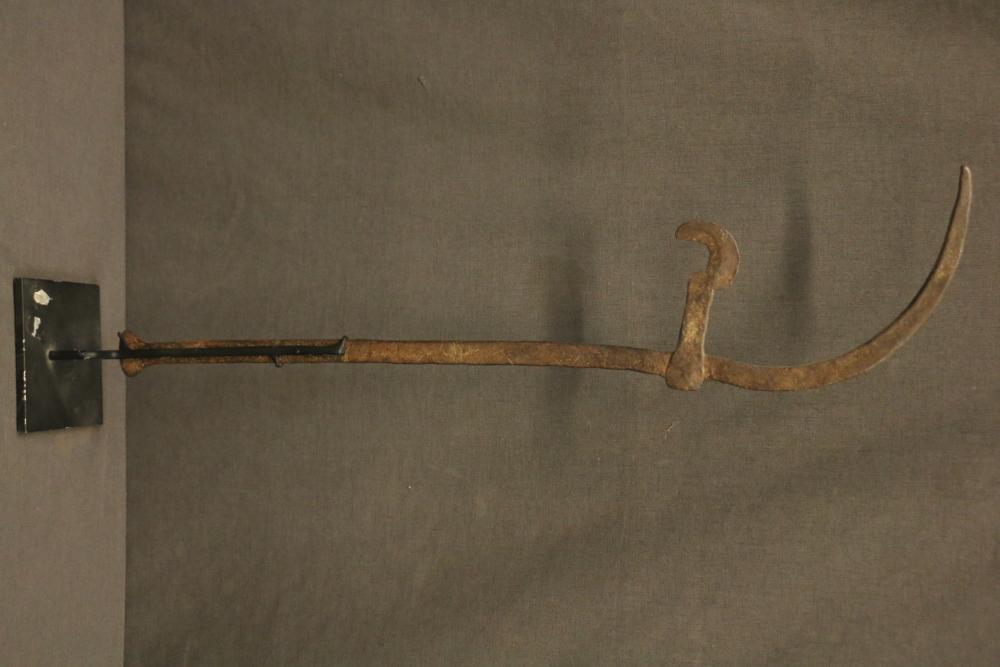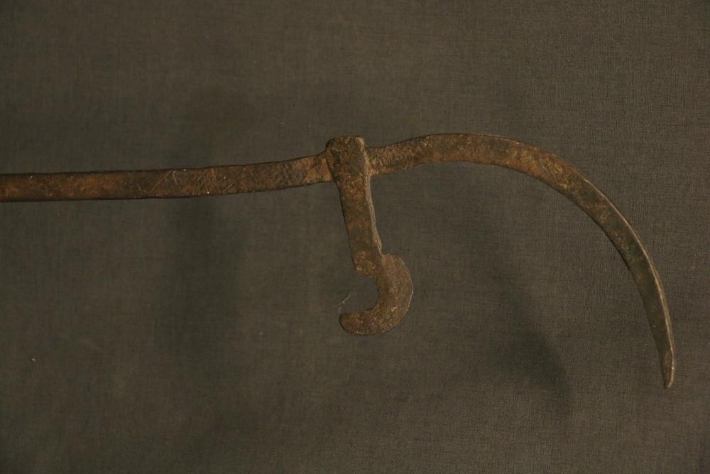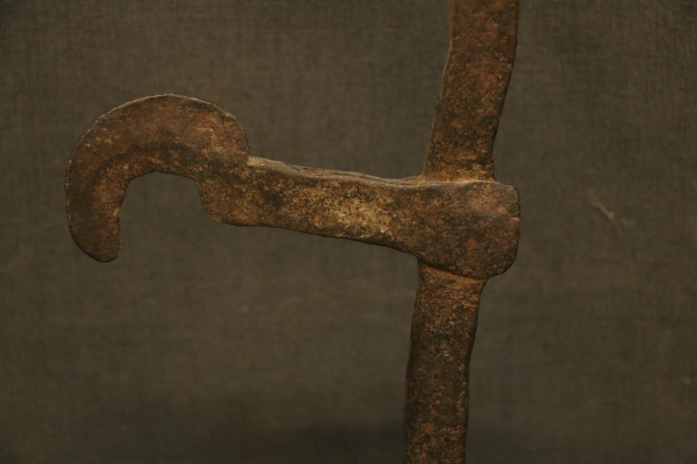 F-SHAPED THROWING KNIFE. Kirdi people, Cameroon. Throwing knifes like this were thrown side-arm, rotating around their center of gravity. On custom base. Ex Martial Bronsin Collection Brussels Belgium Dated late 19th or early 20th century. On custom base. Iron. L 22in.